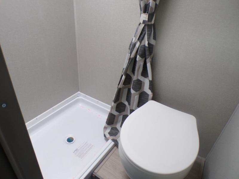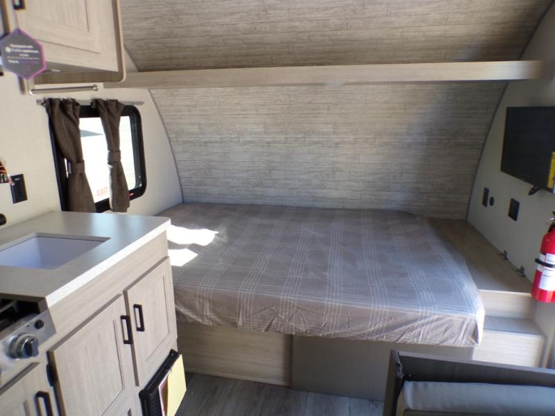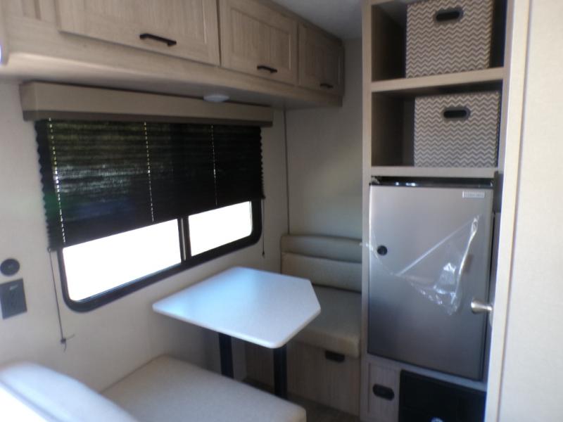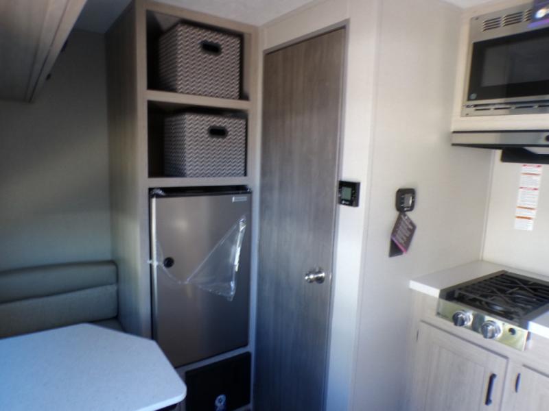 Lightweight camping is easier than you think with this travel trailer in tow! The front 54" x 74" queen bed will provide a great night's rest each night, while your overnight guest takes the booth dinette. There is a handy shelf above the front bed for your belongings plus additional bedroom storage. A private bath includes a 24" x 32" shower and a toilet with a mirror behind it so you can freshen up each day. You'll also find a two burner cooktop and microwave oven to make meals each day plus a 3.3 cu. ft. 12V refrigerator for food storage!