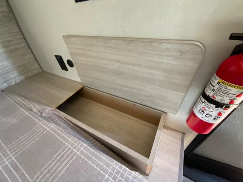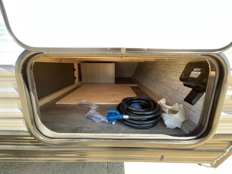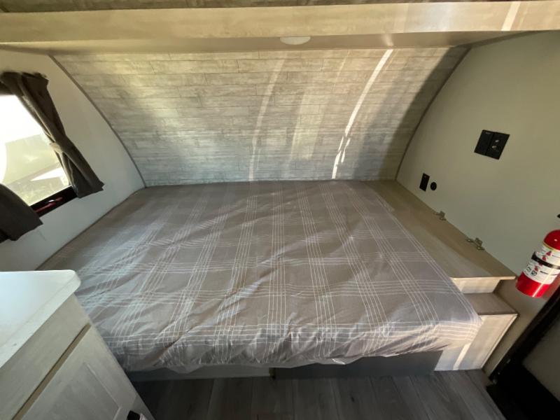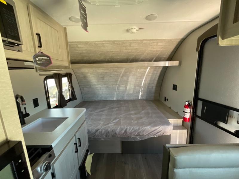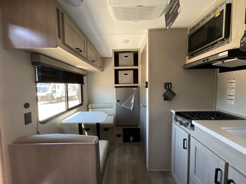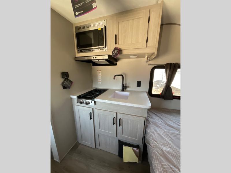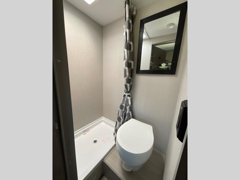 Lightweight camping is easier than you think with this travel trailer in tow! The front 54" x 74" queen bed will provide a great night's rest each night, while your overnight guest takes the booth dinette. There is a handy shelf above the front bed for your belongings plus additional bedroom storage. A private bath includes a 24" x 32" shower and a toilet with a mirror behind it so you can freshen up each day. You'll also find a two burner cooktop and microwave oven to make meals each day plus a 3.3 cu. ft. 12V refrigerator for food storage!