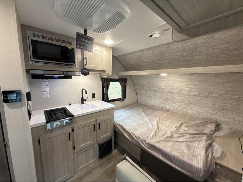 Lightweight camping is easier than you think with this travel trailer in tow! The front 54" x 74" bed will provide a great night's rest each night, while your overnight guest takes the booth dinette. There is a handy shelf above the front bed for your belongings plus additional bedroom storage. A private bath includes a 24" x 32" shower and a toilet with a mirror behind it so you can freshen up each day. You'll also find a two burner cooktop and microwave oven to make meals each day plus a 3.3 cu. ft. 12V refrigerator for food storage!