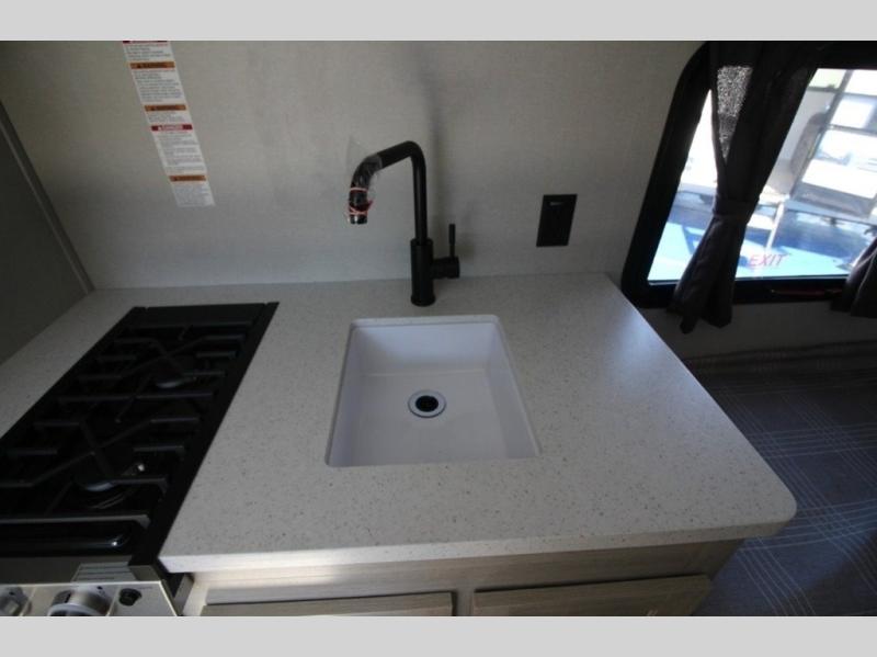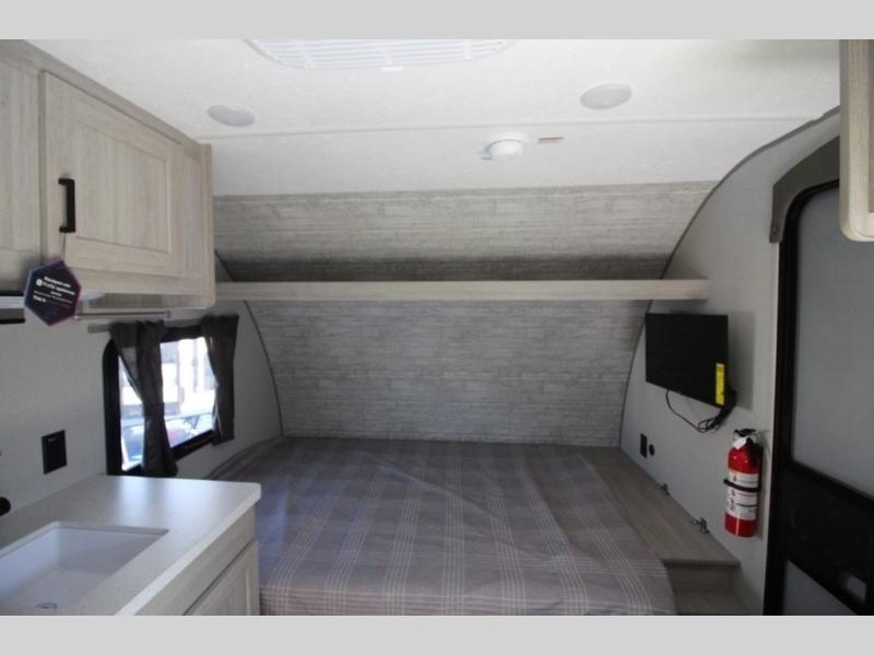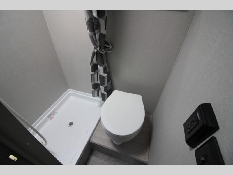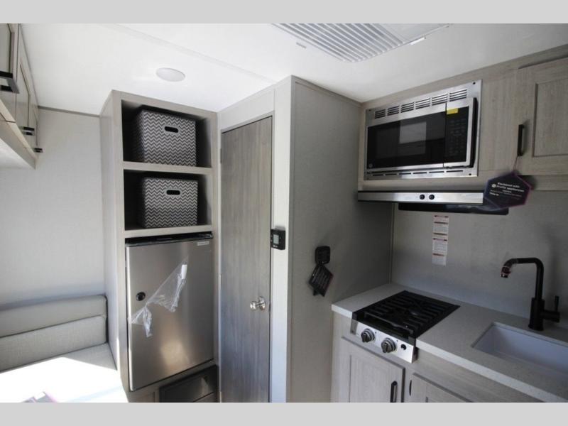 Lightweight camping is easier than you think with this travel trailer in tow! The front 54" x 74" queen bed will provide a great night's rest each night, while your overnight guest takes the booth dinette. There is a handy shelf above the front bed for your belongings plus additional bedroom storage. A private bath includes a 24" x 32" shower and a toilet with a mirror behind it so you can freshen up each day. You'll also find a two burner cooktop and microwave oven to make meals each day plus a 3.3 cu. ft. 12V refrigerator for food storage!