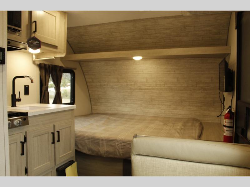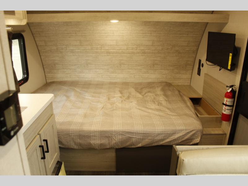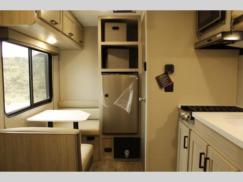 Lightweight camping is easier than you think with this travel trailer in tow! The front 54" x 74" bed will provide a great night's rest each night, while your overnight guest takes the booth dinette. There is a handy shelf above the front bed for your belongings plus additional bedroom storage. A private bath includes a 24" x 32" shower and a toilet with a mirror behind it so you can freshen up each day. You'll also find a two burner cooktop and microwave oven to make meals each day plus a 3.3 cu. ft. 12V refrigerator for food storage!