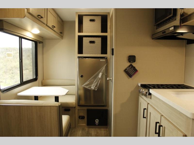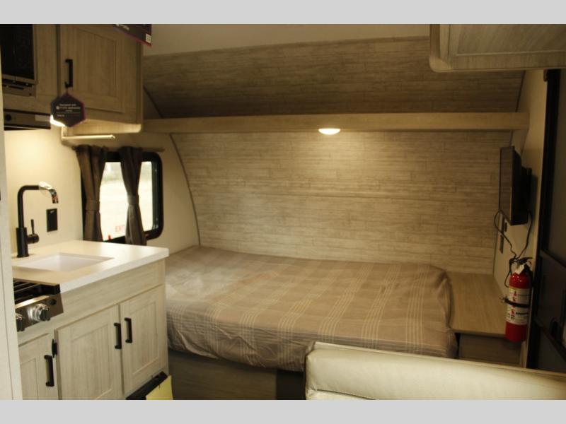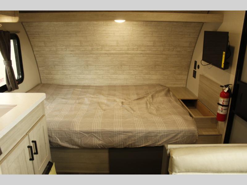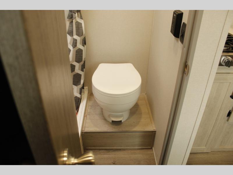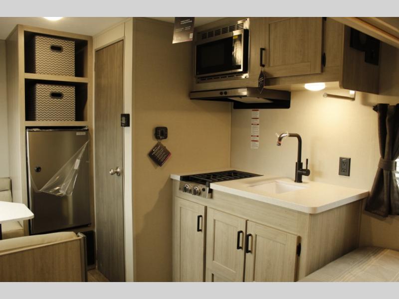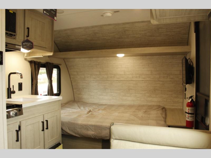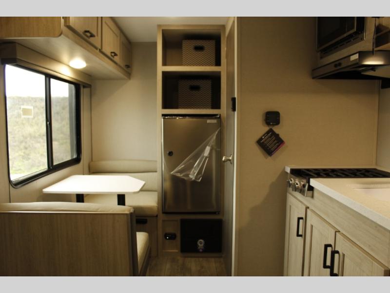 Lightweight camping is easier than you think with this travel trailer in tow! The front 54" x 74" bed will provide a great night's rest each night, while your overnight guest takes the booth dinette. There is a handy shelf above the front bed for your belongings plus additional bedroom storage. A private bath includes a 24" x 32" shower and a toilet with a mirror behind it so you can freshen up each day. You'll also find a two burner cooktop and microwave oven to make meals each day plus a 3.3 cu. ft. 12V refrigerator for food storage!