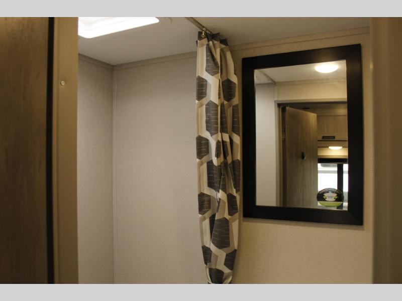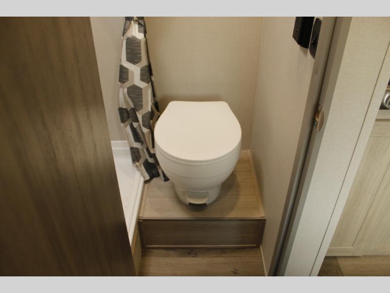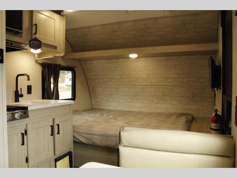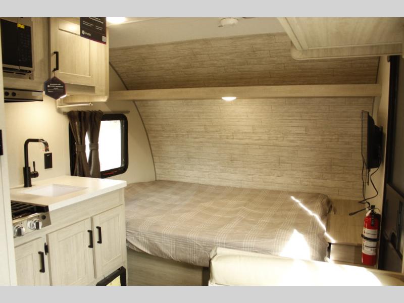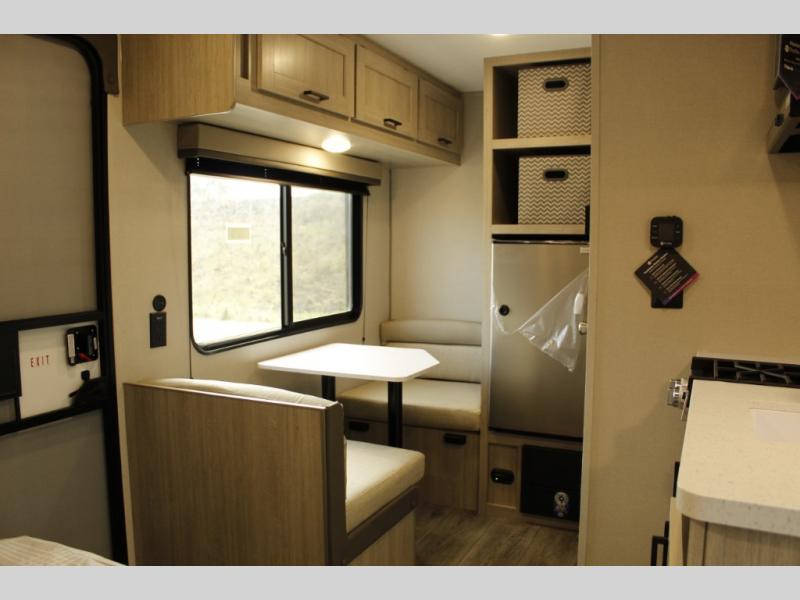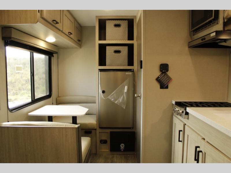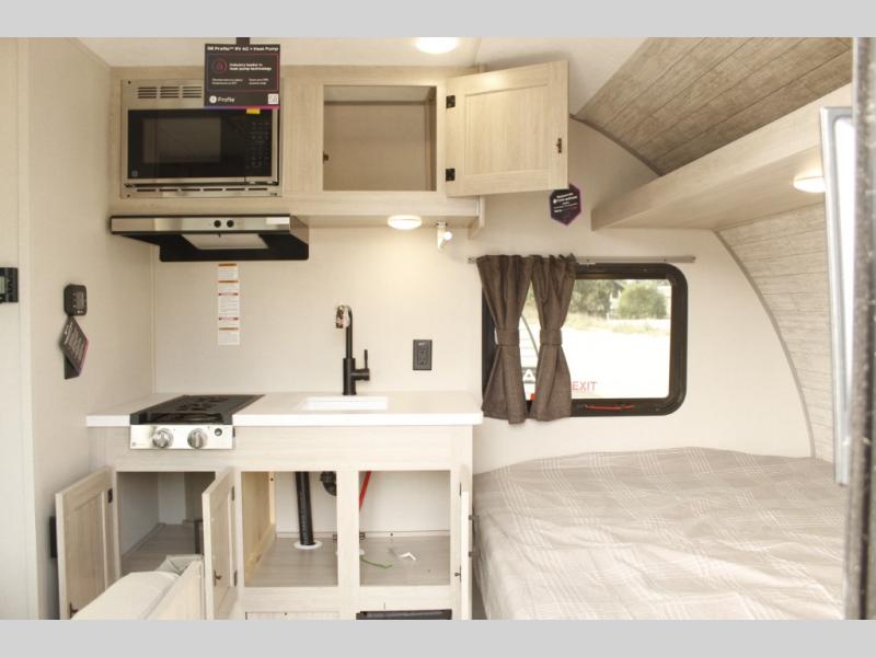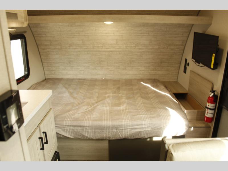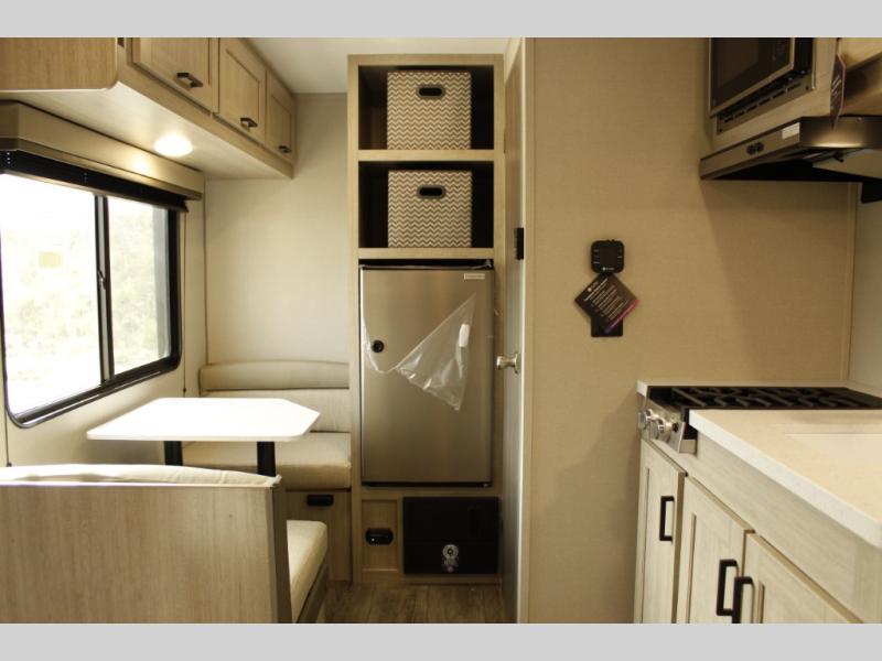 Lightweight camping is easier than you think with this travel trailer in tow! The front 54" x 74" bed will provide a great night's rest each night, while your overnight guest takes the booth dinette. There is a handy shelf above the front bed for your belongings plus additional bedroom storage. A private bath includes a 24" x 32" shower and a toilet with a mirror behind it so you can freshen up each day. You'll also find a two burner cooktop and microwave oven to make meals each day plus a 3.3 cu. ft. 12V refrigerator for food storage!