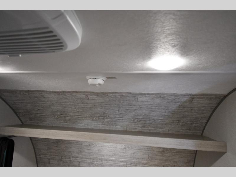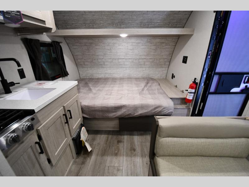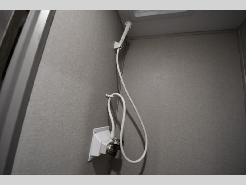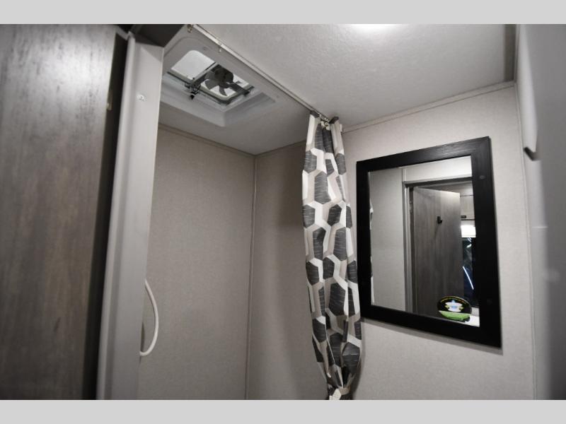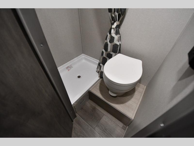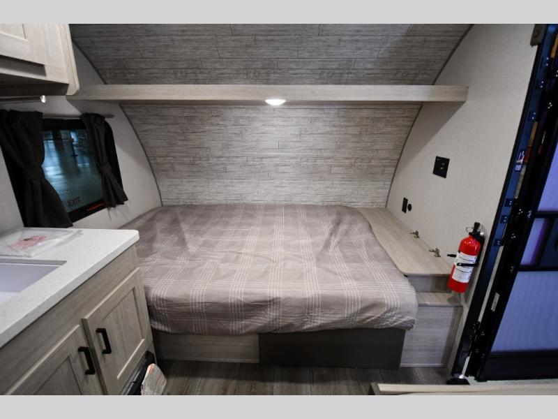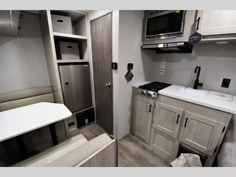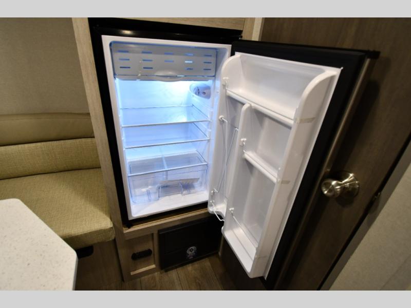 Lightweight camping is easier than you think with this travel trailer in tow! The front 54" x 74" bed will provide a great night's rest each night, while your overnight guest takes the booth dinette. There is a handy shelf above the front bed for your belongings plus additional bedroom storage. A private bath includes a 24" x 32" shower and a toilet with a mirror behind it so you can freshen up each day. You'll also find a two burner cooktop and microwave oven to make meals each day plus a 3.3 cu. ft. 12V refrigerator for food storage!