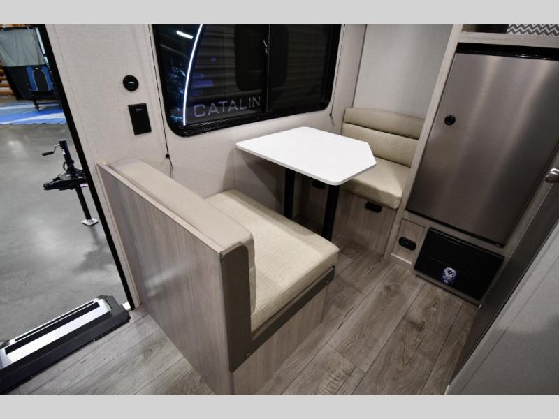 With any Catalina Summit Series 7' by Coachmen RV, you can create an easier adventure with the versatility and simplicity of the shorter lengths and lighter weights! Each includes a premium exterior graphics package, a smooth HD aluminum radius front, and EZ lube axles with leaf spring suspension. The exterior offers a heavy duty standard tongue jack, a diamond plate rock guard to protect against road debris, exterior RG-6 coax cabling and satellite prep, rear view camera prep, and flush mount baggage doors with radius corners for your outdoor gear. Inside, you will enjoy a premium JBL interior speaker, USB charging ports, seamless Thermofoil countertops throughout, a deep basin farm style sink for easy cleanup, and GE kitchen appliances. It's time to choose an affordable and maneuverable single axle trailer today!