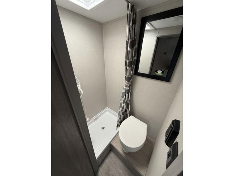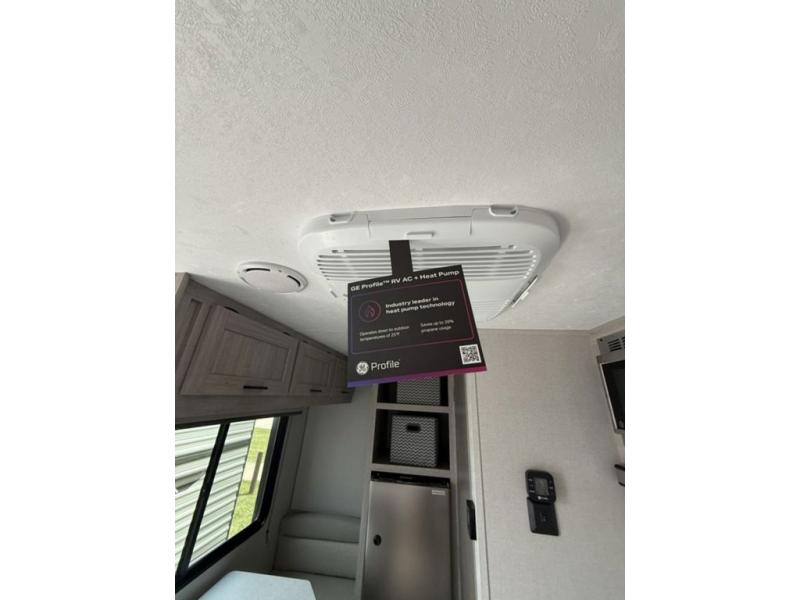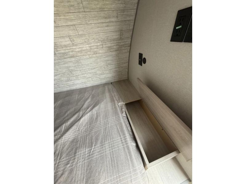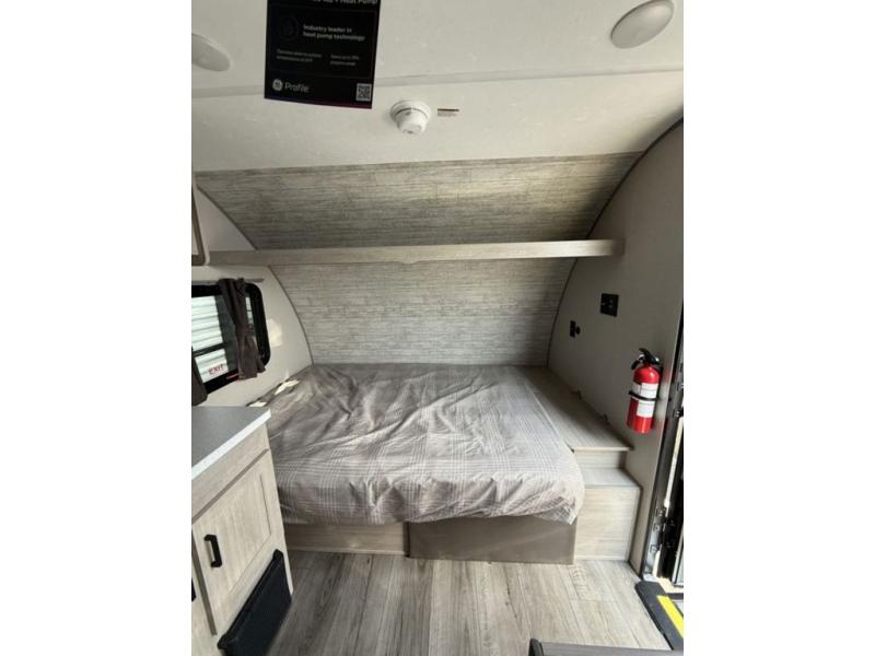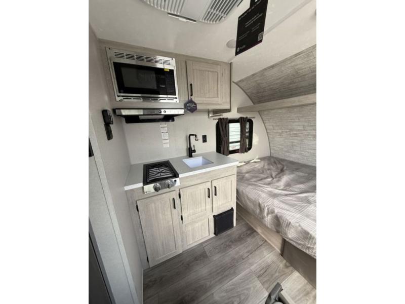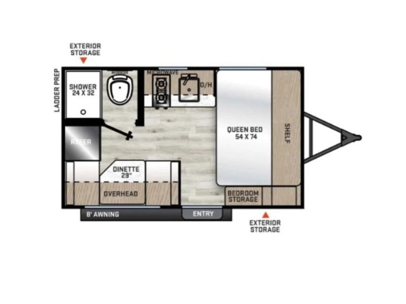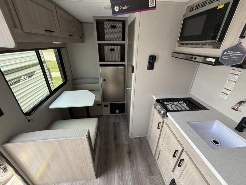 Lightweight camping is easier than you think with this travel trailer in tow! The front 54" x 74" bed will provide a great night's rest each night, while your overnight guest takes the booth dinette. There is a handy shelf above the front bed for your belongings plus additional bedroom storage. A private bath includes a 24" x 32" shower and a toilet with a mirror behind it so you can freshen up each day. You'll also find a two burner cooktop and microwave oven to make meals each day plus a 3.3 cu. ft. 12V refrigerator for food storage!