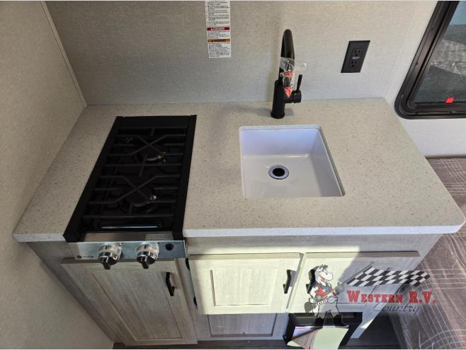 Lightweight camping is easier than you think with this travel trailer in tow! The front 54" x 74" bed will provide a great night's rest each night, while your overnight guest takes the booth dinette. There is a handy shelf above the front bed for your belongings plus additional bedroom storage. A private bath includes a 24" x 32" shower and a toilet with a mirror behind it so you can freshen up each day. You'll also find a two burner cooktop and microwave oven to make meals each day plus a 3.3 cu. ft. 12V refrigerator for food storage!