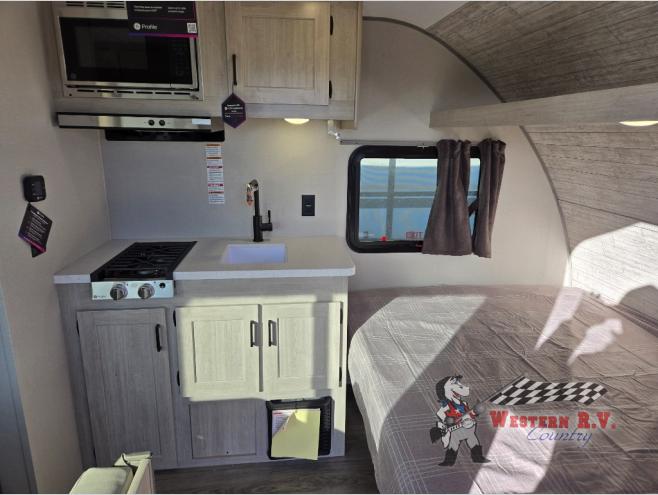 Lightweight camping is easier than you think with this travel trailer in tow! The front 54" x 74" bed will provide a great night's rest each night, while your overnight guest takes the booth dinette. There is a handy shelf above the front bed for your belongings plus additional bedroom storage. A private bath includes a 24" x 32" shower and a toilet with a mirror behind it so you can freshen up each day. You'll also find a two burner cooktop and microwave oven to make meals each day plus a 3.3 cu. ft. 12V refrigerator for food storage!