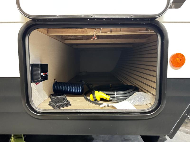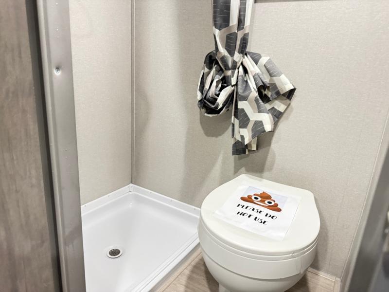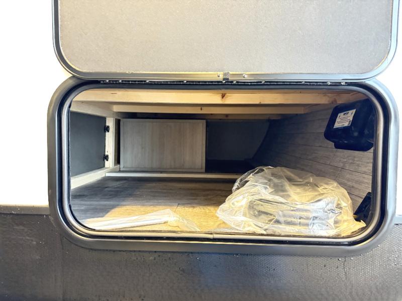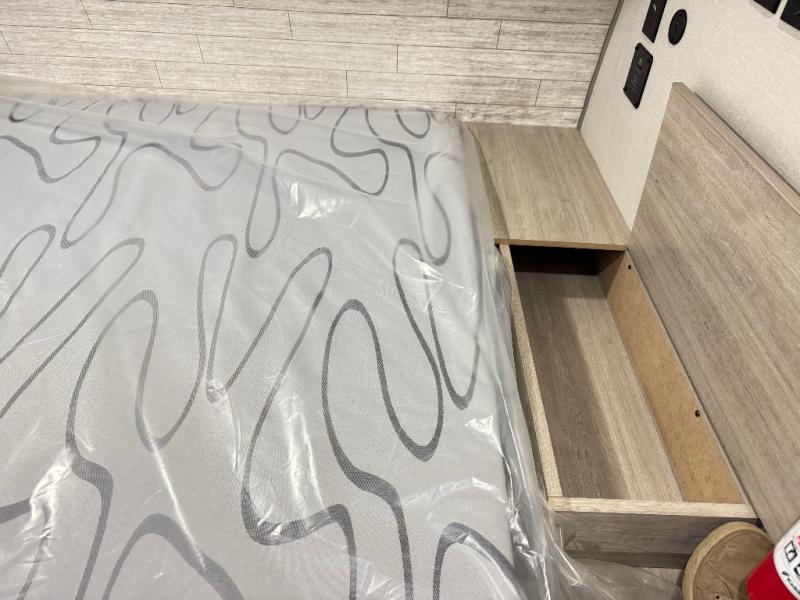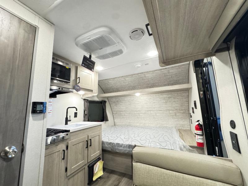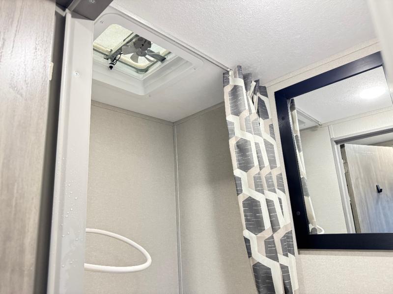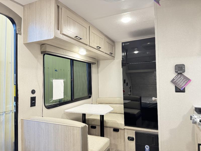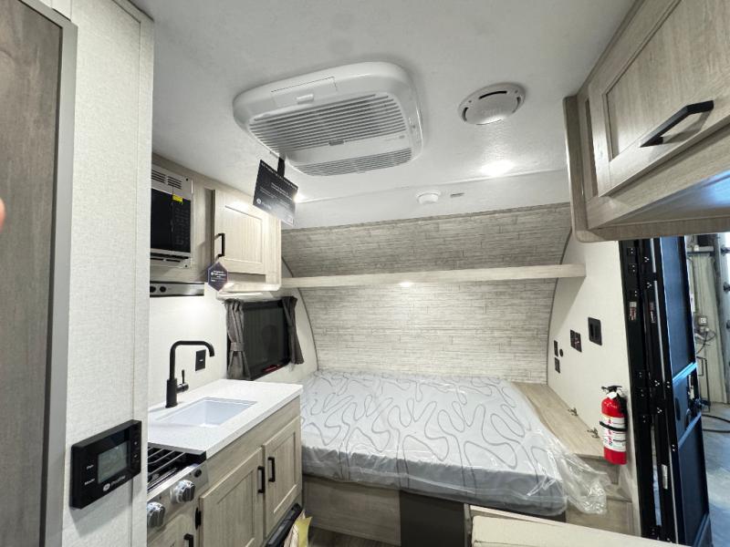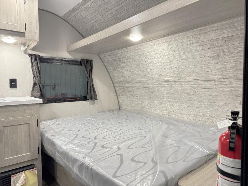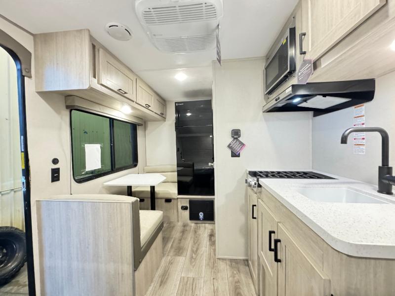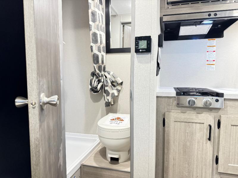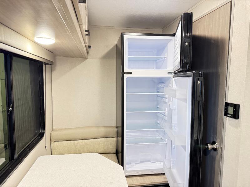 Lightweight camping is easier than you think with this travel trailer in tow! The front 54" x 74" bed will provide a great night's rest each night, while your overnight guest takes the booth dinette. There is a handy shelf above the front bed for your belongings plus additional bedroom storage. A private bath includes a 24" x 32" shower and a toilet with a mirror behind it so you can freshen up each day. You'll also find a two burner cooktop and microwave oven to make meals each day plus a 3.3 cu. ft. 12V refrigerator for food storage!