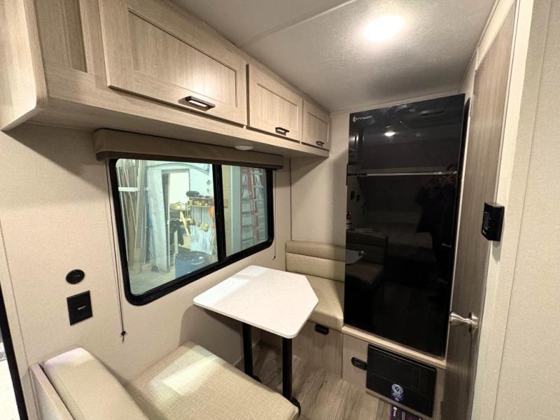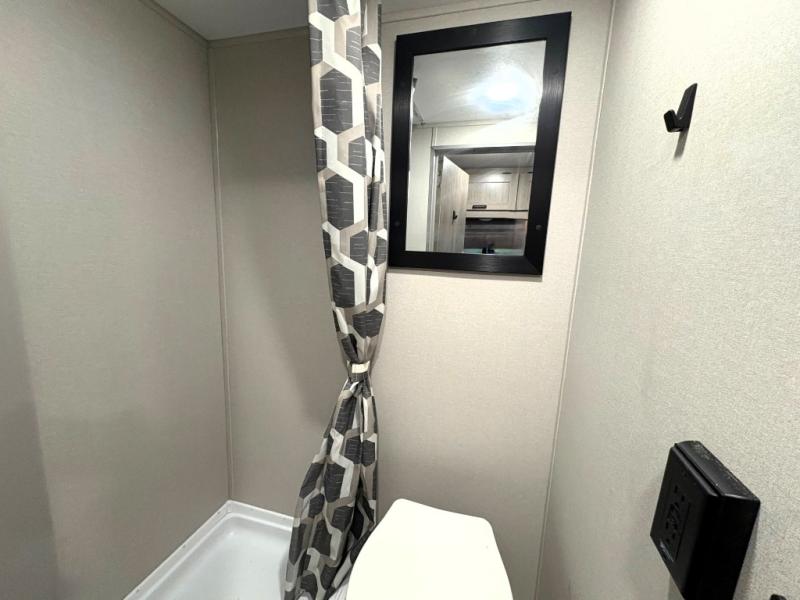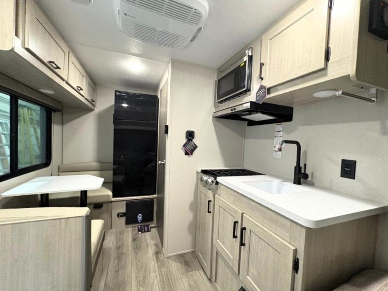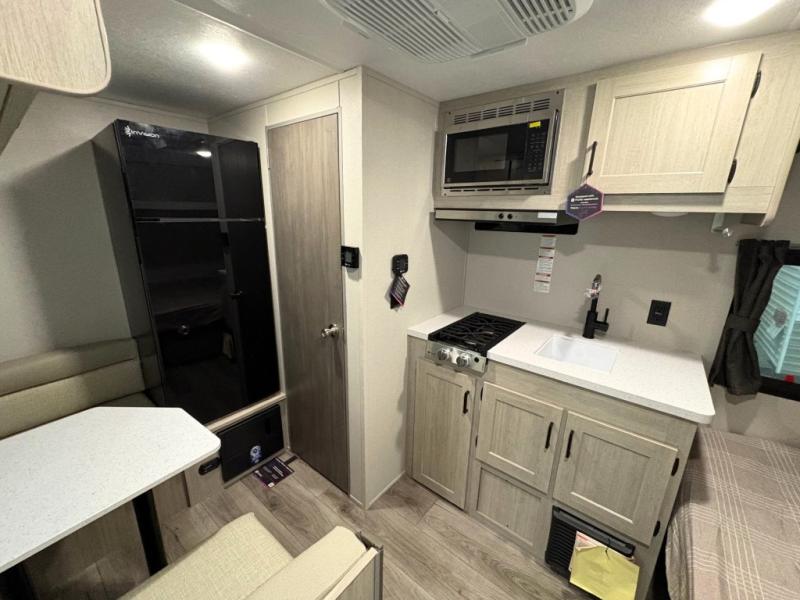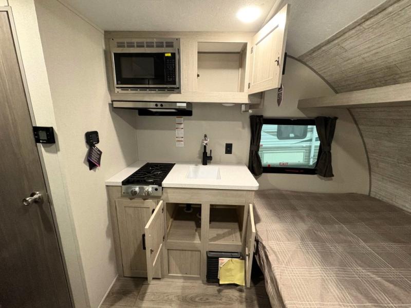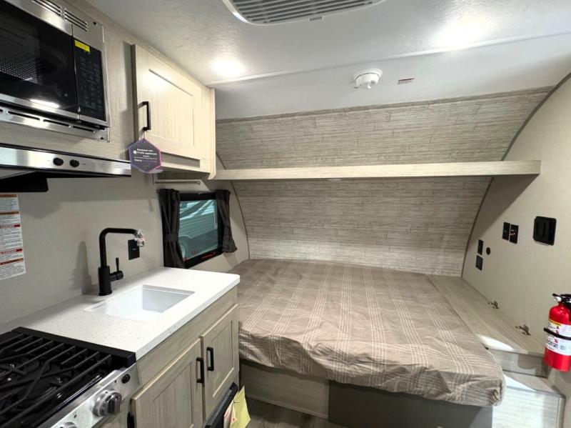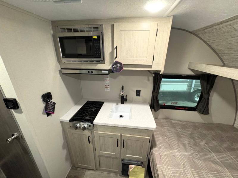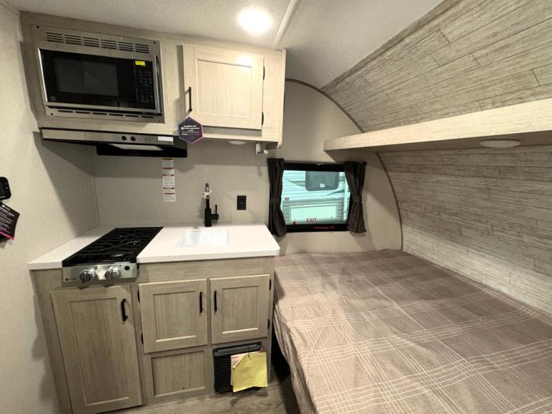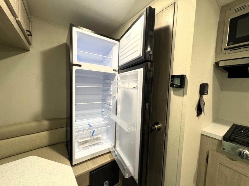 Lightweight camping is easier than you think with this travel trailer in tow! The front 54" x 74" bed will provide a great night's rest each night, while your overnight guest takes the booth dinette. There is a handy shelf above the front bed for your belongings plus additional bedroom storage. A private bath includes a 24" x 32" shower and a toilet with a mirror behind it so you can freshen up each day. You'll also find a two burner cooktop and microwave oven to make meals each day plus a 3.3 cu. ft. 12V refrigerator for food storage!