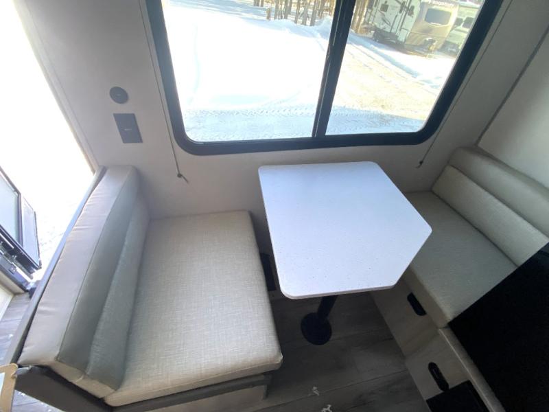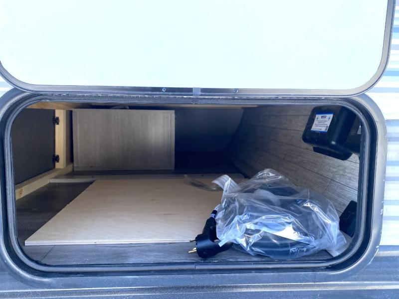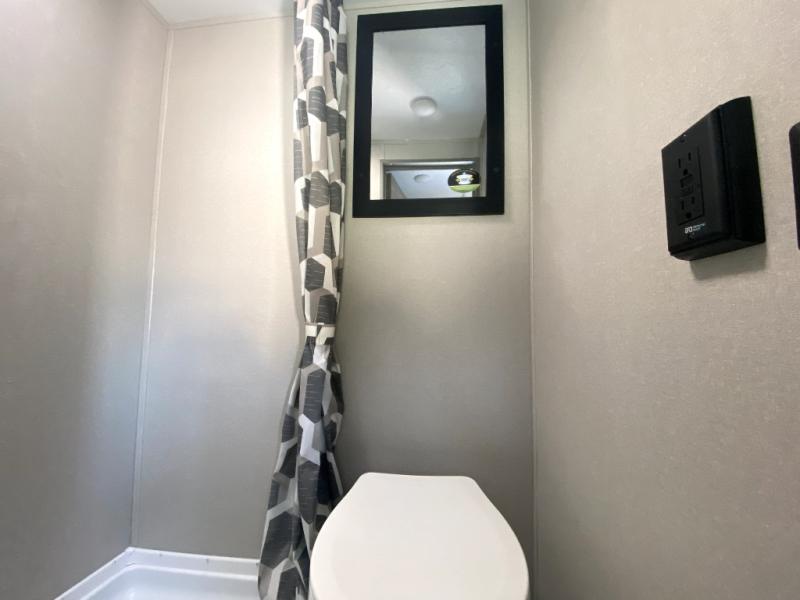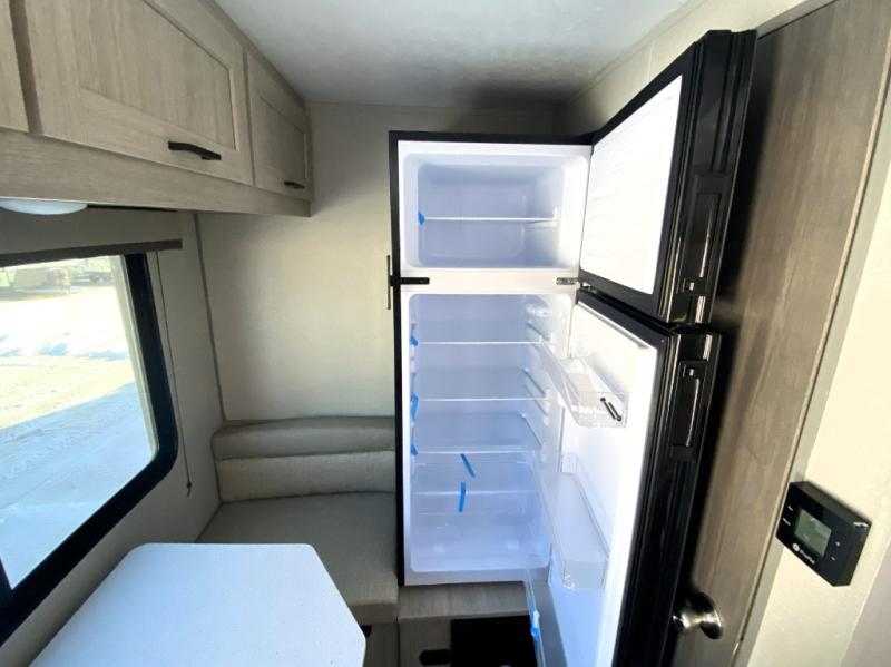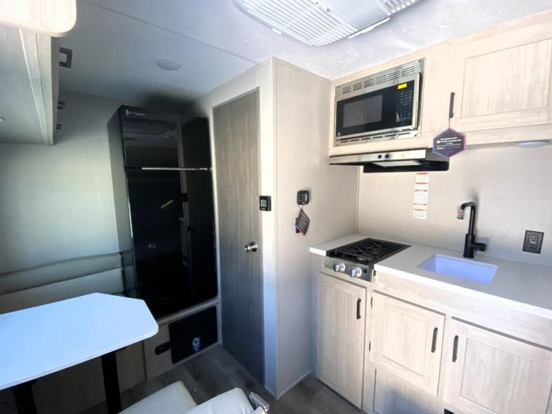 Lightweight camping is easier than you think with this travel trailer in tow! The front 54" x 74" bed will provide a great night's rest each night, while your overnight guest takes the booth dinette. There is a handy shelf above the front bed for your belongings plus additional bedroom storage. A private bath includes a 24" x 32" shower and a toilet with a mirror behind it so you can freshen up each day. You'll also find a two burner cooktop and microwave oven to make meals each day plus a 3.3 cu. ft. 12V refrigerator for food storage!