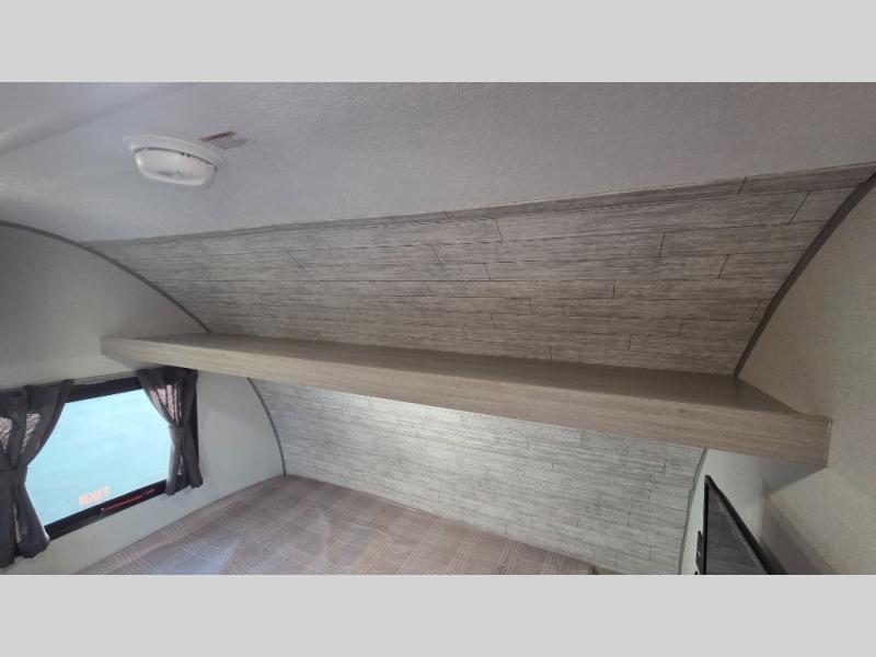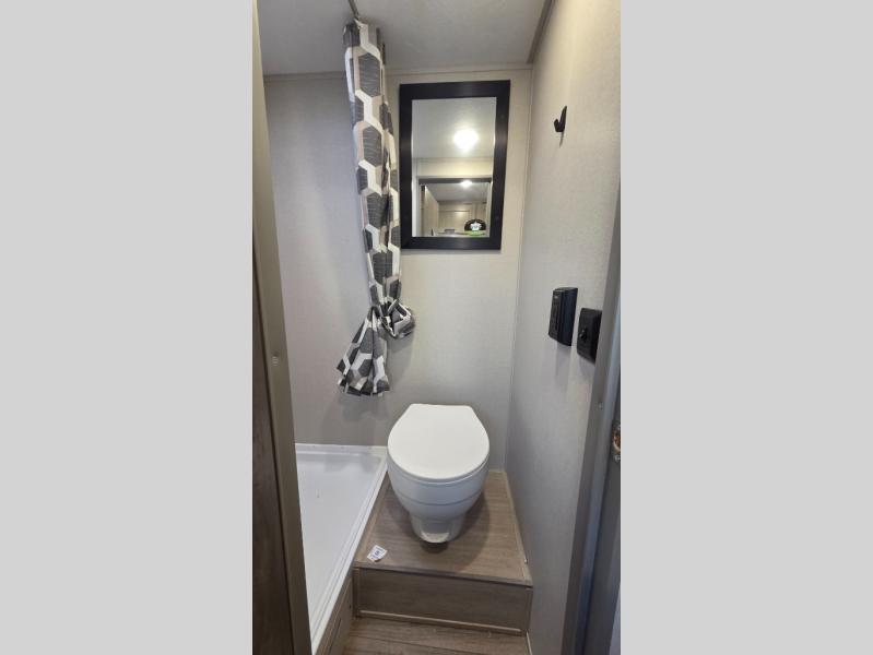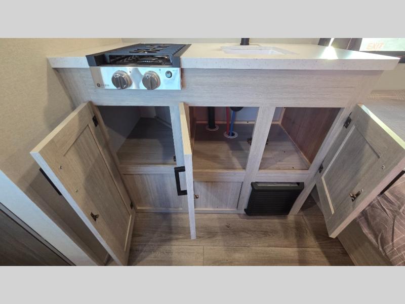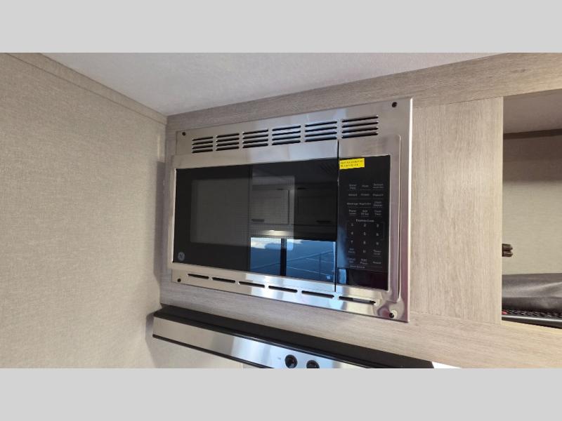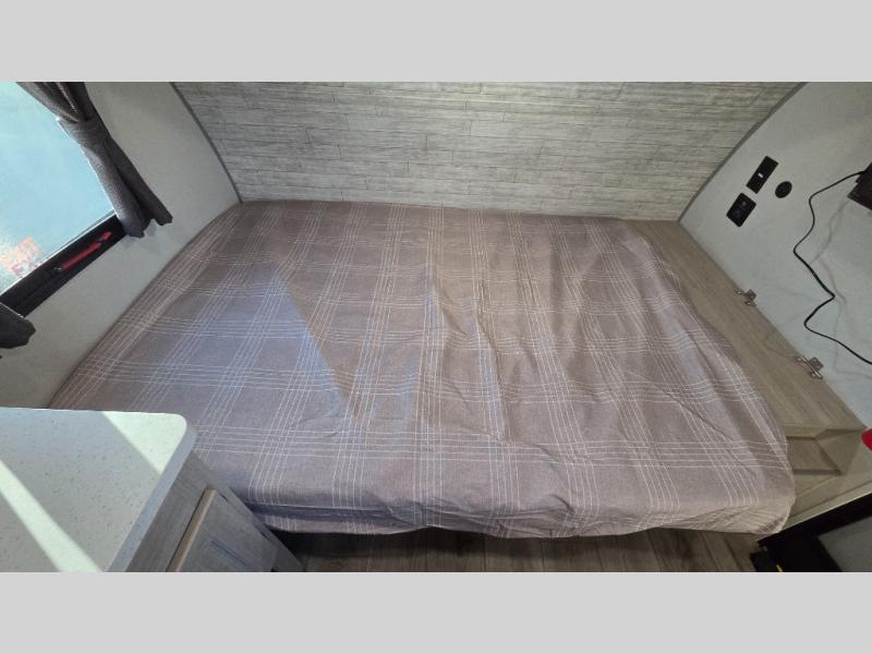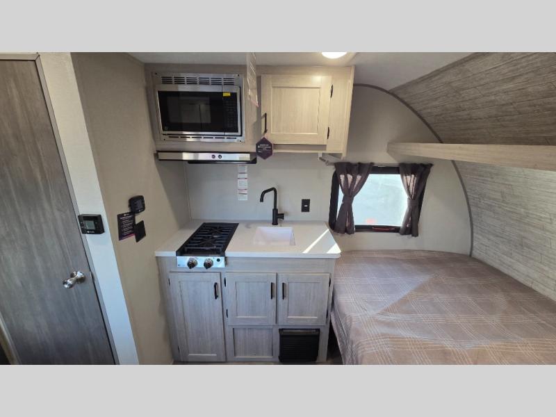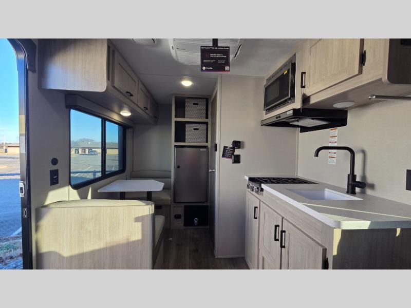Lightweight camping is easier than you think with this travel trailer in tow! The front 54" x 74" bed will provide a great night's rest each night, while your overnight guest takes the booth dinette. There is a handy shelf above the front bed for your belongings plus additional bedroom storage. A private bath includes a 24" x 32" shower and a toilet with a mirror behind it so you can freshen up each day. You'll also find a two burner cooktop and microwave oven to make meals each day plus a 3.3 cu. ft. 12V refrigerator for food storage!