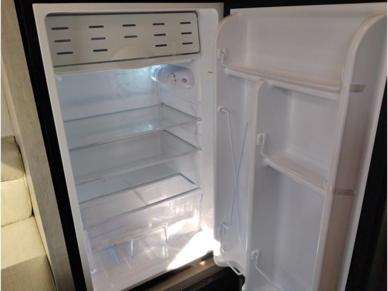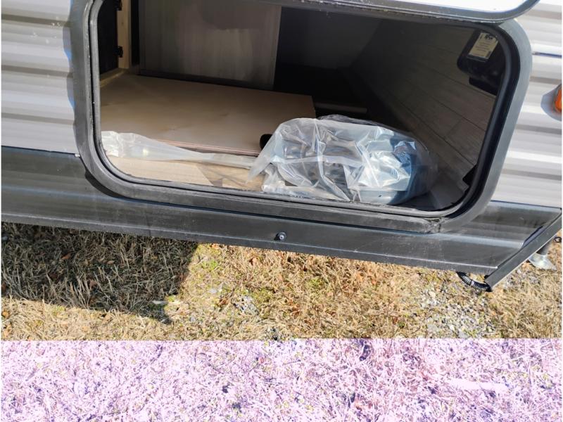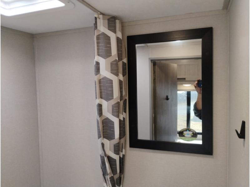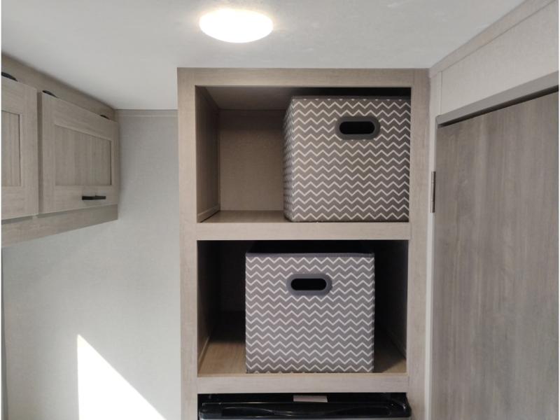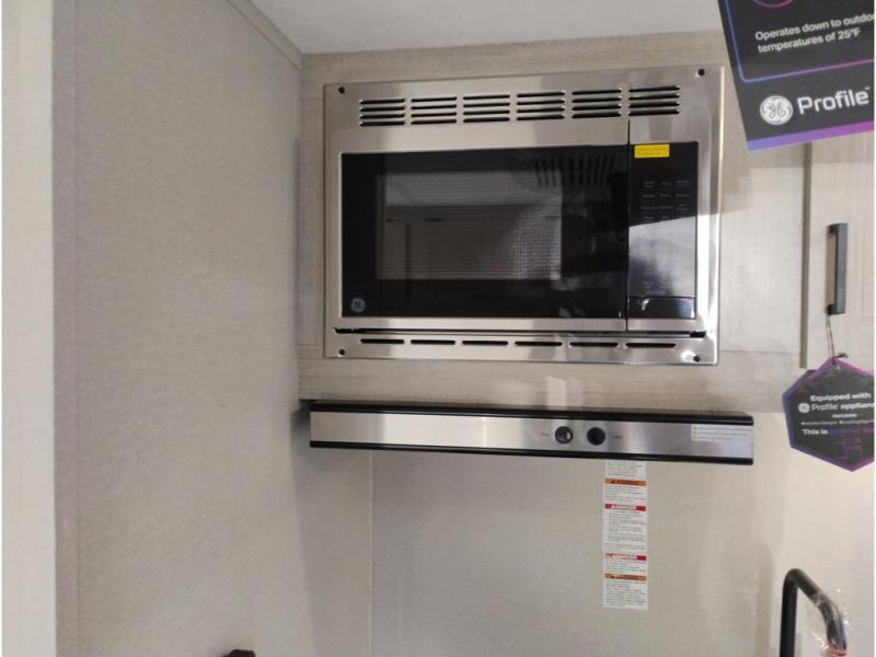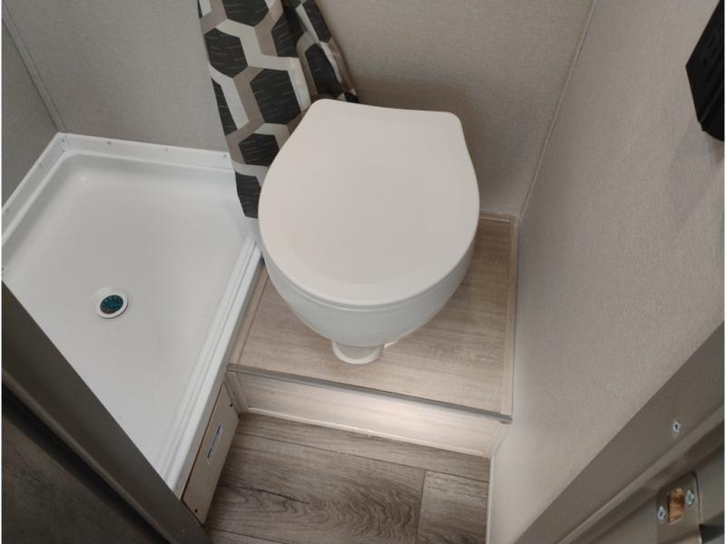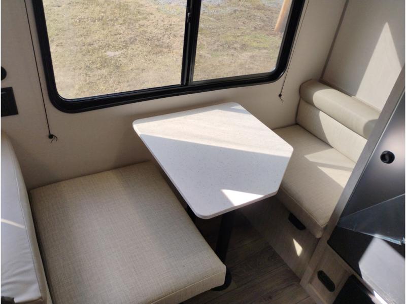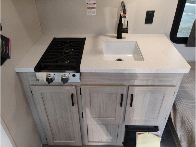 Lightweight camping is easier than you think with this travel trailer in tow! The front 54" x 74" bed will provide a great night's rest each night, while your overnight guest takes the booth dinette. There is a handy shelf above the front bed for your belongings plus additional bedroom storage. A private bath includes a 24" x 32" shower and a toilet with a mirror behind it so you can freshen up each day. You'll also find a two burner cooktop and microwave oven to make meals each day plus a 3.3 cu. ft. 12V refrigerator for food storage!