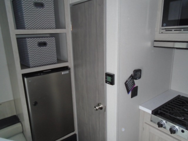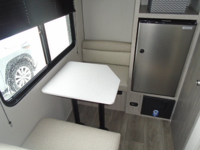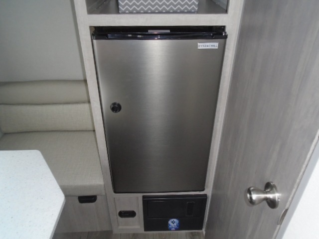 Lightweight camping is easier than you think with this travel trailer in tow! The front 54" x 74" bed will provide a great night's rest each night, while your overnight guest takes the booth dinette. There is a handy shelf above the front bed for your belongings plus additional bedroom storage. A private bath includes a 24" x 32" shower and a toilet with a mirror behind it so you can freshen up each day. You'll also find a two burner cooktop and microwave oven to make meals each day plus a 3.3 cu. ft. 12V refrigerator for food storage!