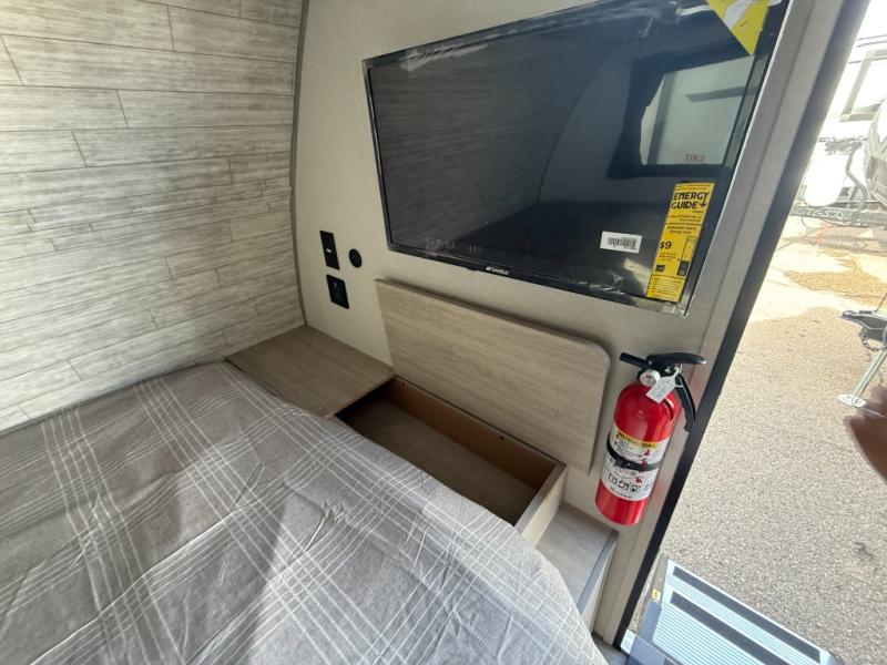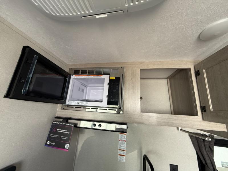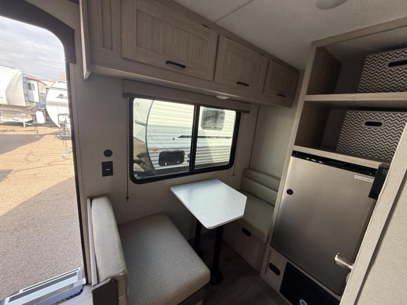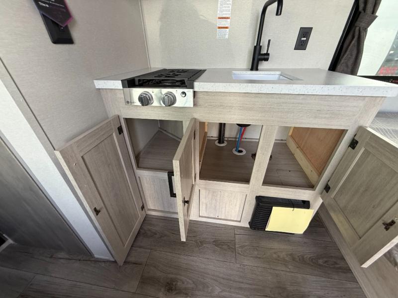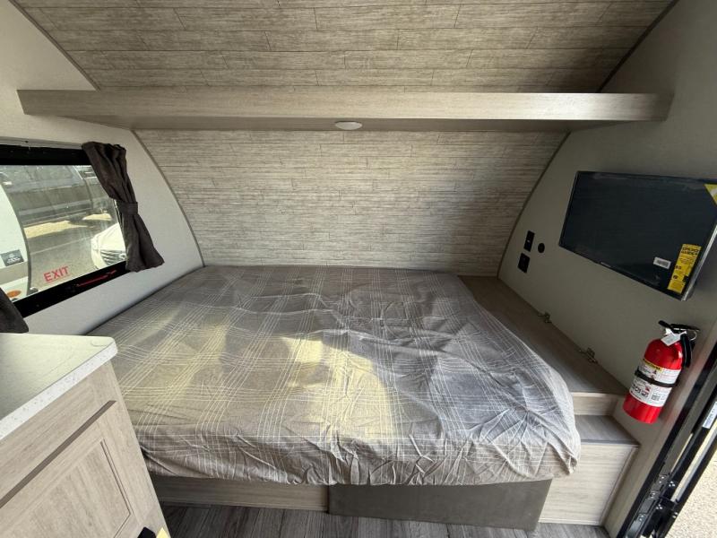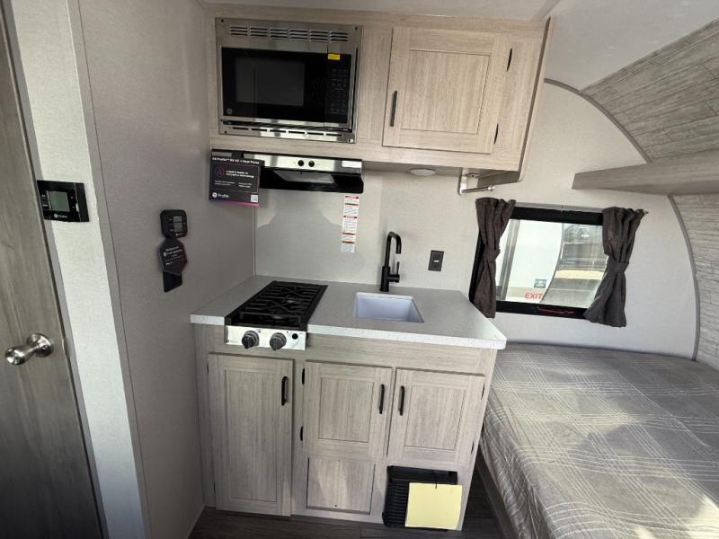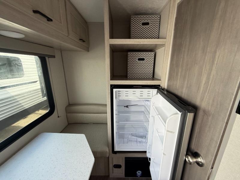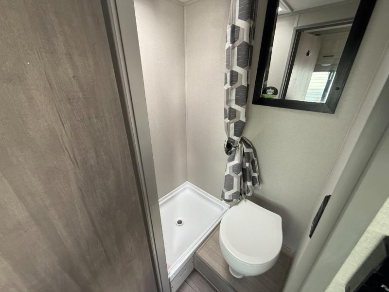 Lightweight camping is easier than you think with this travel trailer in tow! The front 54" x 74" bed will provide a great night's rest each night, while your overnight guest takes the booth dinette. There is a handy shelf above the front bed for your belongings plus additional bedroom storage. A private bath includes a 24" x 32" shower and a toilet with a mirror behind it so you can freshen up each day. You'll also find a two burner cooktop and microwave oven to make meals each day plus a 3.3 cu. ft. 12V refrigerator for food storage!