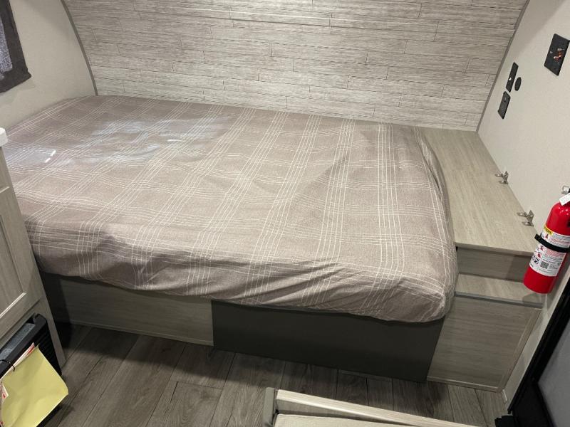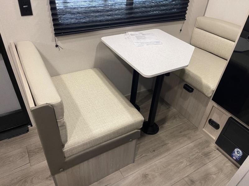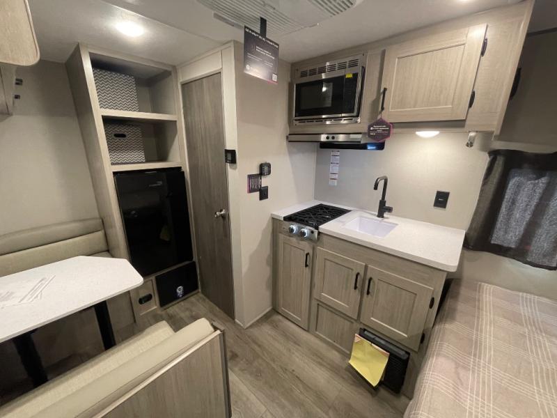 Lightweight camping is easier than you think with this travel trailer in tow! The front 54" x 74" bed will provide a great night's rest each night, while your overnight guest takes the booth dinette. There is a handy shelf above the front bed for your belongings plus additional bedroom storage. A private bath includes a 24" x 32" shower and a toilet with a mirror behind it so you can freshen up each day. You'll also find a two burner cooktop and microwave oven to make meals each day plus a 3.3 cu. ft. 12V refrigerator for food storage!