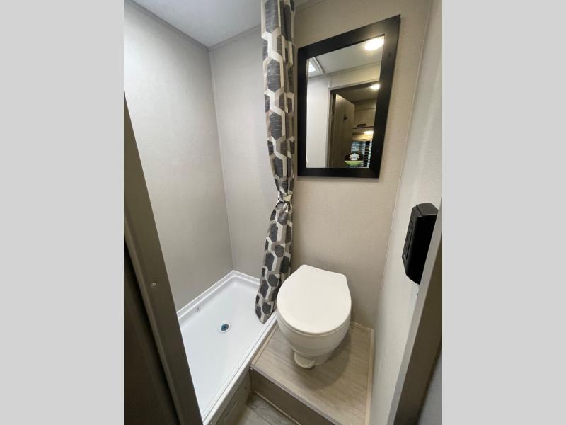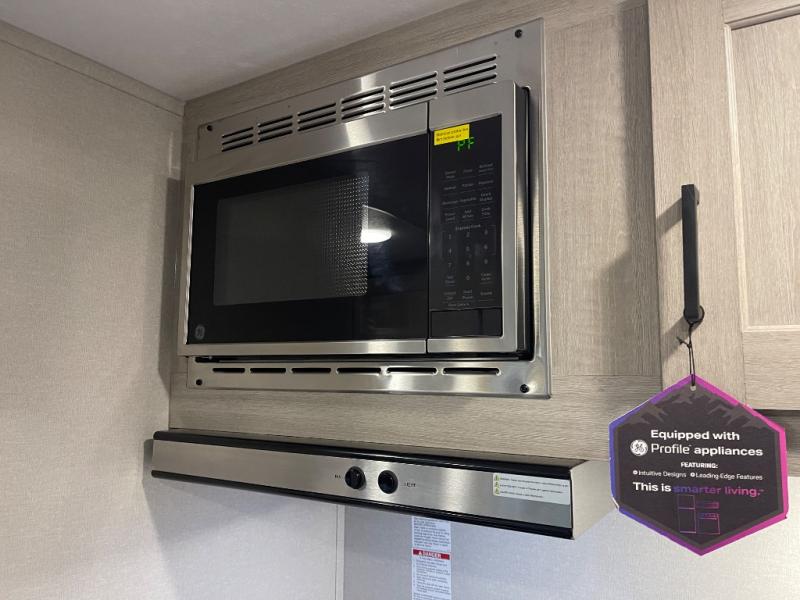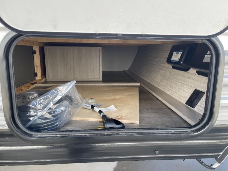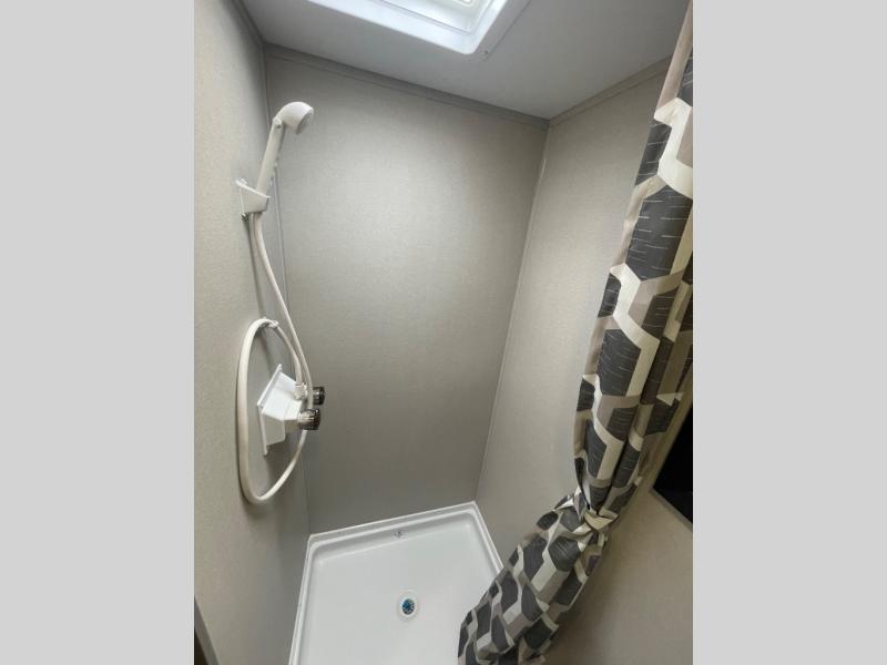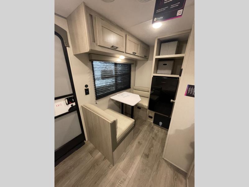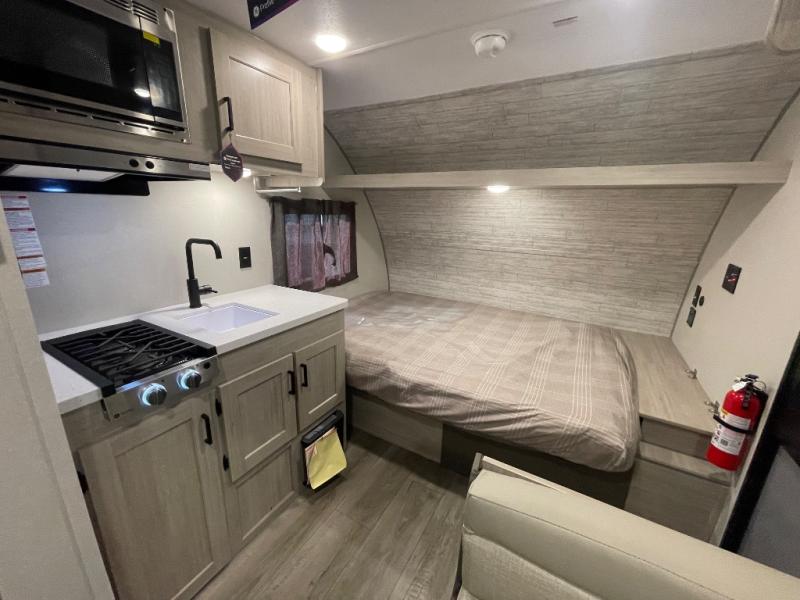 Lightweight camping is easier than you think with this travel trailer in tow! The front 54" x 74" bed will provide a great night's rest each night, while your overnight guest takes the booth dinette. There is a handy shelf above the front bed for your belongings plus additional bedroom storage. A private bath includes a 24" x 32" shower and a toilet with a mirror behind it so you can freshen up each day. You'll also find a two burner cooktop and microwave oven to make meals each day plus a 3.3 cu. ft. 12V refrigerator for food storage!