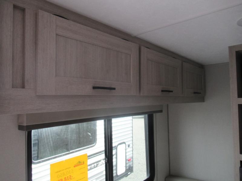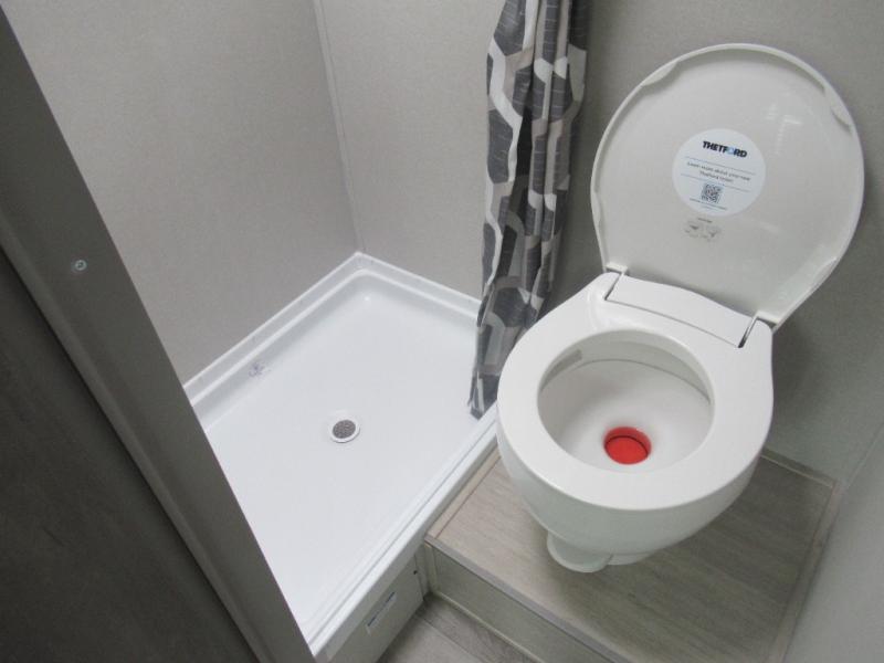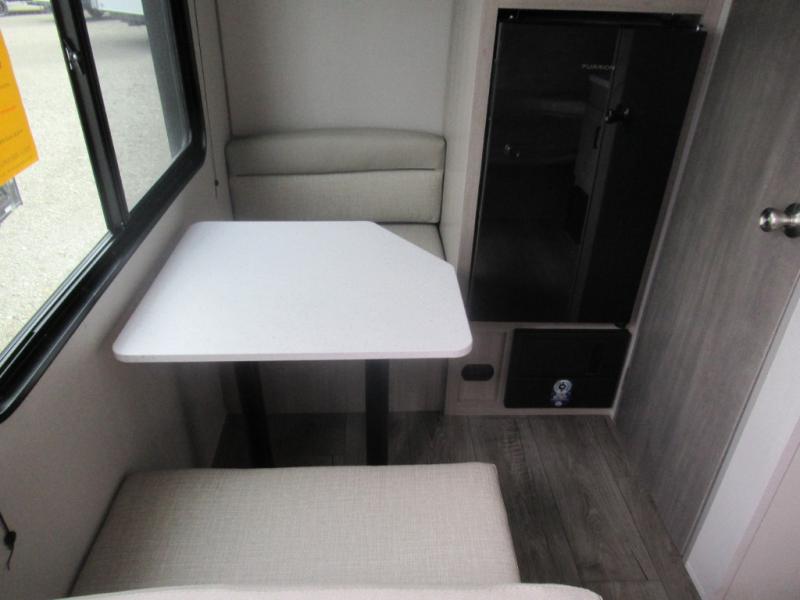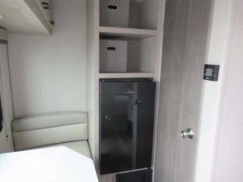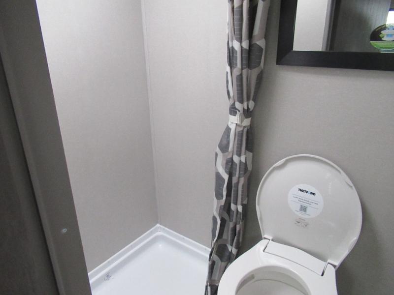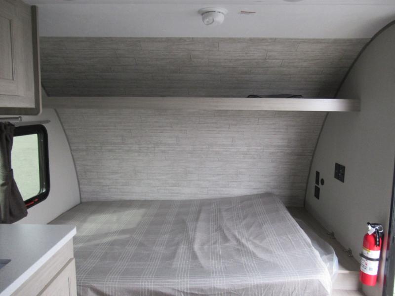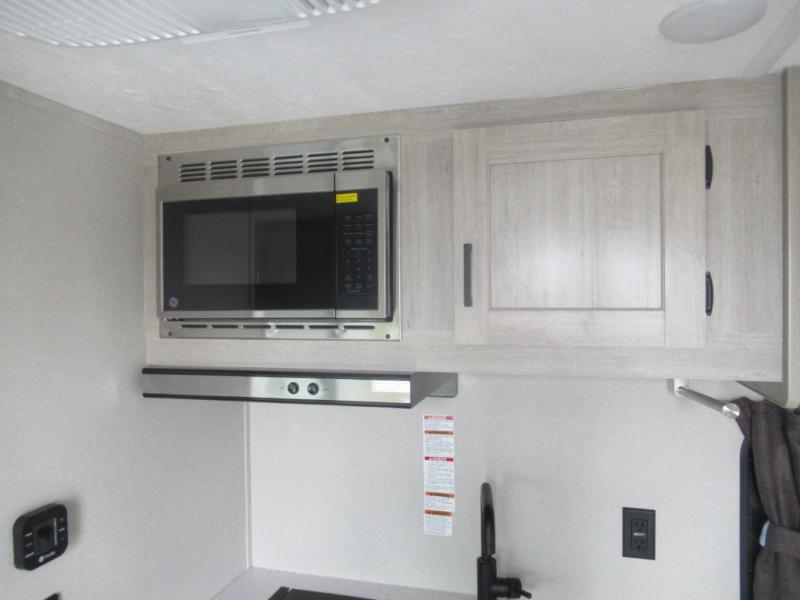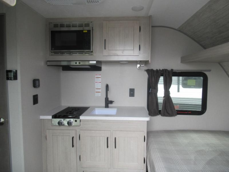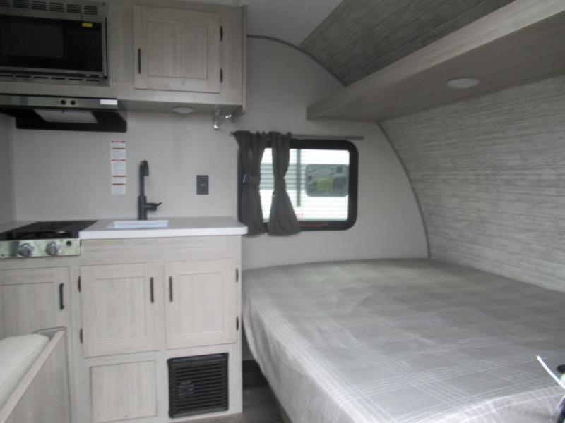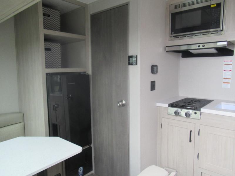 Lightweight camping is easier than you think with this travel trailer in tow! The front 54" x 74" bed will provide a great night's rest each night, while your overnight guest takes the booth dinette. There is a handy shelf above the front bed for your belongings plus additional bedroom storage. A private bath includes a 24" x 32" shower and a toilet with a mirror behind it so you can freshen up each day. You'll also find a two burner cooktop and microwave oven to make meals each day plus a 3.3 cu. ft. 12V refrigerator for food storage!