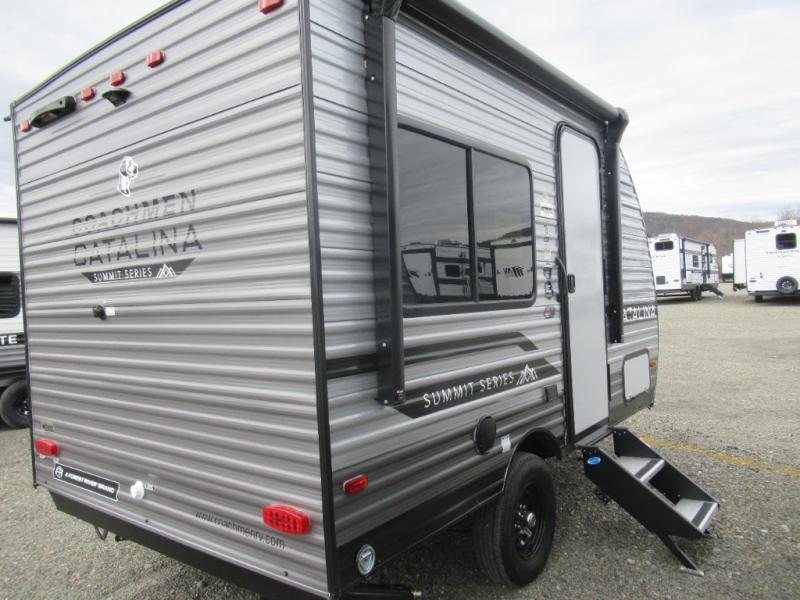 With any Catalina Summit Series 7' by Coachmen RV, you can create an easier adventure with the versatility and simplicity of the shorter lengths and lighter weights! Each includes a premium exterior graphics package, a smooth HD aluminum radius front, and EZ lube axles with leaf spring suspension. The exterior offers a heavy duty standard tongue jack, a diamond plate rock guard to protect against road debris, exterior RG-6 coax cabling and satellite prep, rear view camera prep, and flush mount baggage doors with radius corners for your outdoor gear. Inside, you will enjoy a premium JBL interior speaker, USB charging ports, seamless Thermofoil countertops throughout, a deep basin farm style sink for easy cleanup, and GE kitchen appliances. It's time to choose an affordable and maneuverable single axle trailer today!