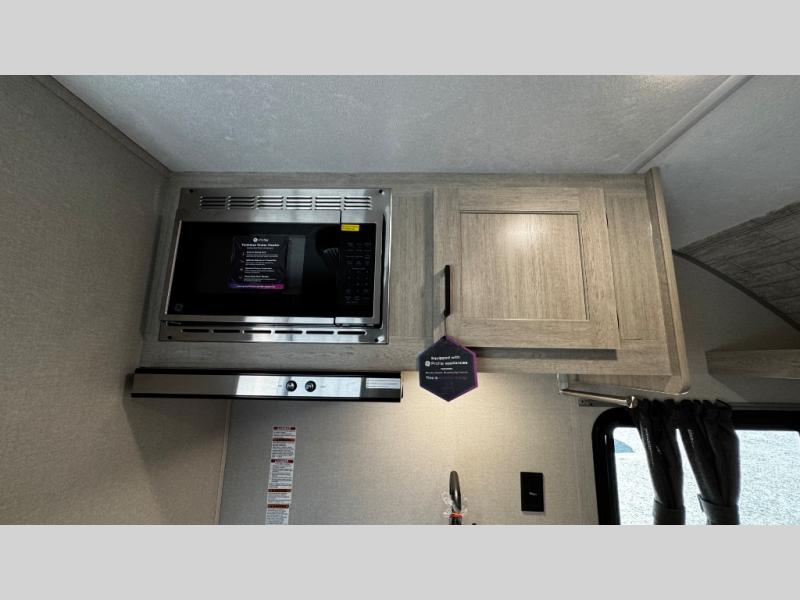 Lightweight camping is easier than you think with this travel trailer in tow! The front 54" x 74" bed will provide a great night's rest each night, while your overnight guest takes the booth dinette. There is a handy shelf above the front bed for your belongings plus additional bedroom storage. A private bath includes a 24" x 32" shower and a toilet with a mirror behind it so you can freshen up each day. You'll also find a two burner cooktop and microwave oven to make meals each day plus a 3.3 cu. ft. 12V refrigerator for food storage!