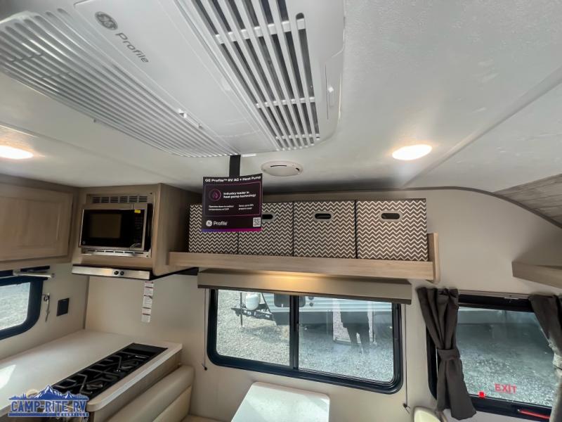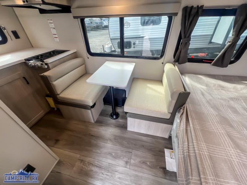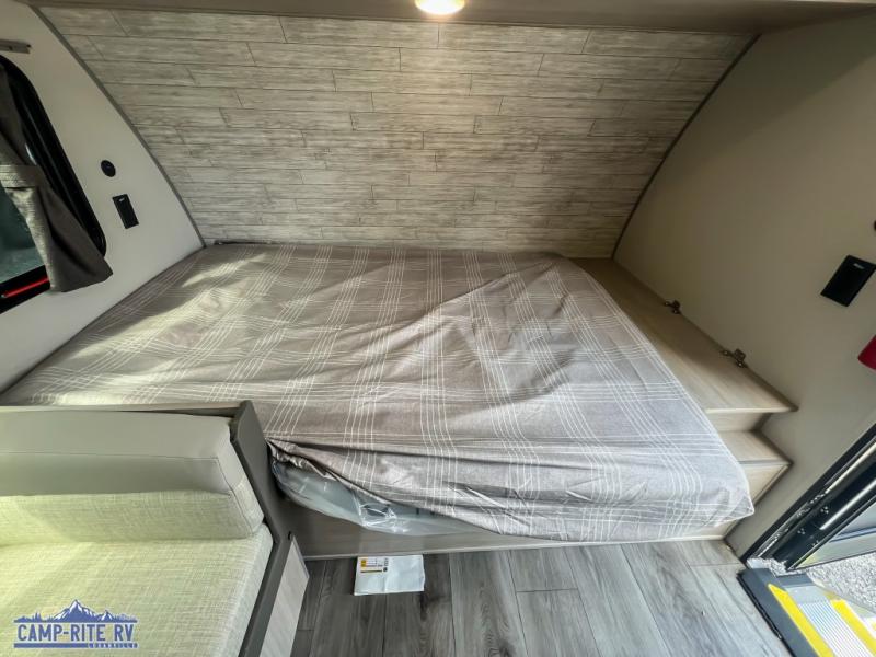Lightweight camping is easier than you think with this travel trailer in tow! The front 54" x 74" queen bed will provide a great night's rest each night, while your overnight guest takes the 60" Jack knife sofa. There is a handy shelf above the front bed for your belongings plus a shelf with bins over the sofa. A private bath includes a 24" x 32" shower and a toilet with a mirror behind it so you can freshen up each day. You'll also find a two burner cooktop and microwave oven to make meals each day plus a 3.3 cu. ft. 12V refrigerator for food storage!