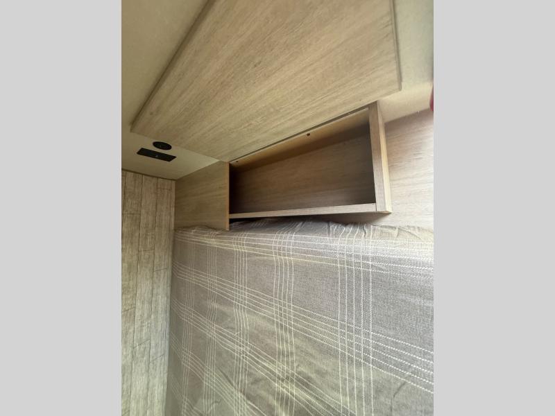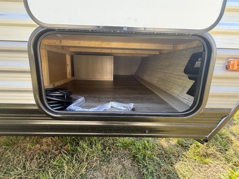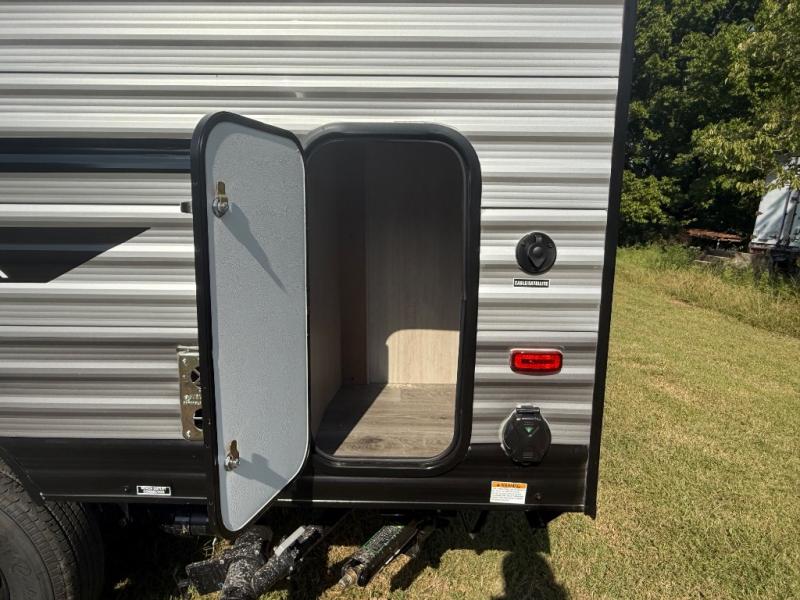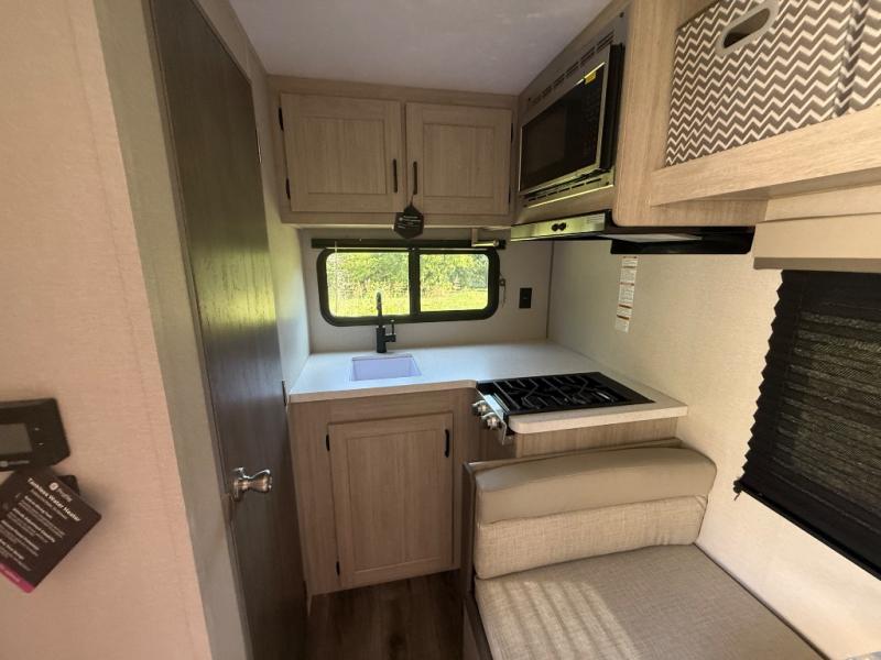 Lightweight camping is easier than you think with this travel trailer in tow! The front 54" x 74" queen bed will provide a great night's rest each night, while your overnight guest takes the 60" Jack knife sofa. There is a handy shelf above the front bed for your belongings plus a shelf with bins over the sofa. A private bath includes a 24" x 32" shower and a toilet with a mirror behind it so you can freshen up each day. You'll also find a two burner cooktop and microwave oven to make meals each day plus a 3.3 cu. ft. 12V refrigerator for food storage!