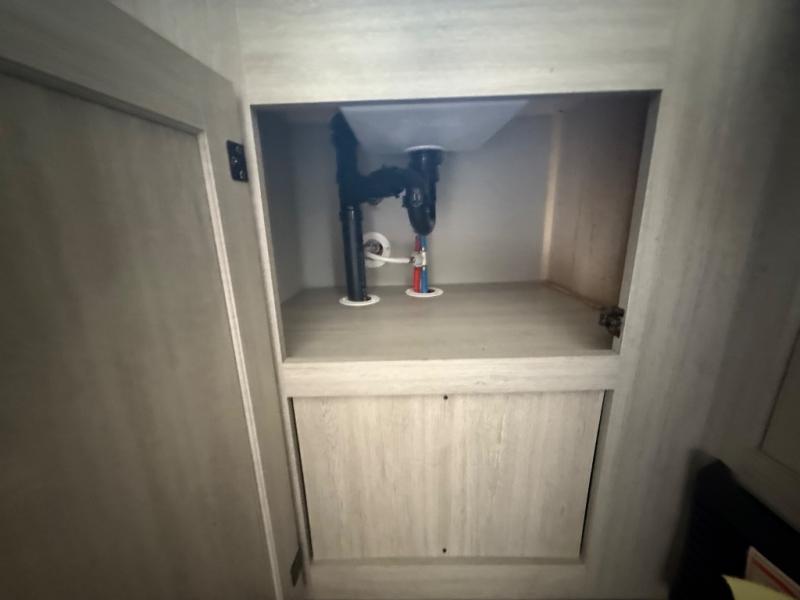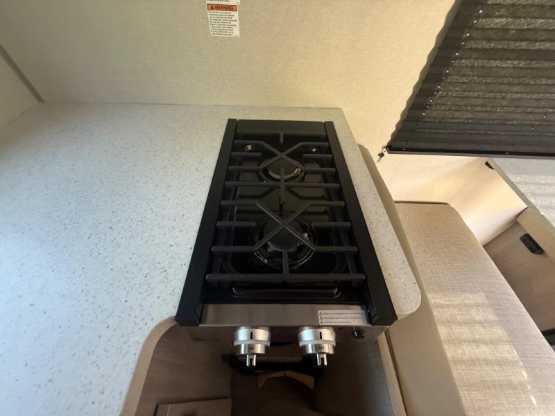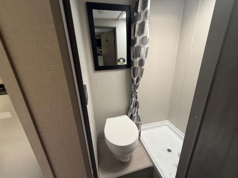 Lightweight camping is easier than you think with this travel trailer in tow! The front 54" x 74" queen bed will provide a great night's rest each night, while your overnight guest takes the 60" Jack knife sofa. There is a handy shelf above the front bed for your belongings plus a shelf with bins over the sofa. A private bath includes a 24" x 32" shower and a toilet with a mirror behind it so you can freshen up each day. You'll also find a two burner cooktop and microwave oven to make meals each day plus a 3.3 cu. ft. 12V refrigerator for food storage!