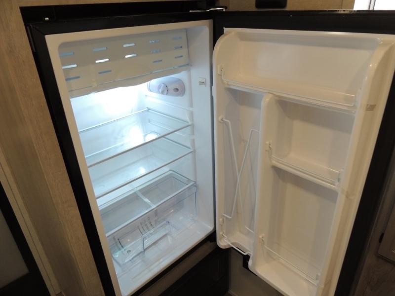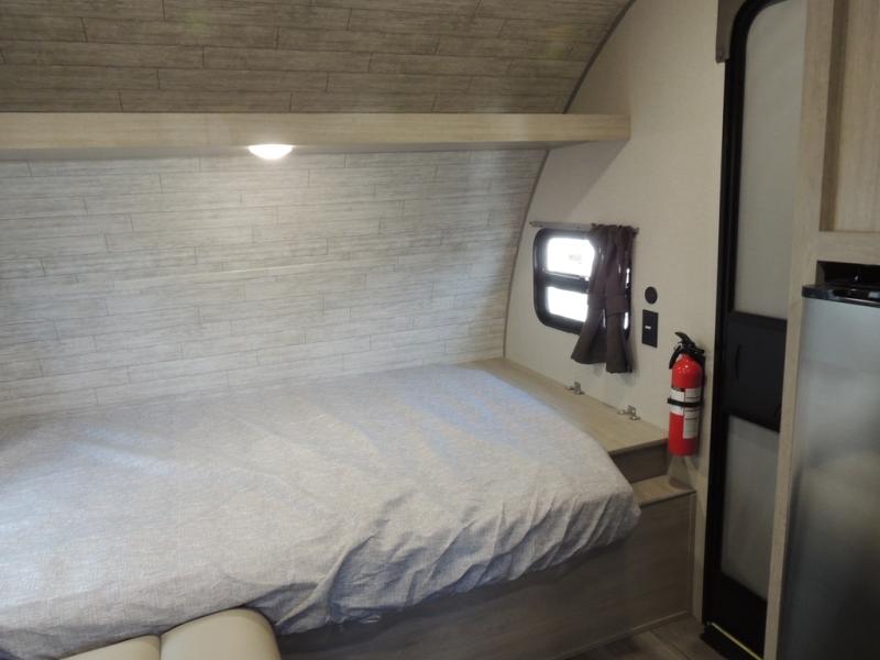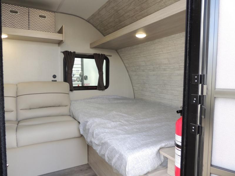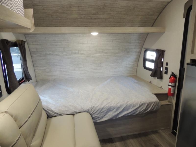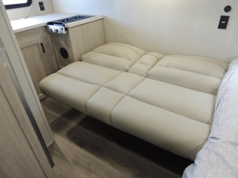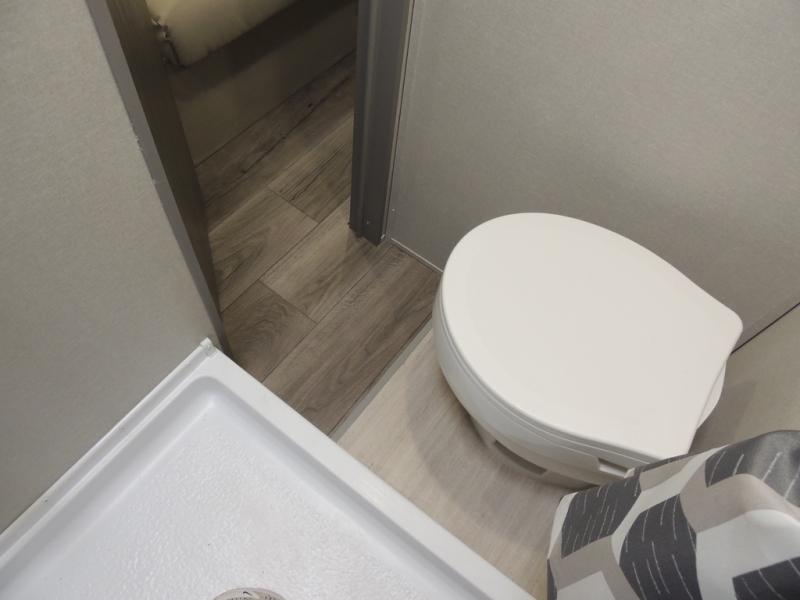Lightweight camping is easier than you think with this travel trailer in tow! The front 54" x 74" queen bed will provide a great night's rest each night, while your overnight guest takes the 60" Jack knife sofa. There is a handy shelf above the front bed for your belongings plus a shelf with bins over the sofa. A private bath includes a 24" x 32" shower and a toilet with a mirror behind it so you can freshen up each day. You'll also find a two burner cooktop and microwave oven to make meals each day plus a 3.3 cu. ft. 12V refrigerator for food storage!