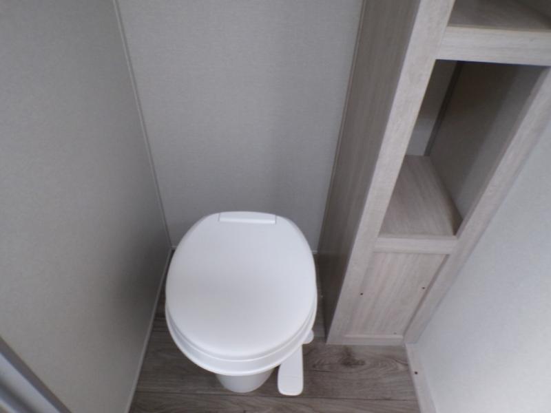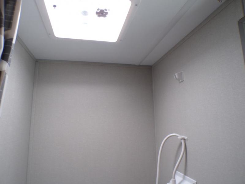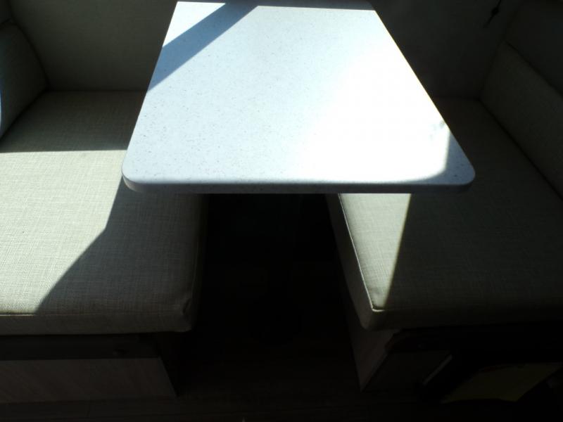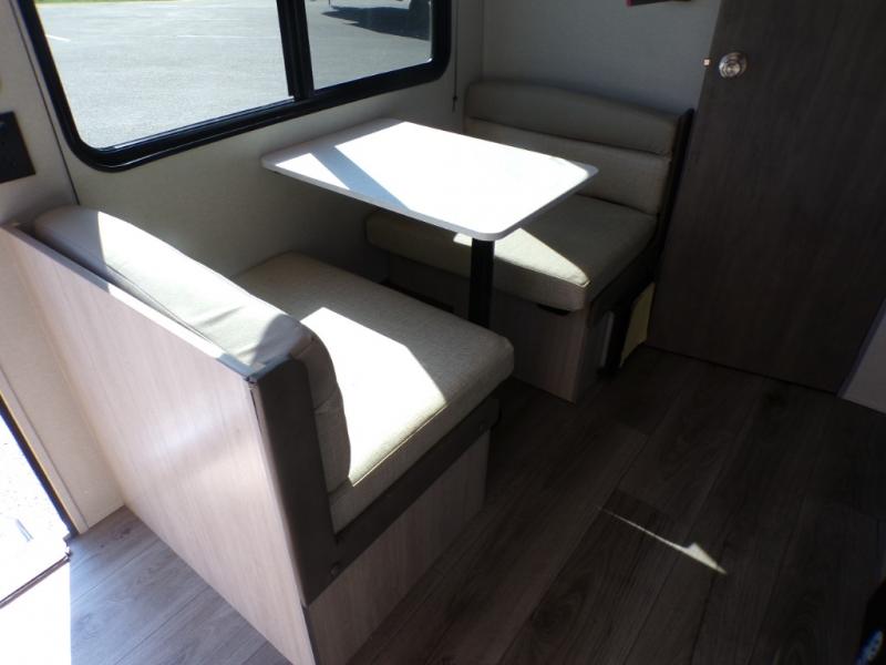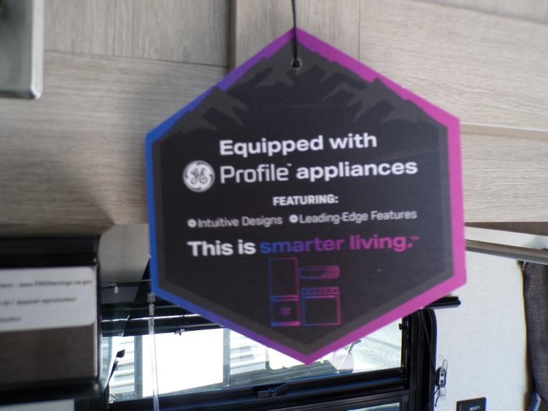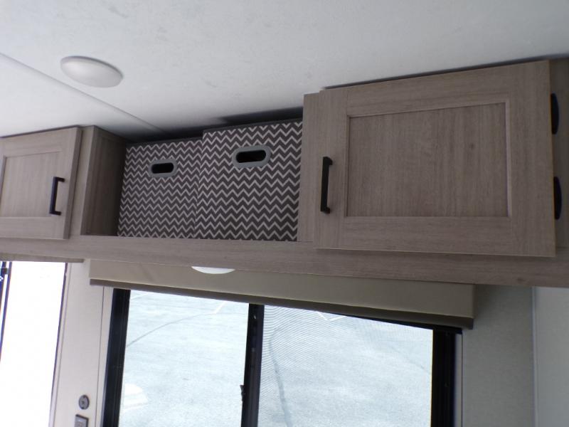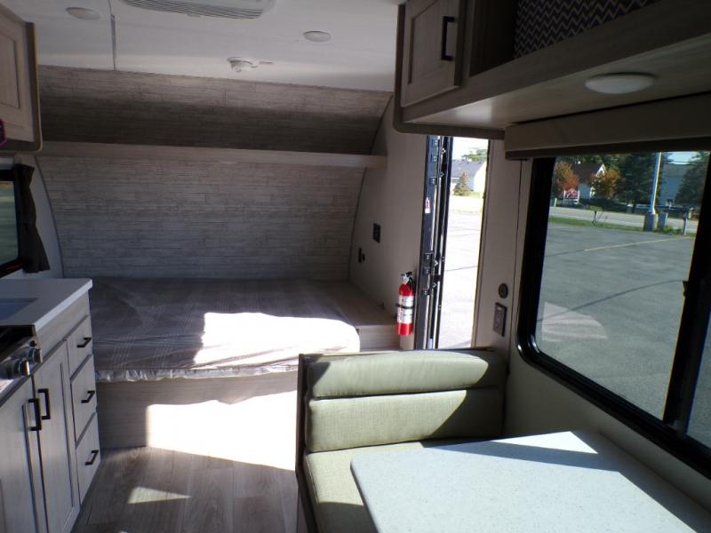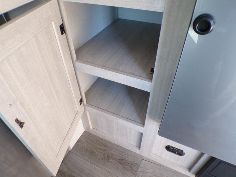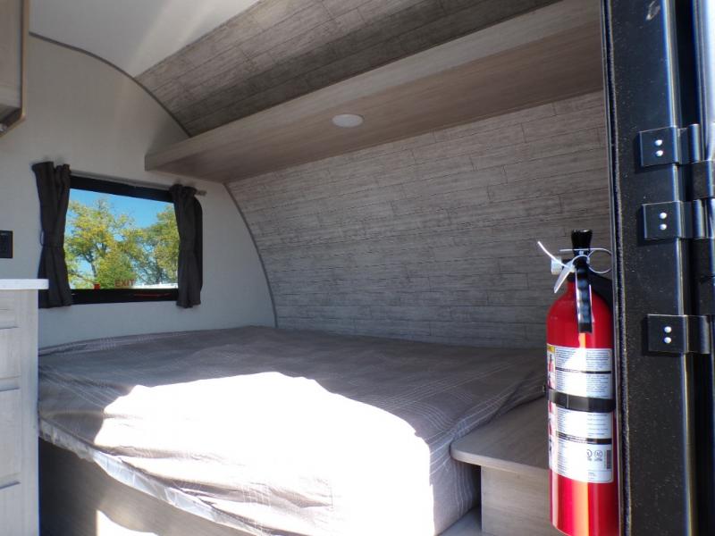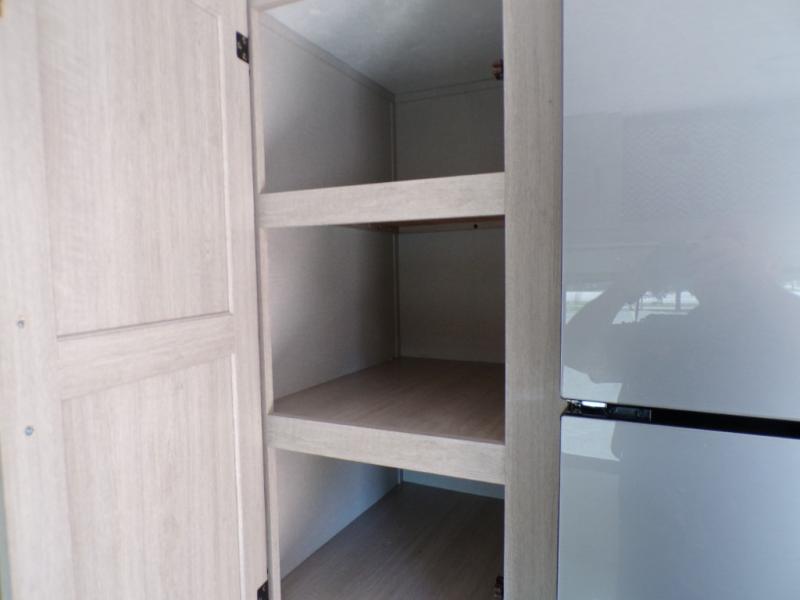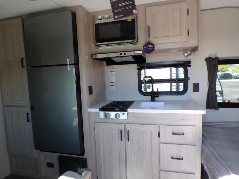 This couple's trailer will be perfect for all your outdoor adventures! There is a 60" x 74" Murphy bed up front with dual nightstands to keep your things tidy, and in the morning, you can fold up the bed to relax on the sofa. The bar top with two stools also includes storage below, plus there is a pantry and overhead storage for even more storage space. A full rear bath includes a 36" x 30" shower, a 12V 14" bath power vent fan, a marine toilet with foot flush, plus a linen closet to keep clean towels close by. This model also includes full kitchen amenities, including a GE two burner cooktop, a GE stainless microwave oven, plus a 3.3 cu. ft. 12V refrigerator to keep food fresh!