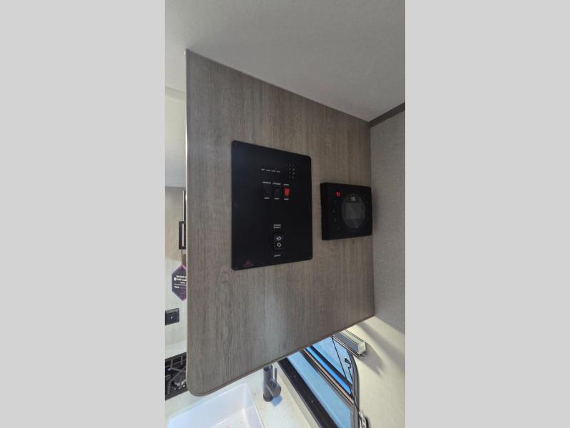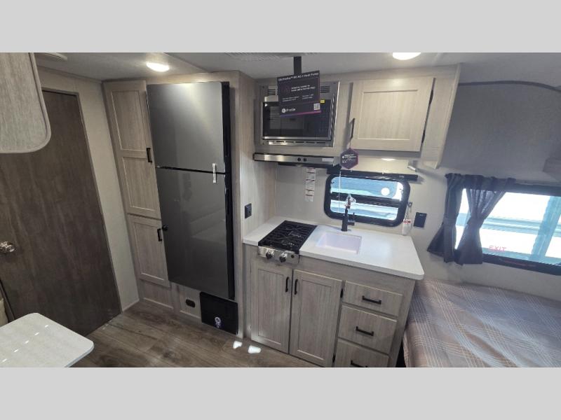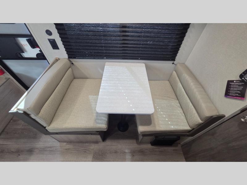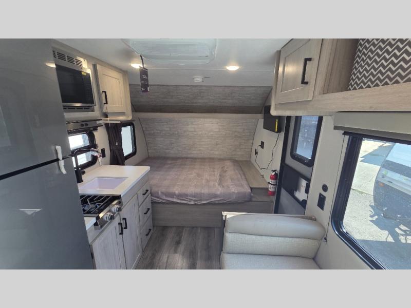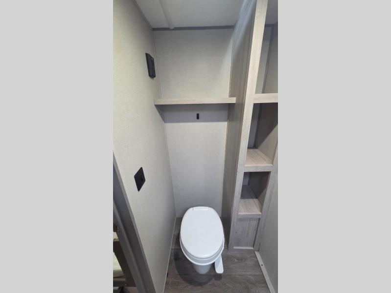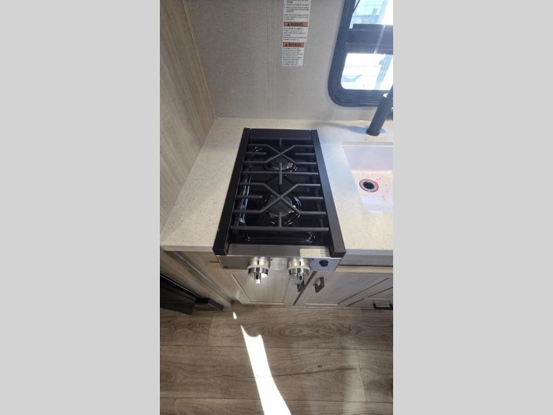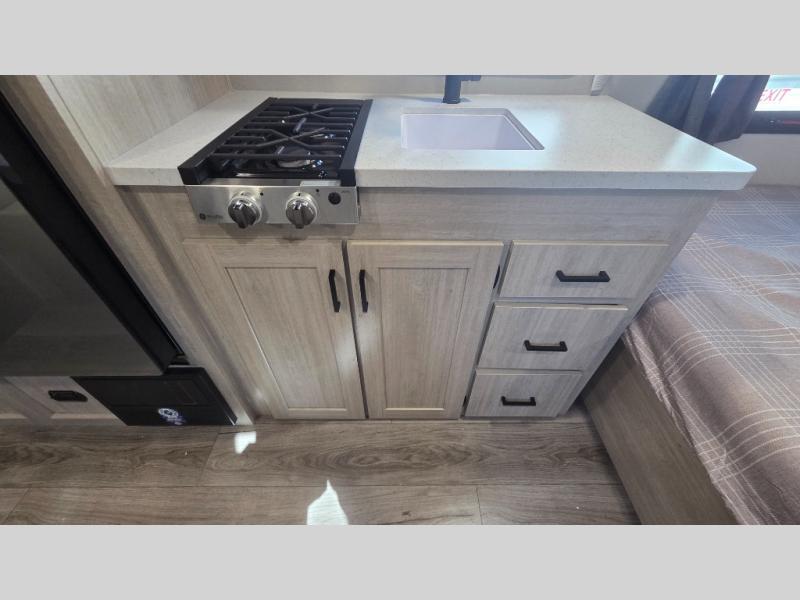 This couple's trailer will be perfect for all your outdoor adventures! There is a 60" x 74" Murphy bed up front with dual nightstands to keep your things tidy, and in the morning, you can fold up the bed to relax on the sofa. The bar top with two stools also includes storage below, plus there is a pantry and overhead storage for even more storage space. A full rear bath includes a 36" x 30" shower, a 12V 14" bath power vent fan, a marine toilet with foot flush, plus a linen closet to keep clean towels close by. This model also includes full kitchen amenities, including a GE two burner cooktop, a GE stainless microwave oven, plus a 3.3 cu. ft. 12V refrigerator to keep food fresh!