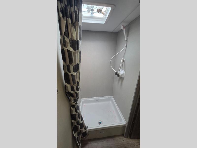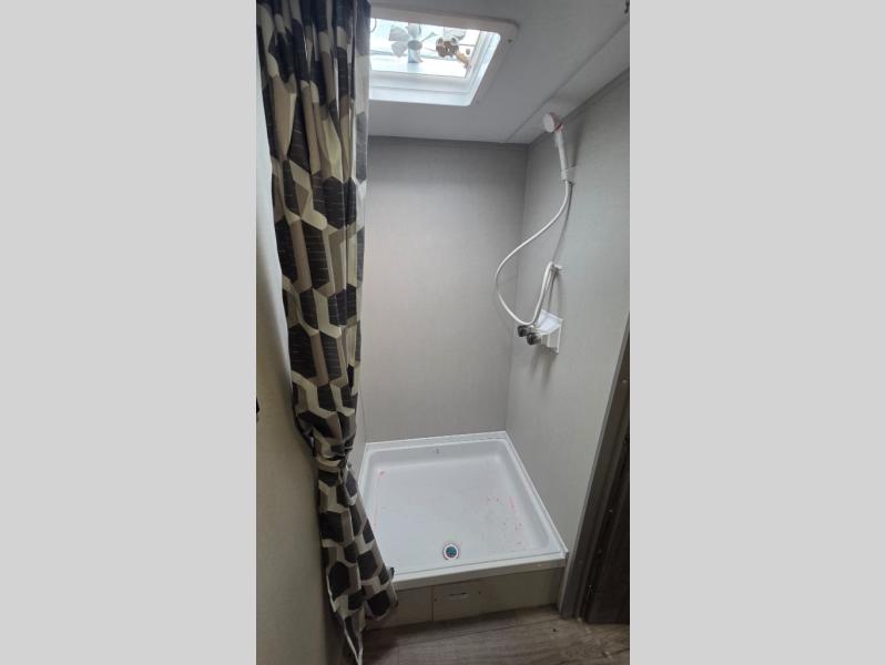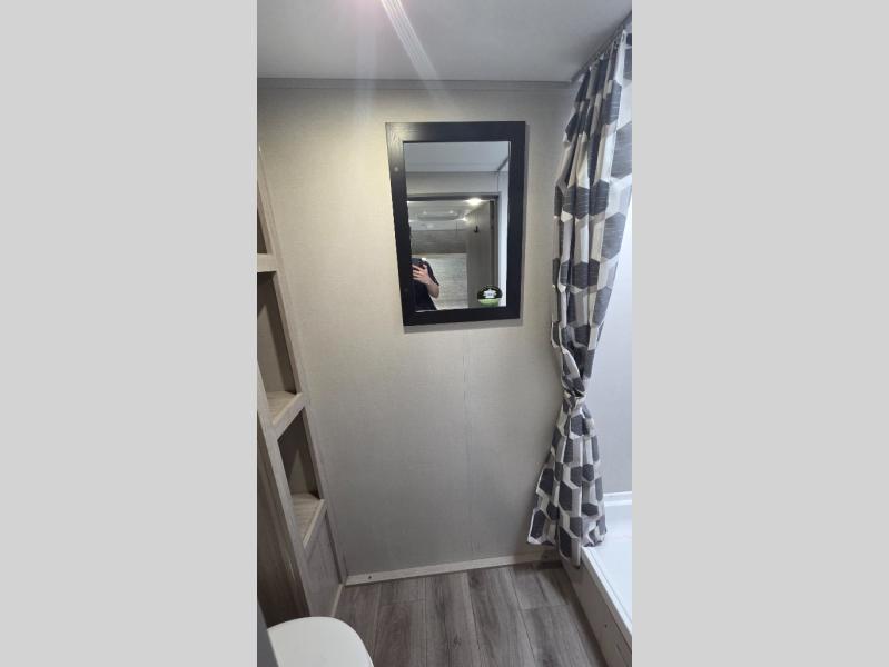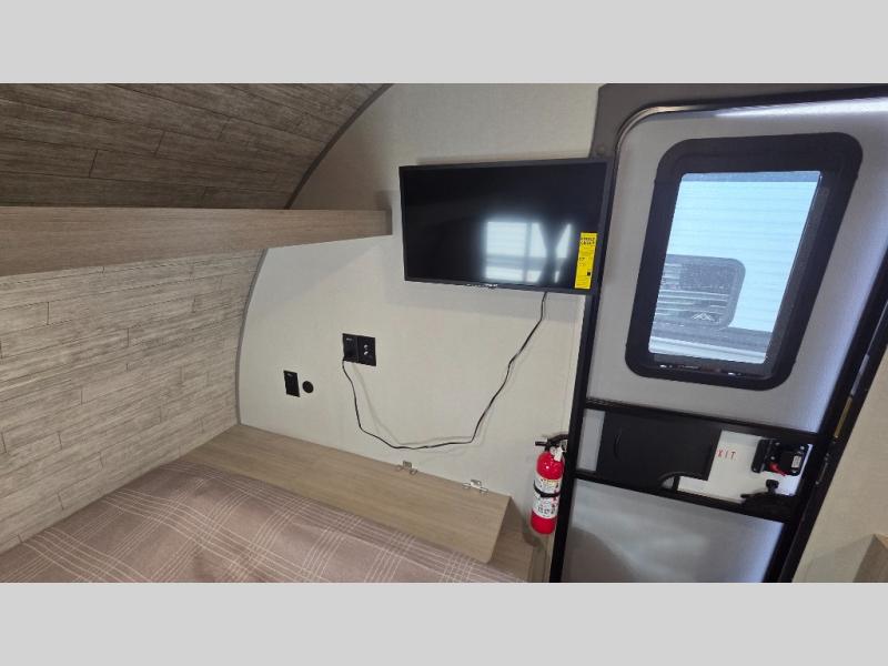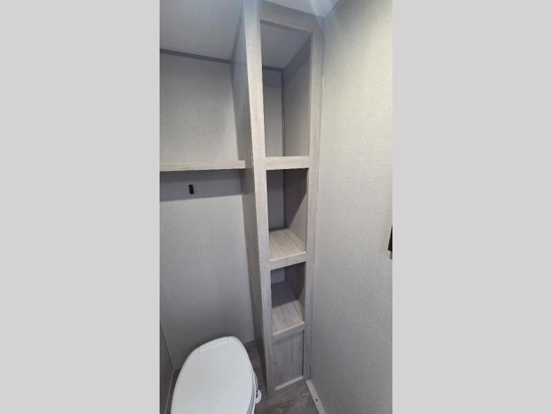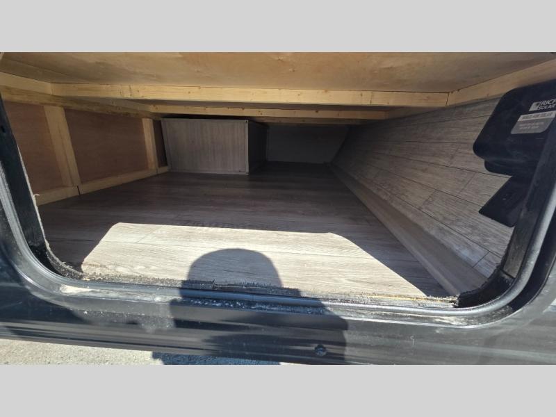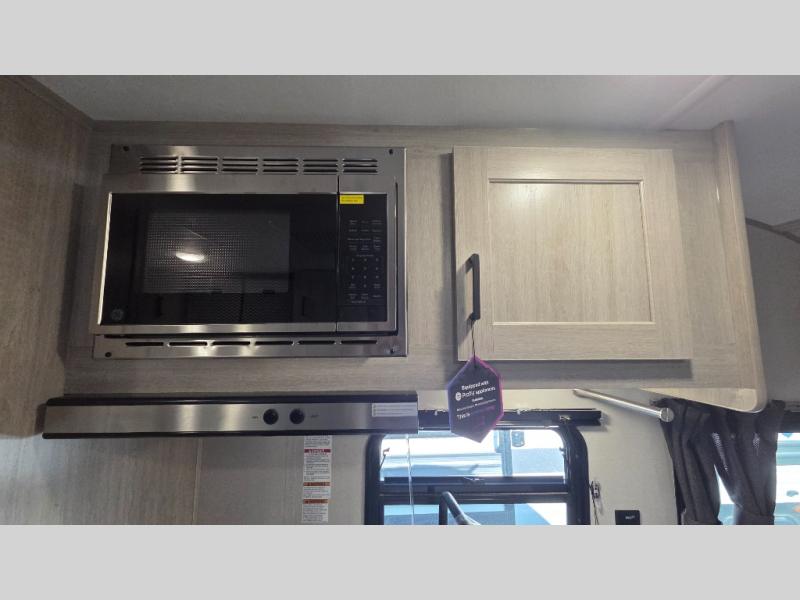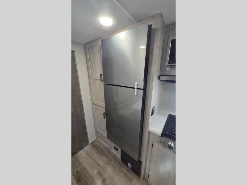 This couple's trailer will be perfect for all your outdoor adventures! There is a 60" x 74" Murphy bed up front with dual nightstands to keep your things tidy, and in the morning, you can fold up the bed to relax on the sofa. The bar top with two stools also includes storage below, plus there is a pantry and overhead storage for even more storage space. A full rear bath includes a 36" x 30" shower, a 12V 14" bath power vent fan, a marine toilet with foot flush, plus a linen closet to keep clean towels close by. This model also includes full kitchen amenities, including a GE two burner cooktop, a GE stainless microwave oven, plus a 3.3 cu. ft. 12V refrigerator to keep food fresh!