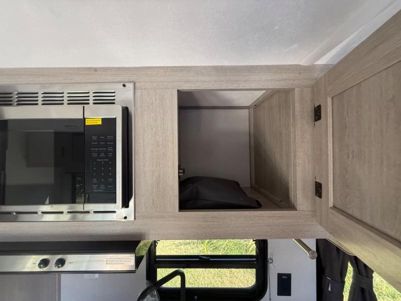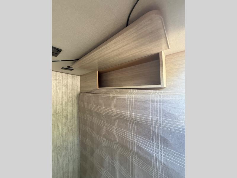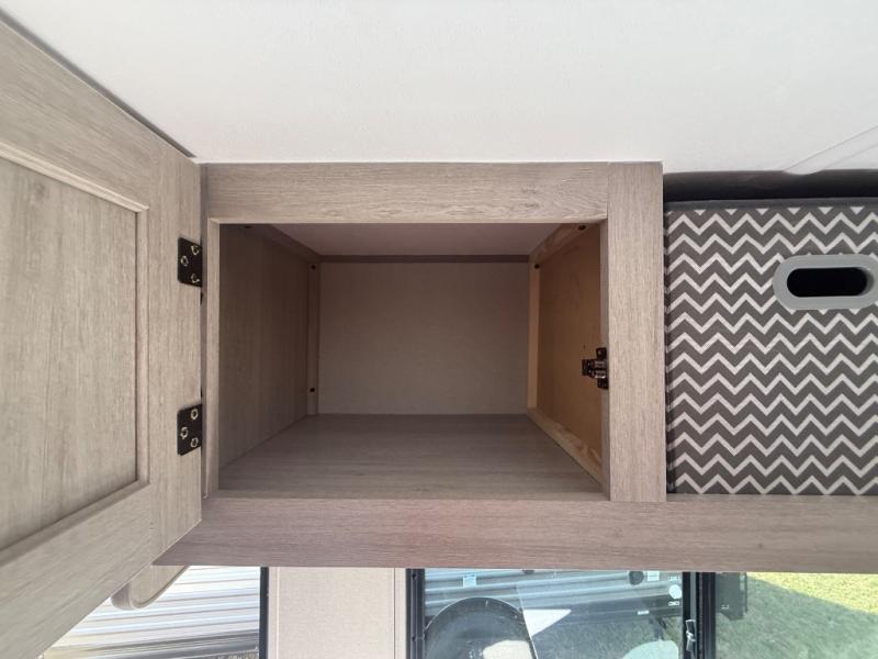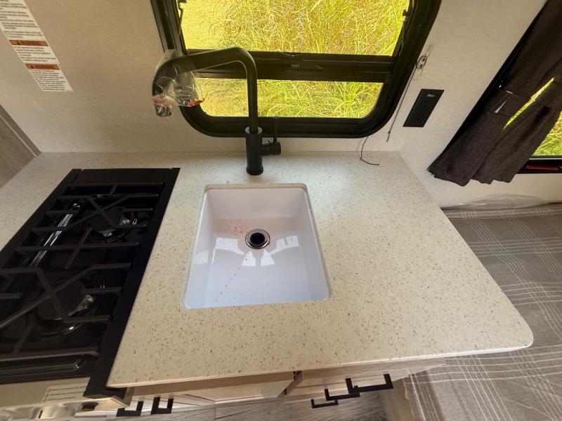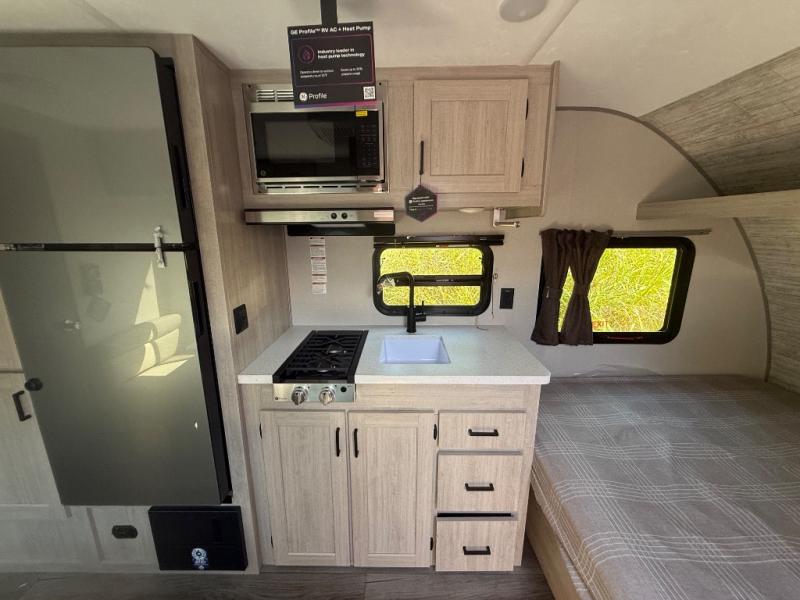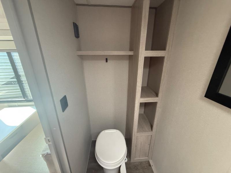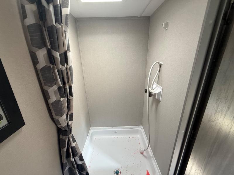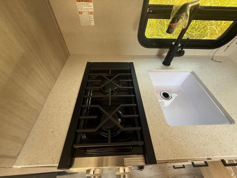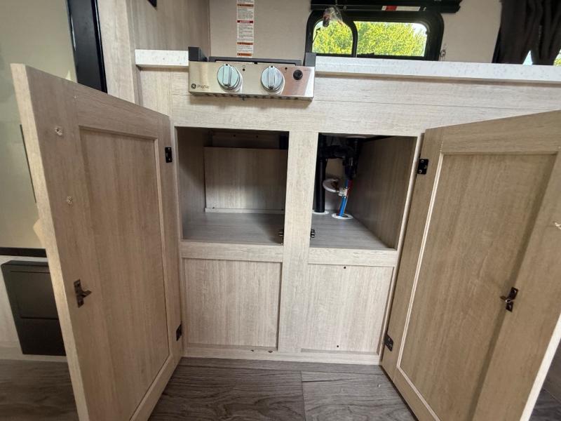 This couple's trailer will be perfect for all your outdoor adventures! There is a 60" x 74" Murphy bed up front with dual nightstands to keep your things tidy, and in the morning, you can fold up the bed to relax on the sofa. The bar top with two stools also includes storage below, plus there is a pantry and overhead storage for even more storage space. A full rear bath includes a 36" x 30" shower, a 12V 14" bath power vent fan, a marine toilet with foot flush, plus a linen closet to keep clean towels close by. This model also includes full kitchen amenities, including a GE two burner cooktop, a GE stainless microwave oven, plus a 3.3 cu. ft. 12V refrigerator to keep food fresh!
