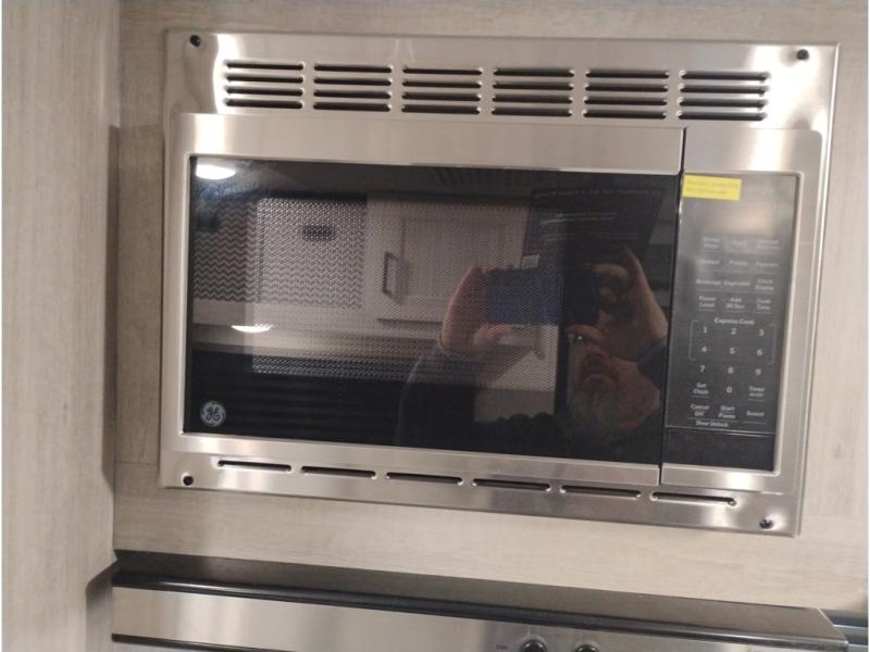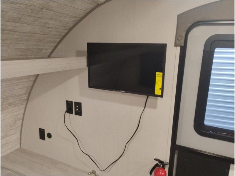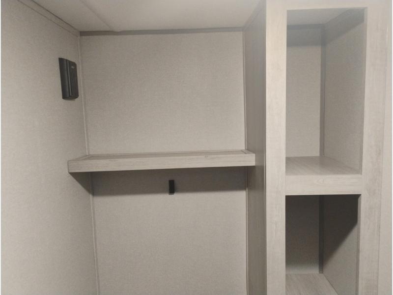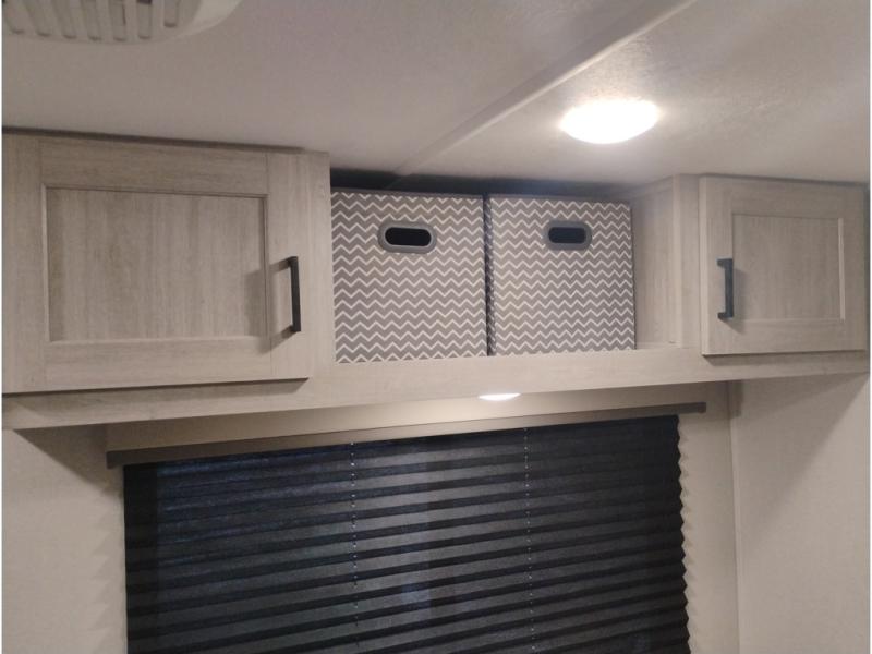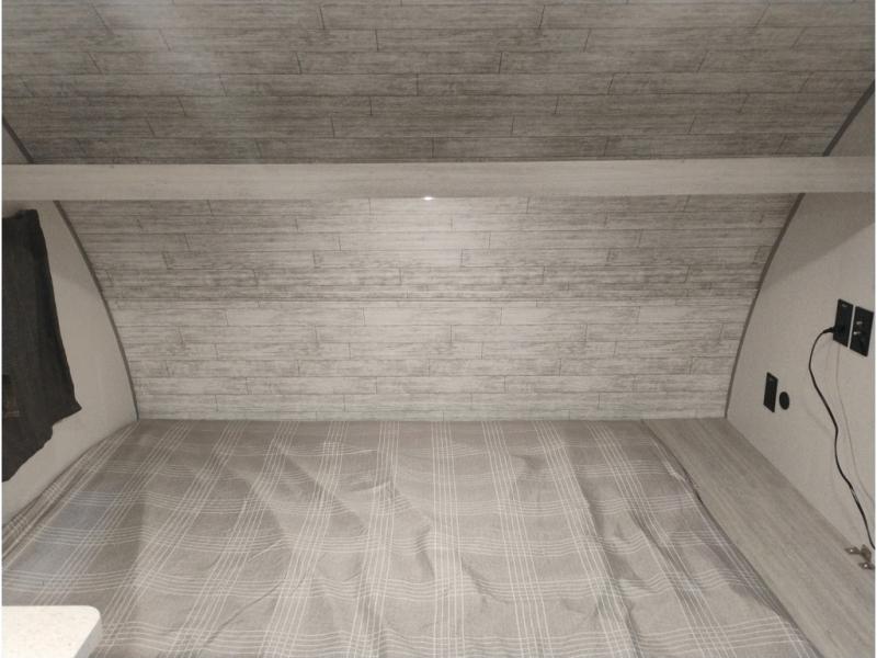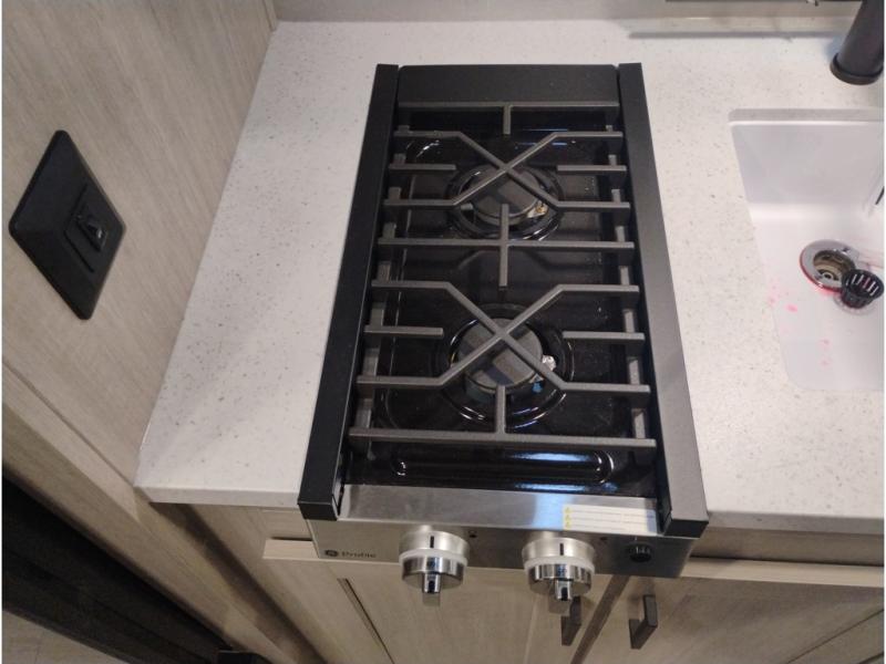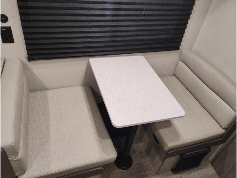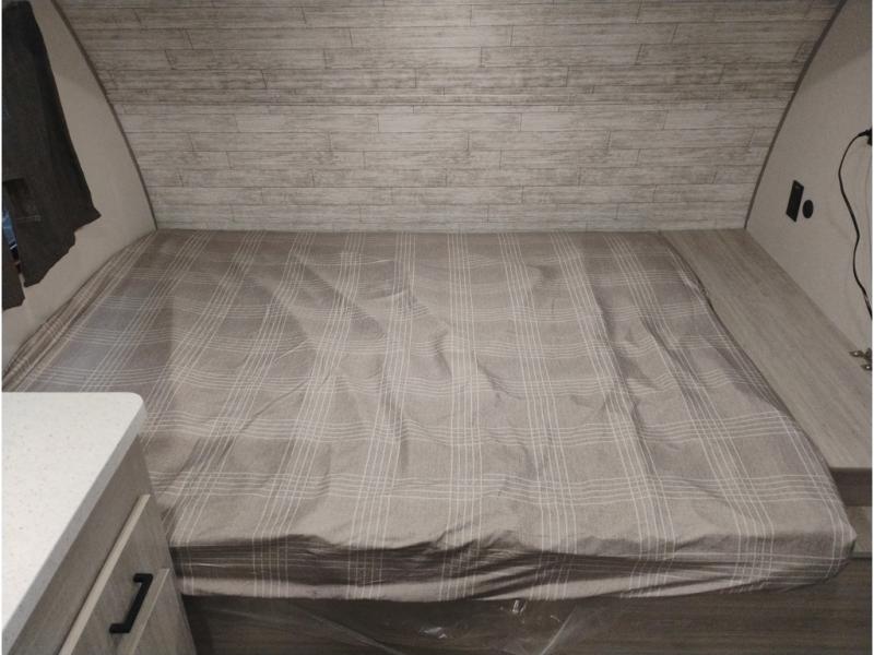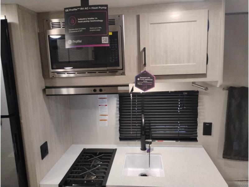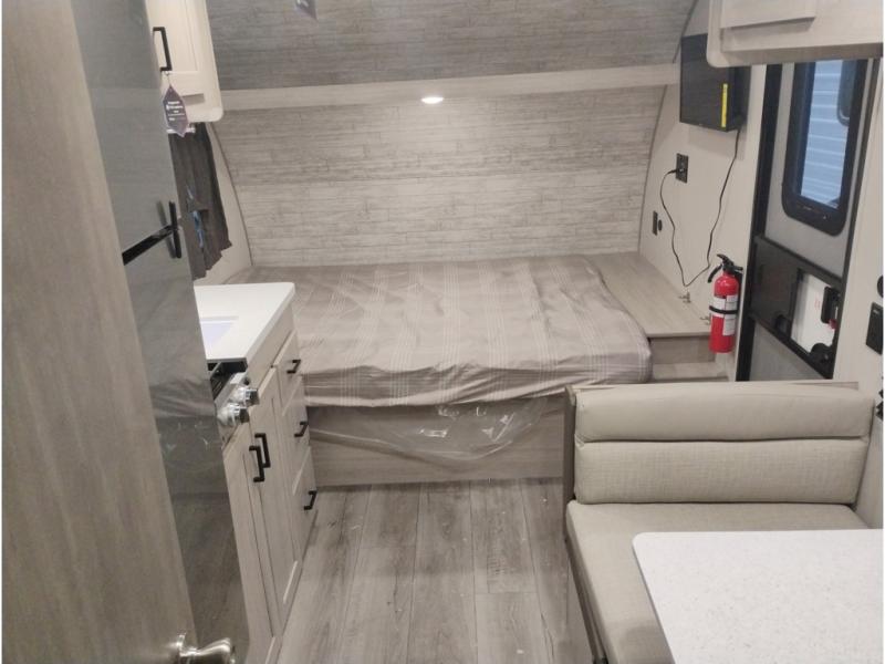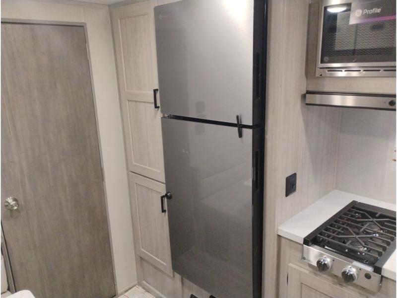 This couple's trailer will be perfect for all your outdoor adventures! There is a 60" x 74" Murphy bed up front with dual nightstands to keep your things tidy, and in the morning, you can fold up the bed to relax on the sofa. The bar top with two stools also includes storage below, plus there is a pantry and overhead storage for even more storage space. A full rear bath includes a 36" x 30" shower, a 12V 14" bath power vent fan, a marine toilet with foot flush, plus a linen closet to keep clean towels close by. This model also includes full kitchen amenities, including a GE two burner cooktop, a GE stainless microwave oven, plus a 3.3 cu. ft. 12V refrigerator to keep food fresh!