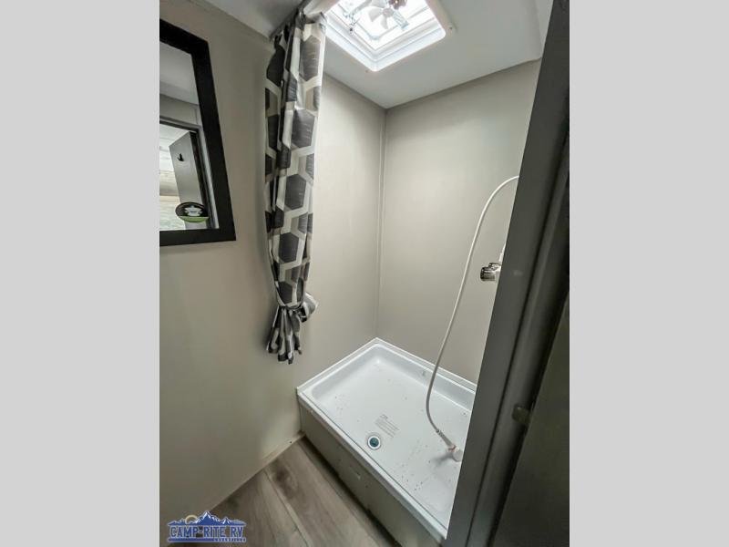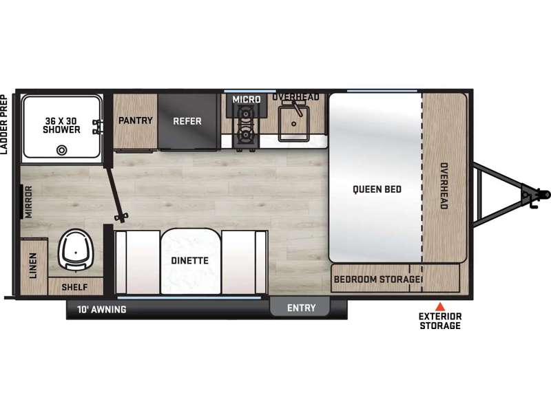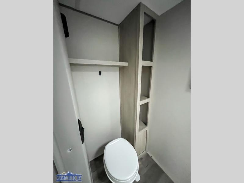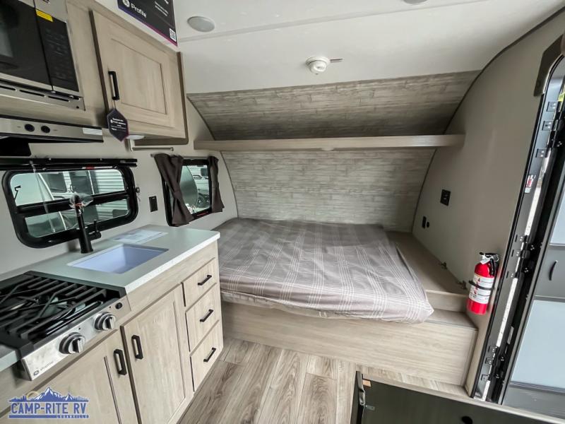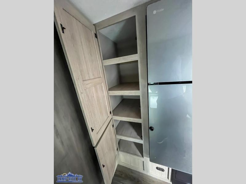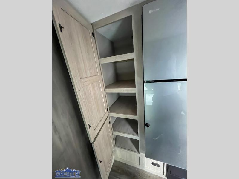 This couple's trailer will be perfect for all your outdoor adventures! There is a 60" x 74" Murphy bed up front with dual nightstands to keep your things tidy, and in the morning, you can fold up the bed to relax on the sofa. The bar top with two stools also includes storage below, plus there is a pantry and overhead storage for even more storage space. A full rear bath includes a 36" x 30" shower, a 12V 14" bath power vent fan, a marine toilet with foot flush, plus a linen closet to keep clean towels close by. This model also includes full kitchen amenities, including a GE two burner cooktop, a GE stainless microwave oven, plus a 3.3 cu. ft. 12V refrigerator to keep food fresh!