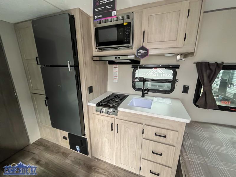 With any Catalina Summit Series 7' by Coachmen RV, you can create an easier adventure with the versatility and simplicity of the shorter lengths and lighter weights! Each includes a premium exterior graphics package, a smooth HD aluminum radius front, and EZ lube axles with leaf spring suspension. The exterior offers a heavy duty standard tongue jack, a diamond plate rock guard to protect against road debris, exterior RG-6 coax cabling and satellite prep, rear view camera prep, and flush mount baggage doors with radius corners for your outdoor gear. Inside, you will enjoy a premium JBL interior speaker, USB charging ports, seamless Thermofoil countertops throughout, a deep basin farm style sink for easy cleanup, and GE kitchen appliances. It's time to choose an affordable and maneuverable single axle trailer today!