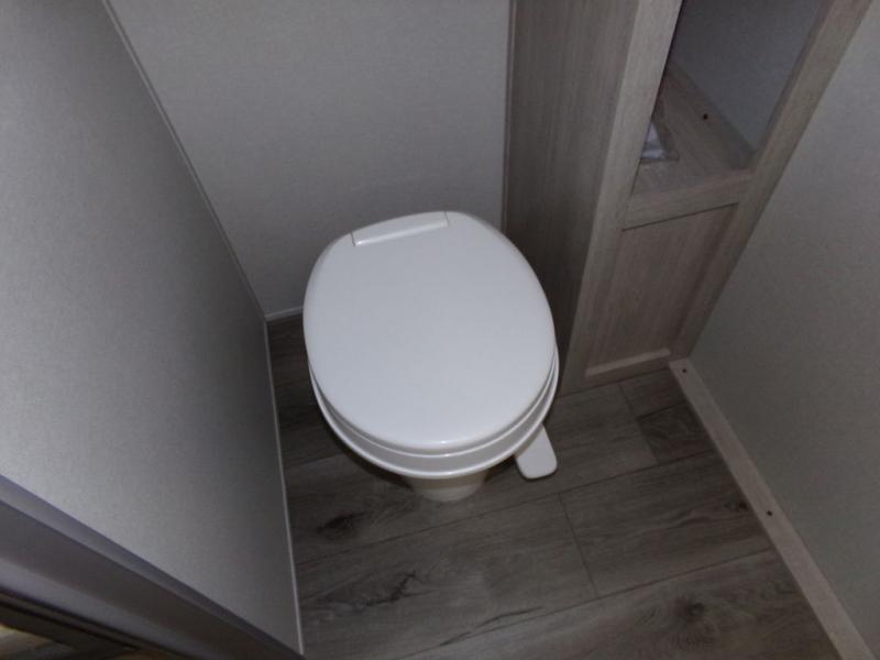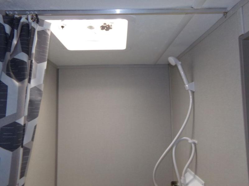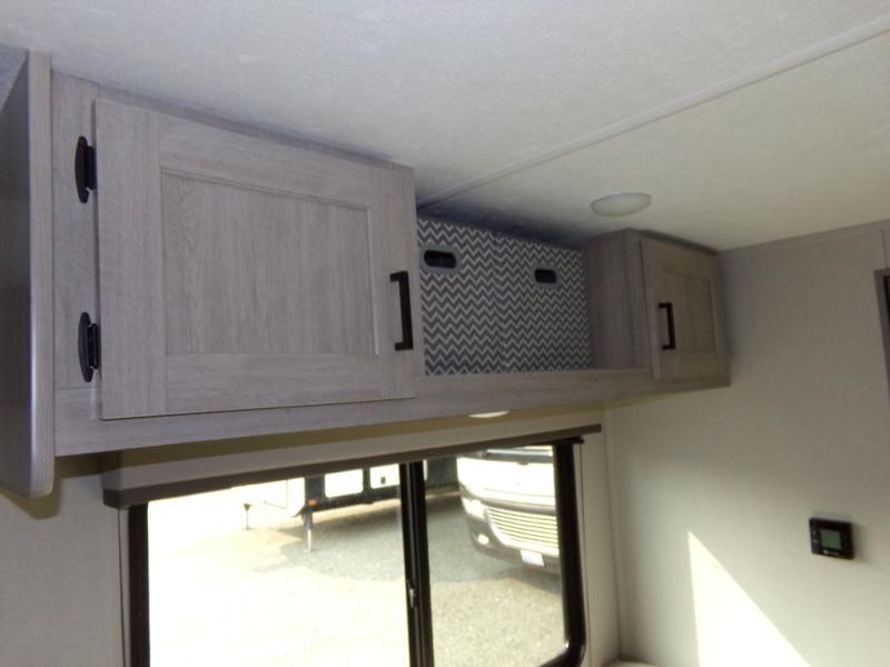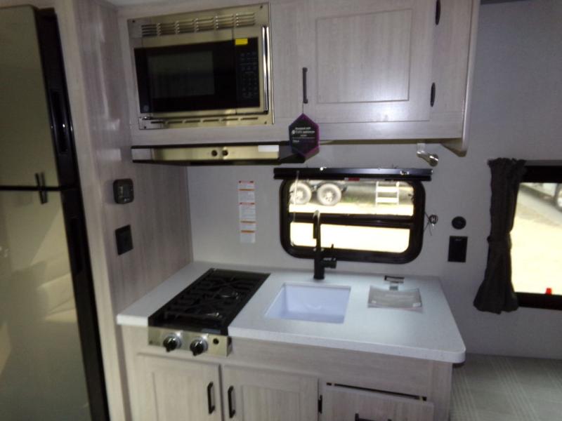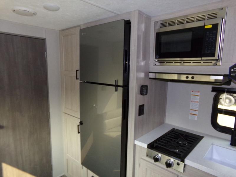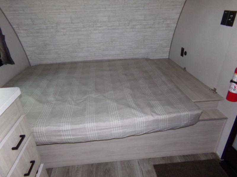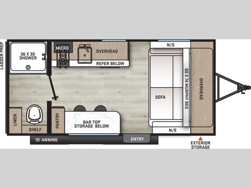 This couple's trailer will be perfect for all your outdoor adventures! There is a 60" x 74" Murphy bed up front with dual nightstands to keep your things tidy, and in the morning, you can fold up the bed to relax on the sofa. The bar top with two stools also includes storage below, plus there is a pantry and overhead storage for even more storage space. A full rear bath includes a 36" x 30" shower, a 12V 14" bath power vent fan, a marine toilet with foot flush, plus a linen closet to keep clean towels close by. This model also includes full kitchen amenities, including a GE two burner cooktop, a GE stainless microwave oven, plus a 3.3 cu. ft. 12V refrigerator to keep food fresh!