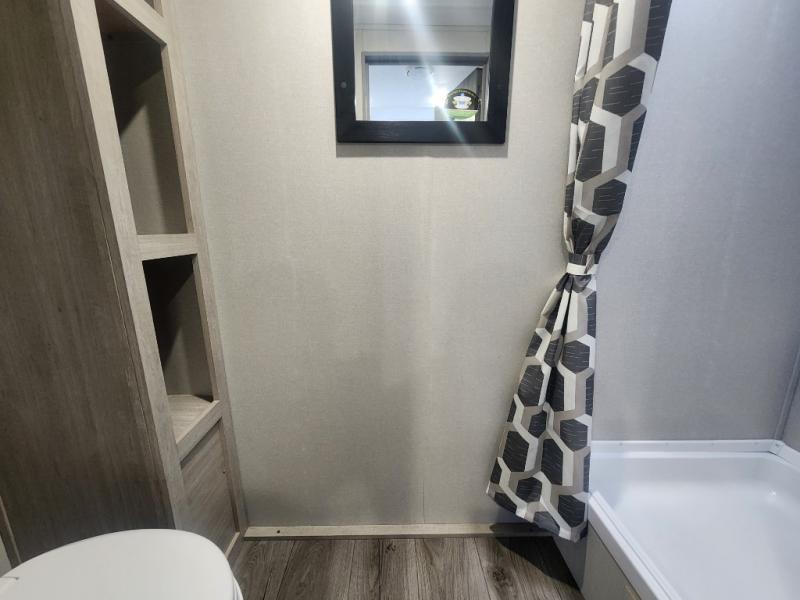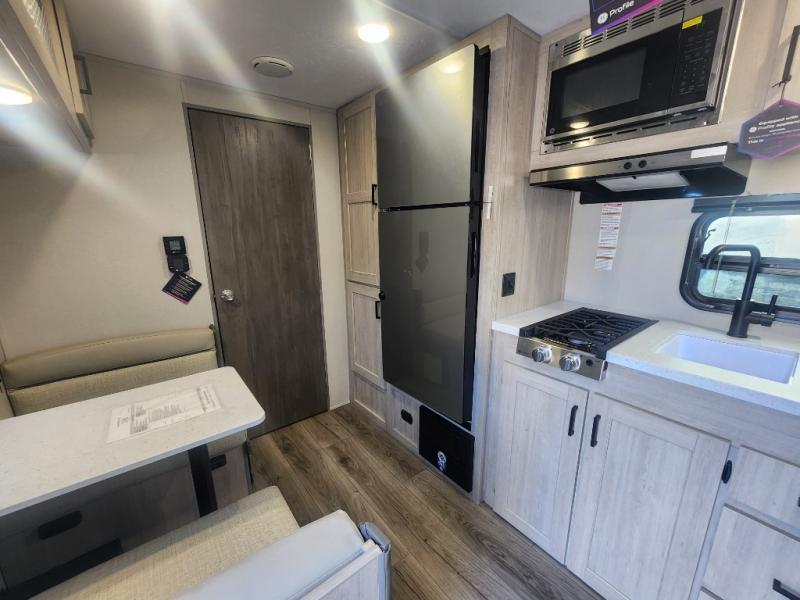 This couple's trailer will be perfect for all your outdoor adventures! There is a queen bed up front with overhead and bedroom storage to keep things tidy. The booth dinette will serve as a great place to enjoy your morning coffee plus there is a pantry and overhead storage in the kitchen for all your goods. A full rear bath includes a 36" x 30" shower, a marine toilet with foot flush, plus a linen closet to keep clean towels close by. This model also includes full kitchen amenities, including a GE two burner cooktop, a GE stainless microwave oven, plus a 3.3 cu. ft. 12V refrigerator to keep food fresh!