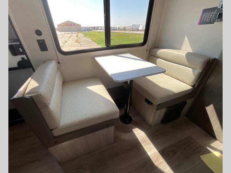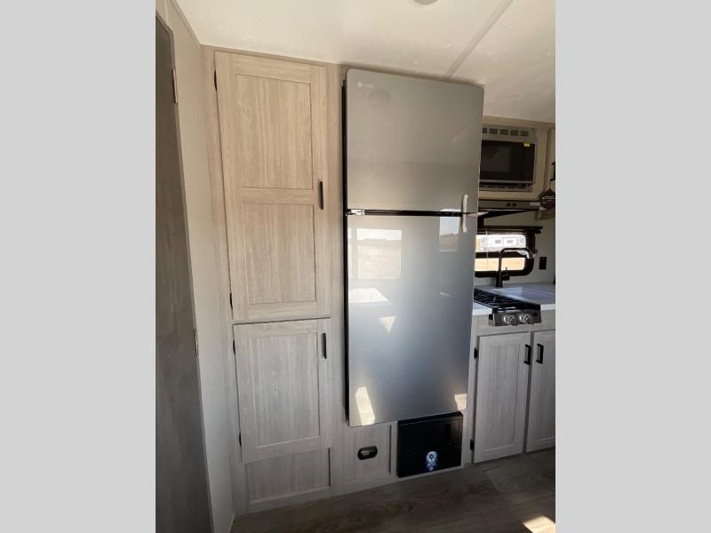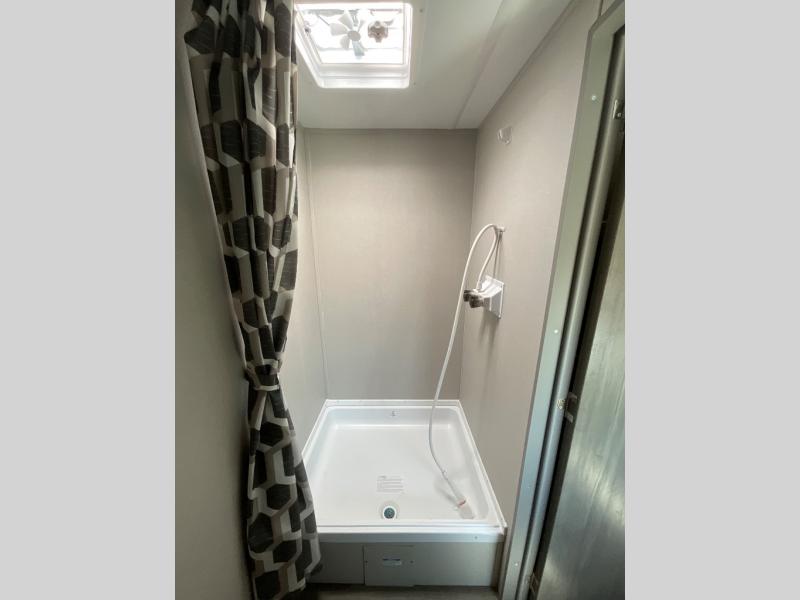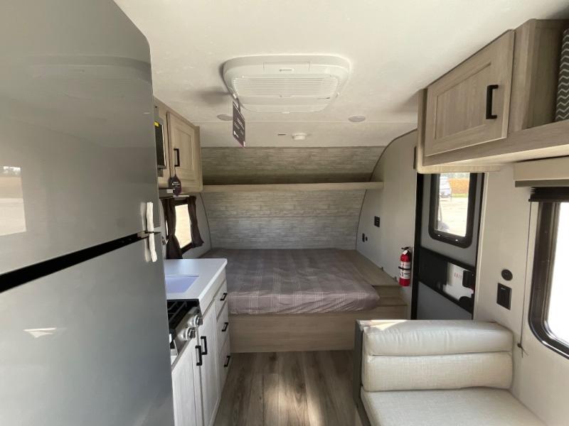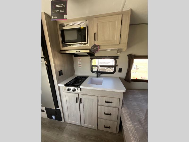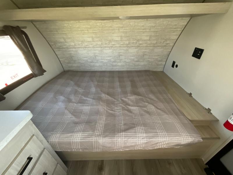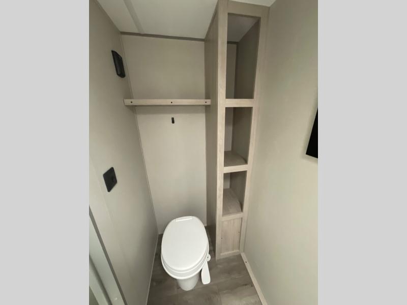 This couple's trailer will be perfect for all your outdoor adventures! There is a 60" x 74" Murphy bed up front with dual nightstands to keep your things tidy, and in the morning, you can fold up the bed to relax on the sofa. The bar top with two stools also includes storage below, plus there is a pantry and overhead storage for even more storage space. A full rear bath includes a 36" x 30" shower, a 12V 14" bath power vent fan, a marine toilet with foot flush, plus a linen closet to keep clean towels close by. This model also includes full kitchen amenities, including a GE two burner cooktop, a GE stainless microwave oven, plus a 3.3 cu. ft. 12V refrigerator to keep food fresh!