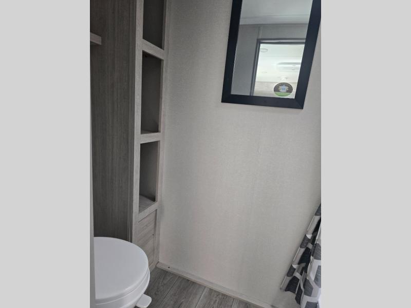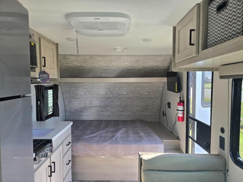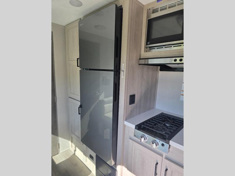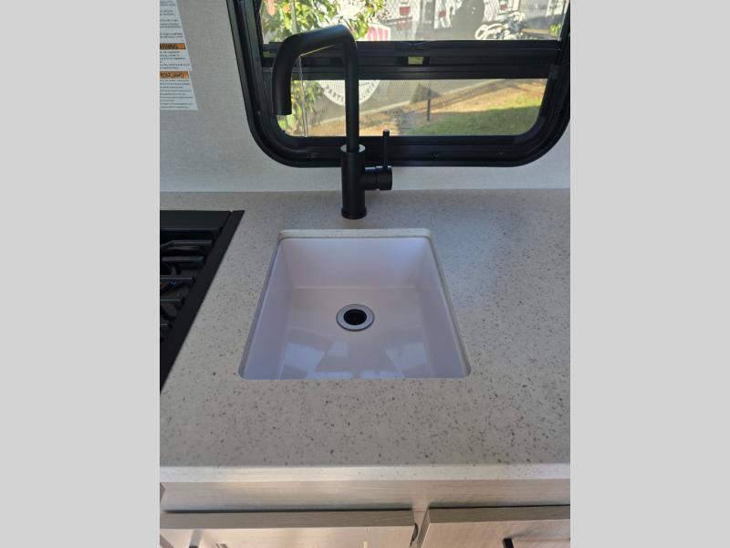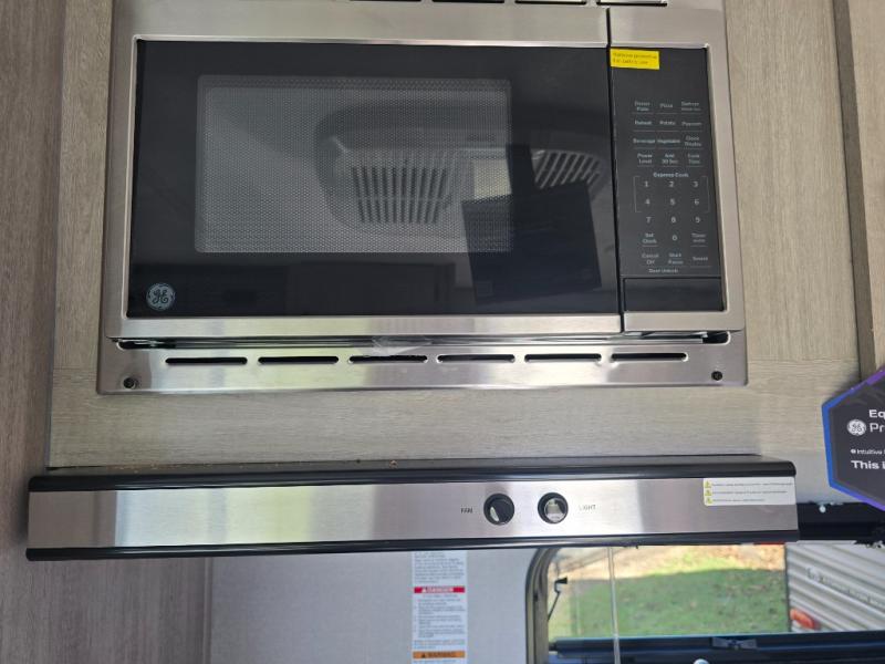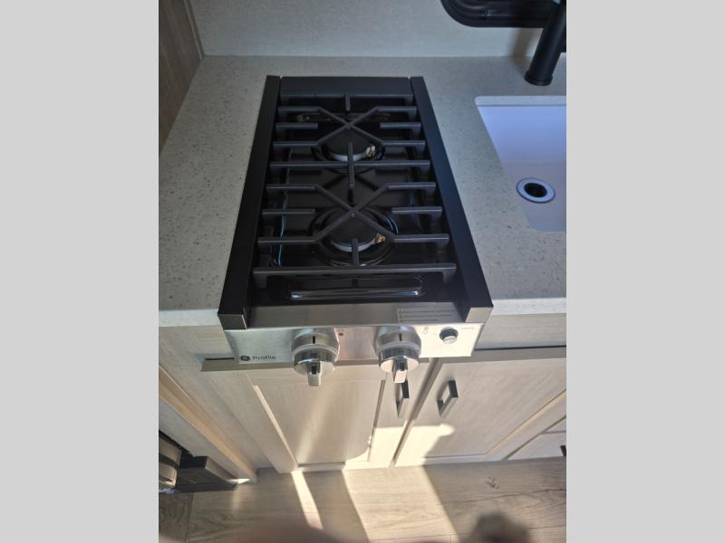 This couple's trailer will be perfect for all your outdoor adventures! There is a queen bed up front with overhead and bedroom storage to keep things tidy. The booth dinette will serve as a great place to enjoy your morning coffee plus there is a pantry and overhead storage in the kitchen for all your goods. A full rear bath includes a 36" x 30" shower, a marine toilet with foot flush, plus a linen closet to keep clean towels close by. This model also includes full kitchen amenities, including a GE two burner cooktop, a GE stainless microwave oven, plus a 3.3 cu. ft. 12V refrigerator to keep food fresh!