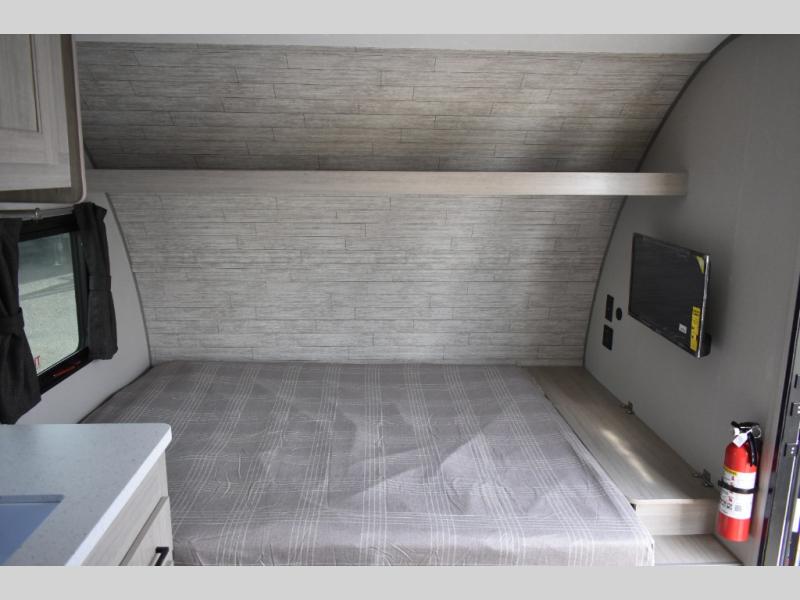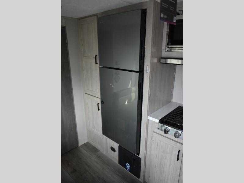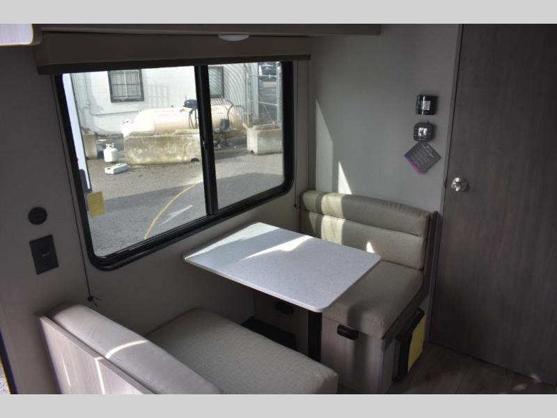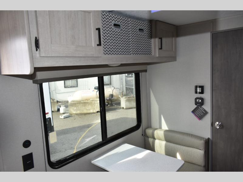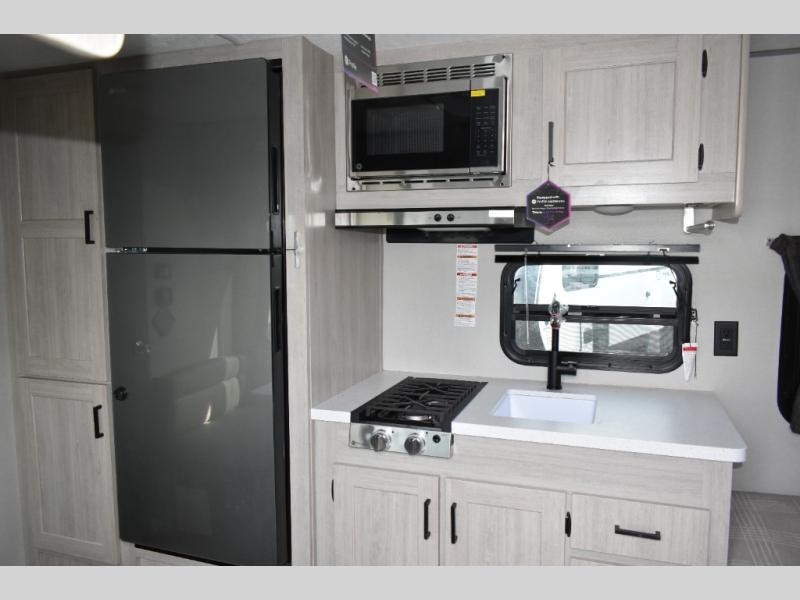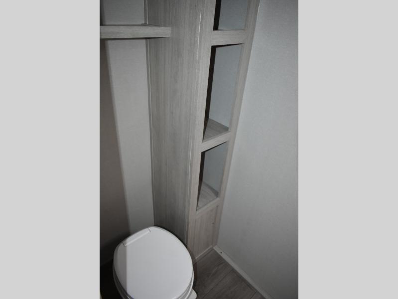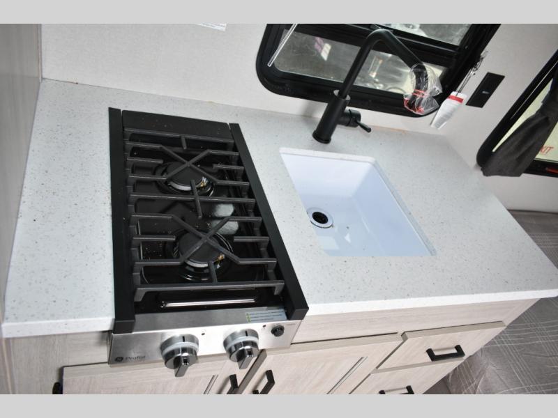 This couple's trailer will be perfect for all your outdoor adventures! There is a queen bed up front with overhead and bedroom storage to keep things tidy. The booth dinette will serve as a great place to enjoy your morning coffee plus there is a pantry and overhead storage in the kitchen for all your goods. A full rear bath includes a 36" x 30" shower, a marine toilet with foot flush, plus a linen closet to keep clean towels close by. This model also includes full kitchen amenities, including a GE two burner cooktop, a GE stainless microwave oven, plus a 3.3 cu. ft. 12V refrigerator to keep food fresh!