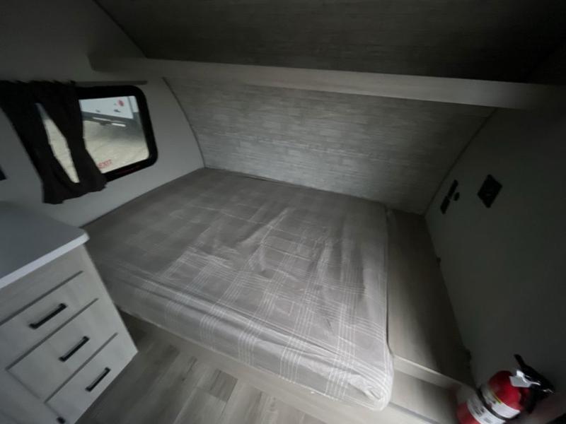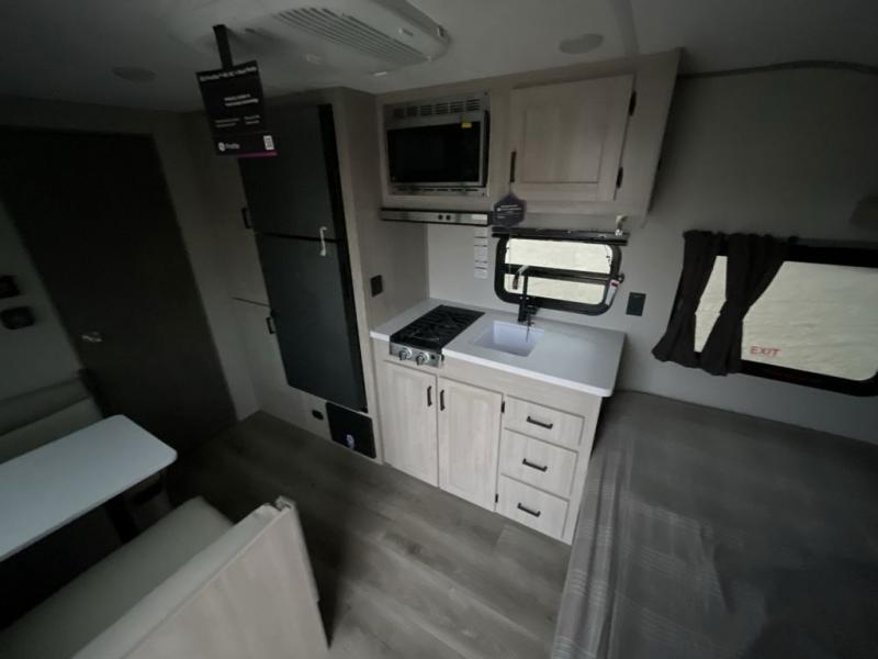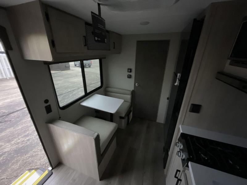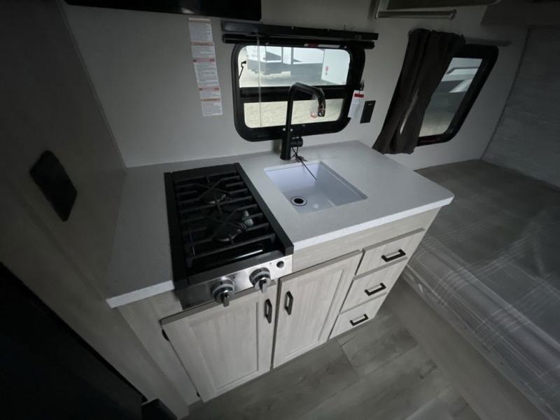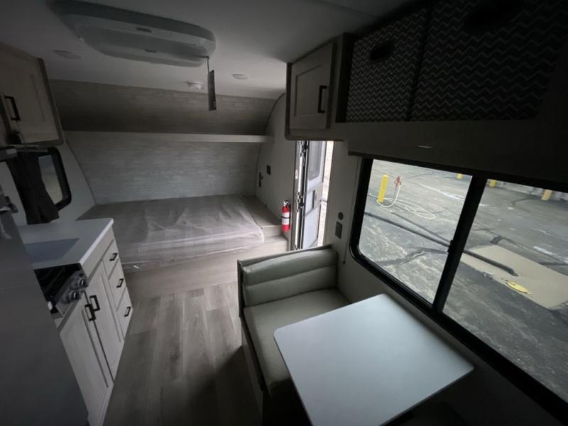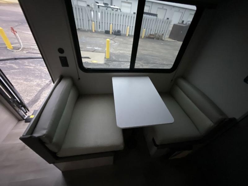This couple's trailer will be perfect for all your outdoor adventures! There is a queen bed up front with overhead and bedroom storage to keep things tidy. The booth dinette will serve as a great place to enjoy your morning coffee plus there is a pantry and overhead storage in the kitchen for all your goods. A full rear bath includes a 36" x 30" shower, a marine toilet with foot flush, plus a linen closet to keep clean towels close by. This model also includes full kitchen amenities, including a GE two burner cooktop, a GE stainless microwave oven, plus a 3.3 cu. ft. 12V refrigerator to keep food fresh!