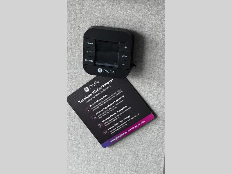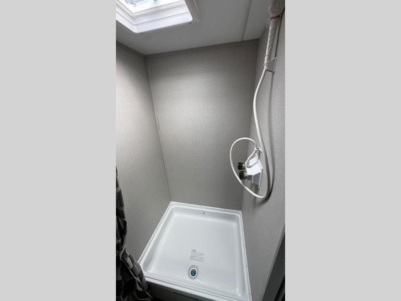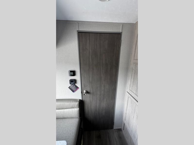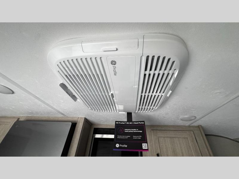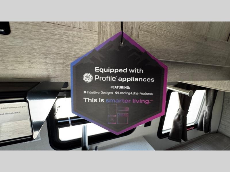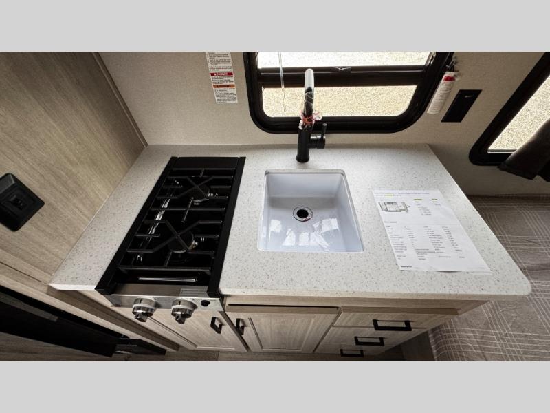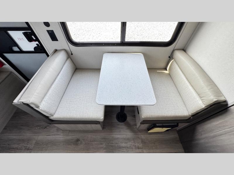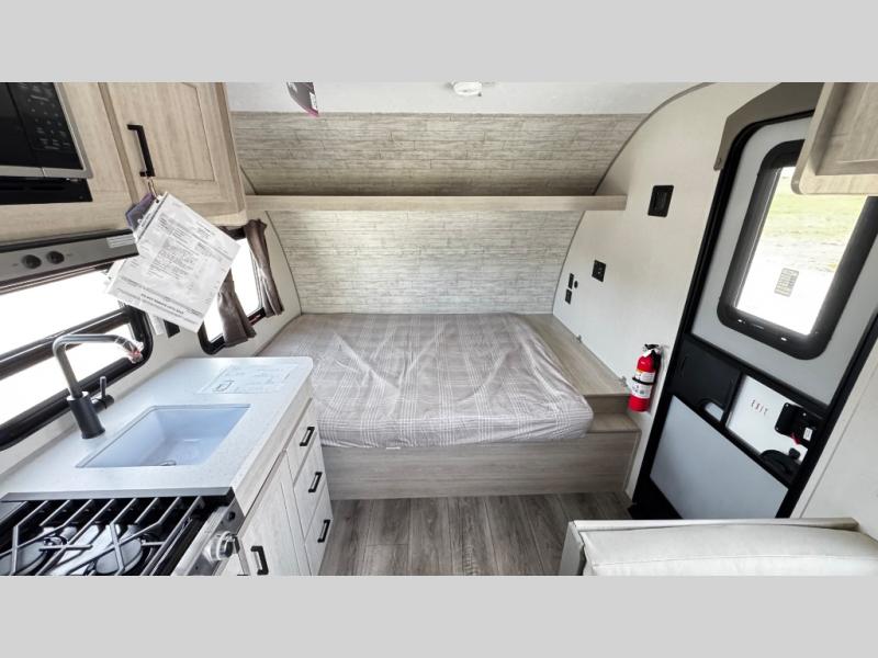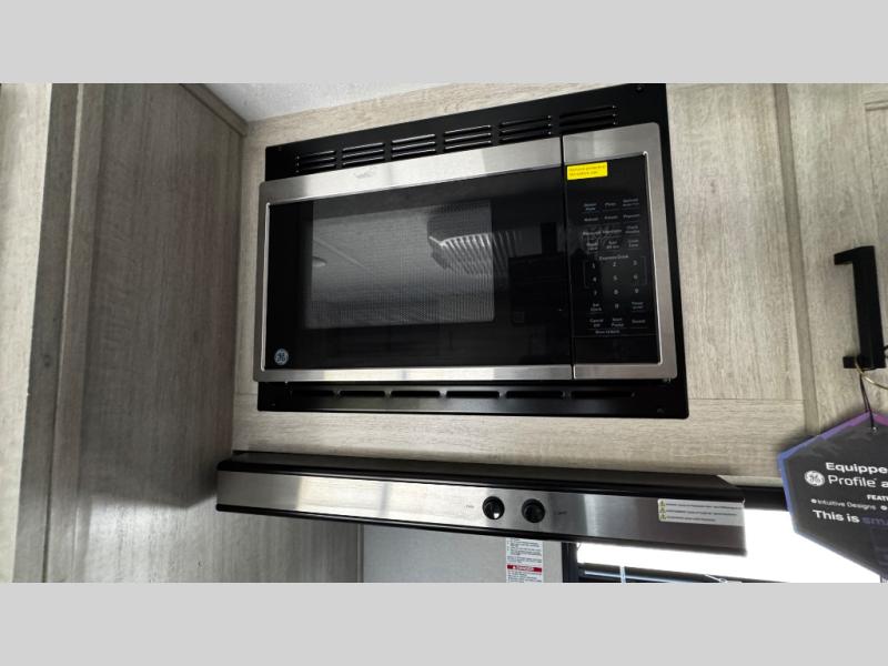 This couple's trailer will be perfect for all your outdoor adventures! There is a queen bed up front with overhead and bedroom storage to keep things tidy. The booth dinette will serve as a great place to enjoy your morning coffee plus there is a pantry and overhead storage in the kitchen for all your goods. A full rear bath includes a 36" x 30" shower, a marine toilet with foot flush, plus a linen closet to keep clean towels close by. This model also includes full kitchen amenities, including a GE two burner cooktop, a GE stainless microwave oven, plus a 3.3 cu. ft. 12V refrigerator to keep food fresh!