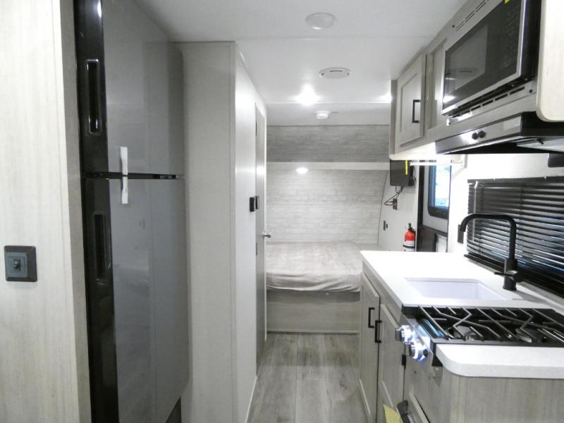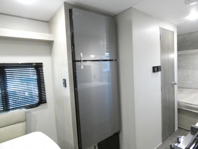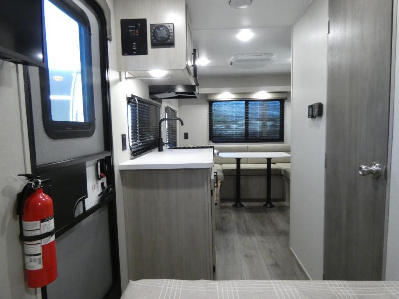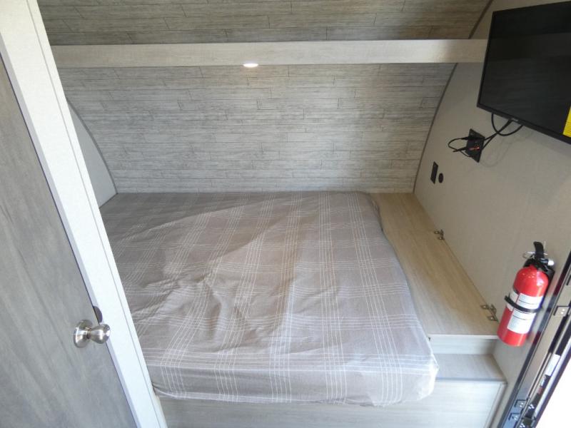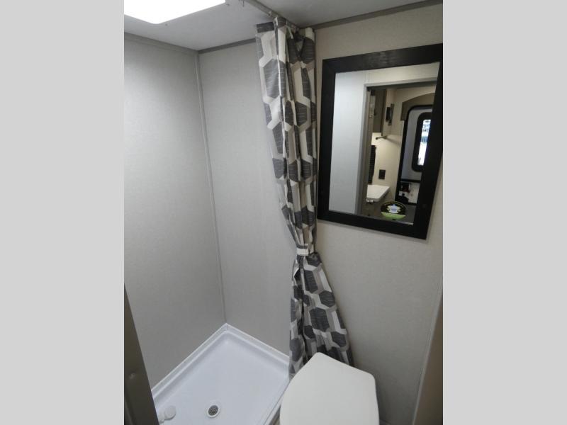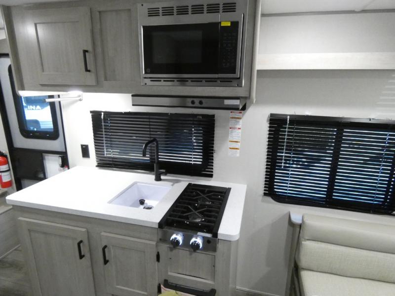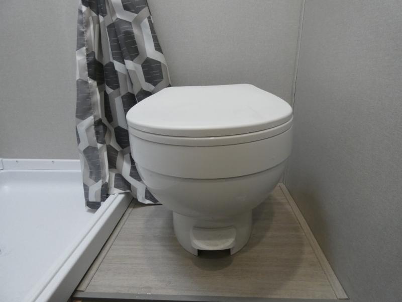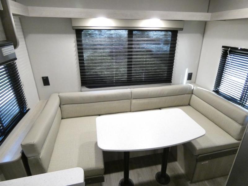 The perfect unit for a cozy weekend retreat for two or three! There is a queen bed up front with overhead storage and more at the foot of the bed to keep your things tidy. The rear of the unit offers a U-shaped dinette with an end table on one end and a handy overhead shelf which is a great spot for meals, watching TV or playing cards and games. A mid-coach bath includes a 36" x 30" shower and toilet with foot flush, plus a storage shelf for necessities. This model also includes a GE two burner cooktop, a GE stainless microwave oven, plus a 3.3 cu. ft. 12V refrigerator to keep food fresh!
