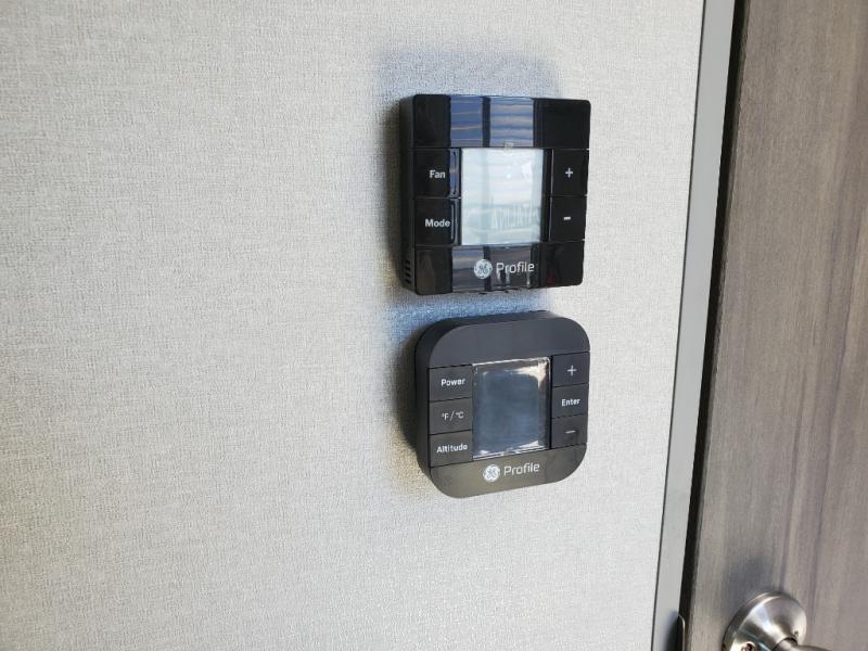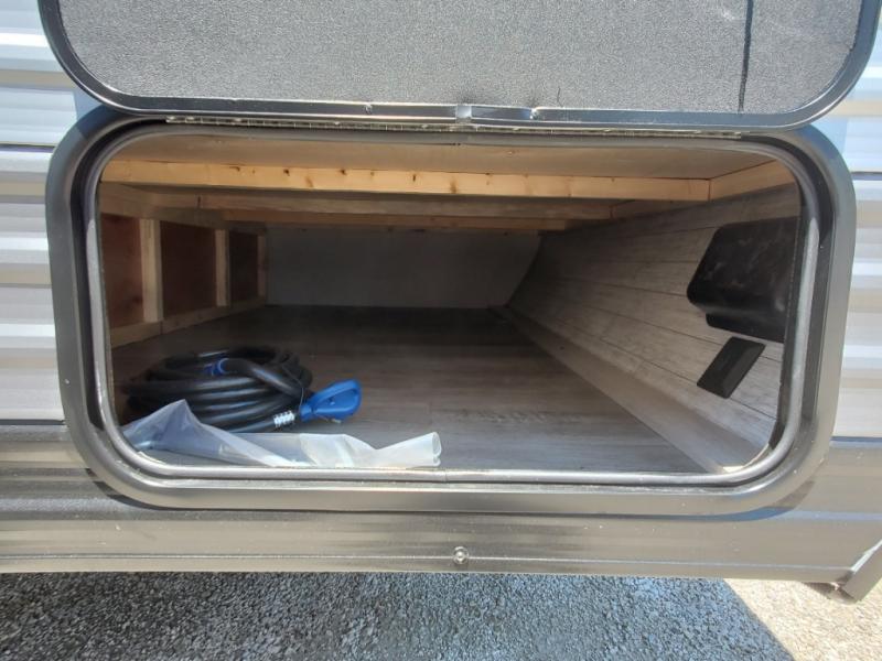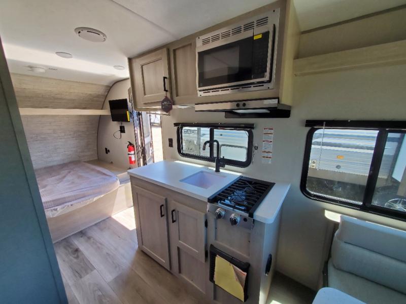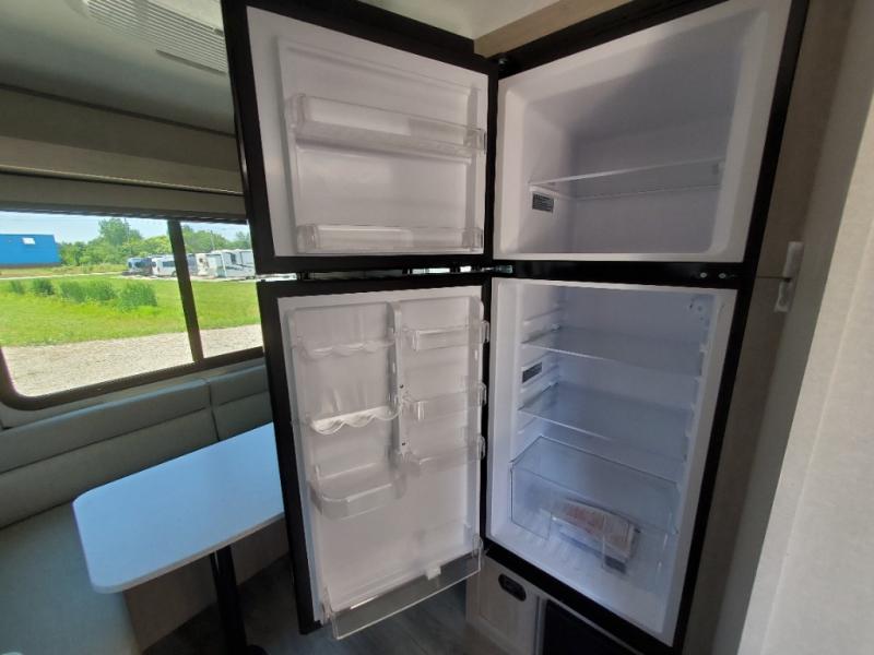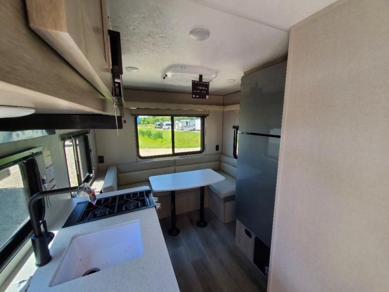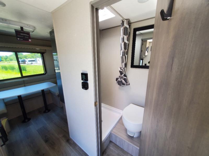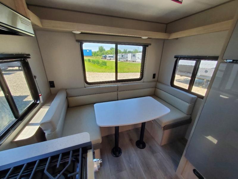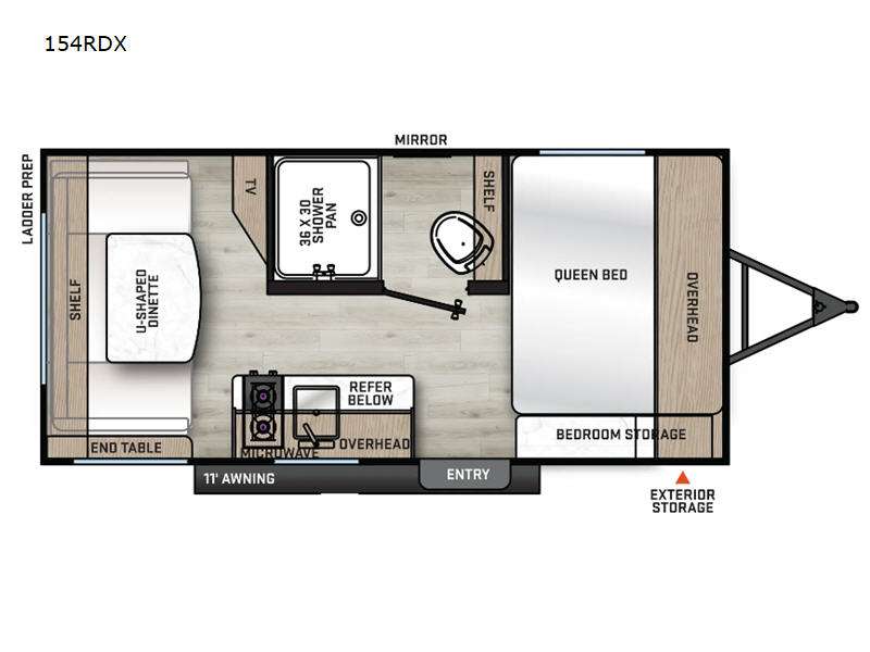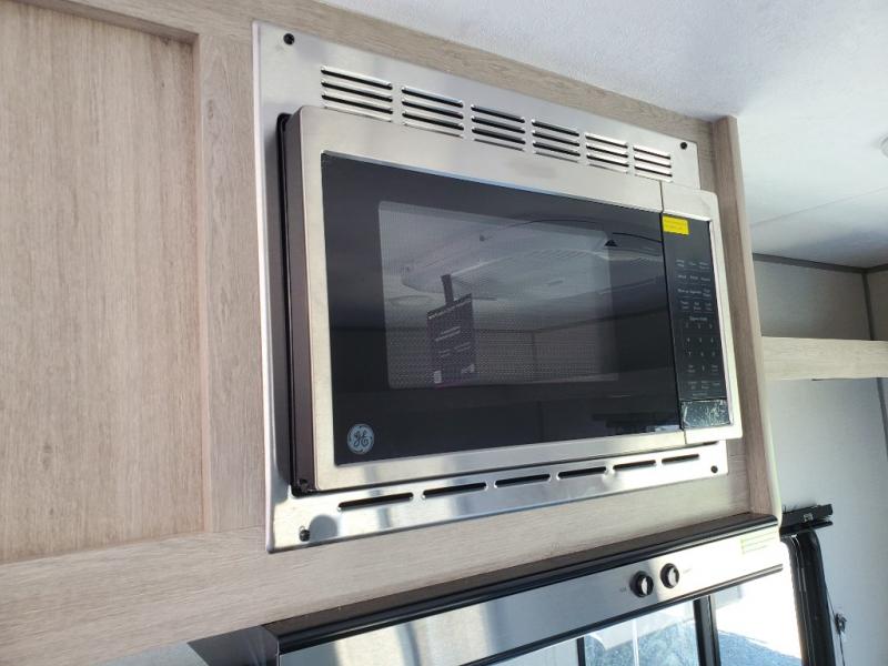 The perfect unit for a cozy weekend retreat for two or three! There is a queen bed up front with overhead storage and more at the foot of the bed to keep your things tidy. The rear of the unit offers a U-shaped dinette with an end table on one end and a handy overhead shelf which is a great spot for meals, watching TV or playing cards and games. A mid-coach bath includes a 36" x 30" shower and toilet with foot flush, plus a storage shelf for necessities. This model also includes a GE two burner cooktop, a GE stainless microwave oven, plus a 3.3 cu. ft. 12V refrigerator to keep food fresh!
