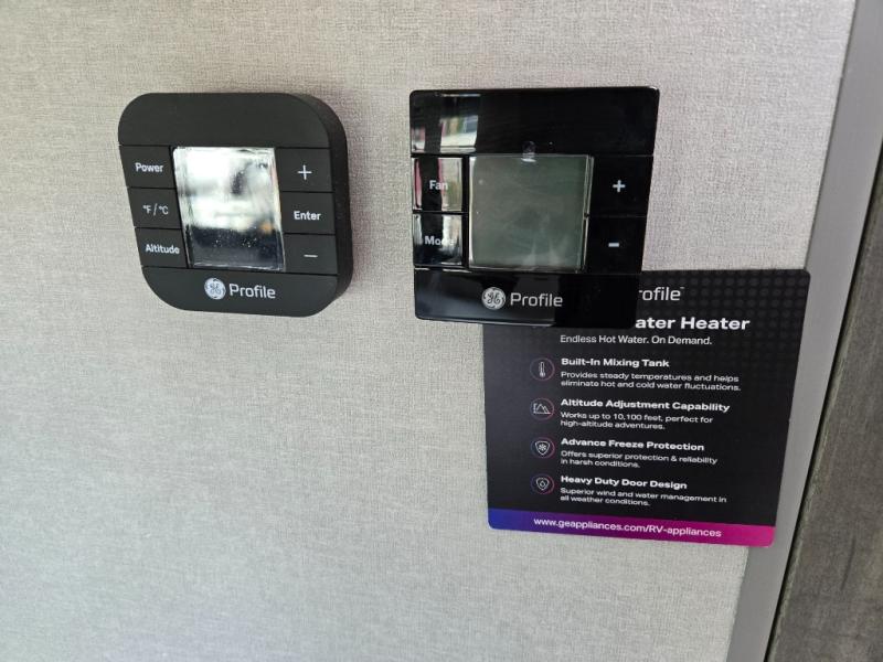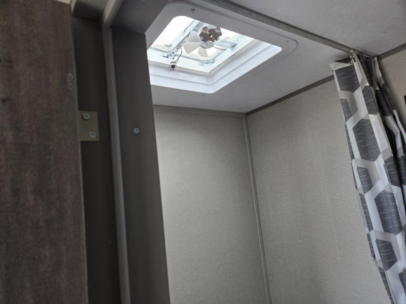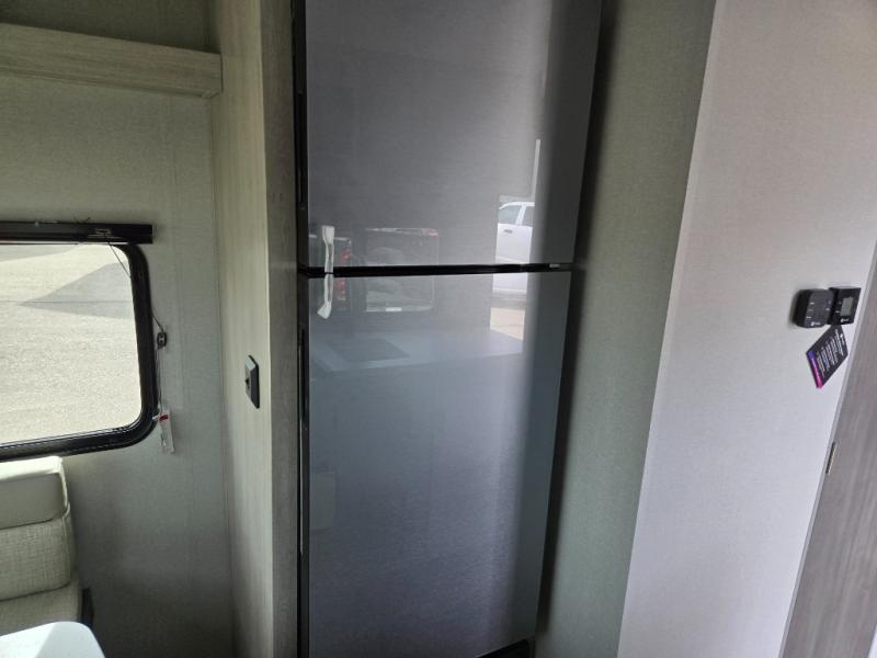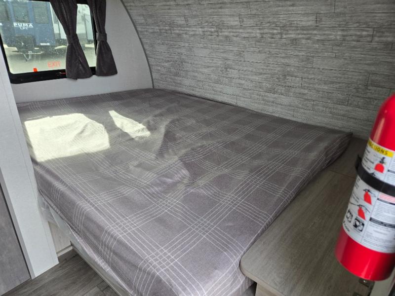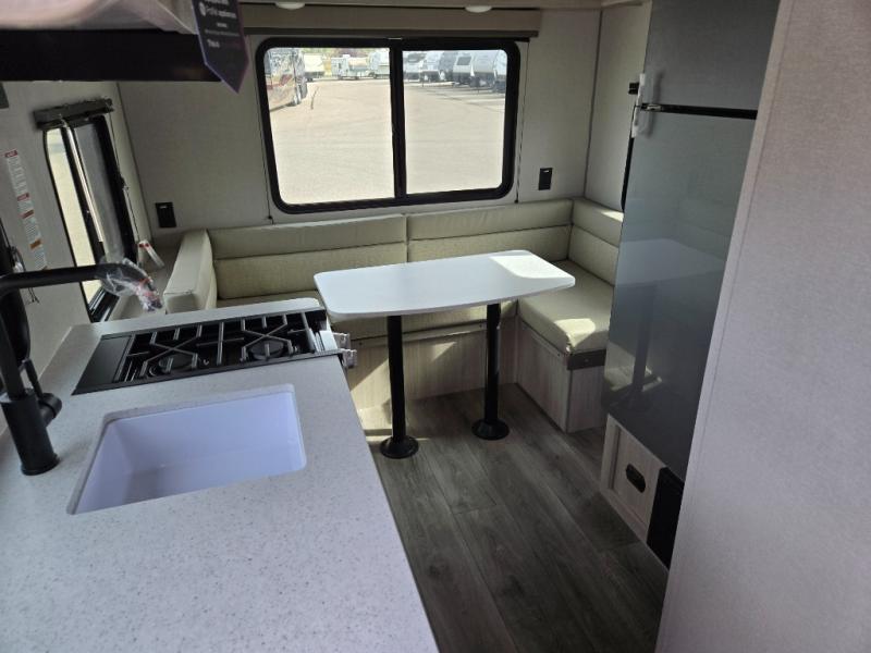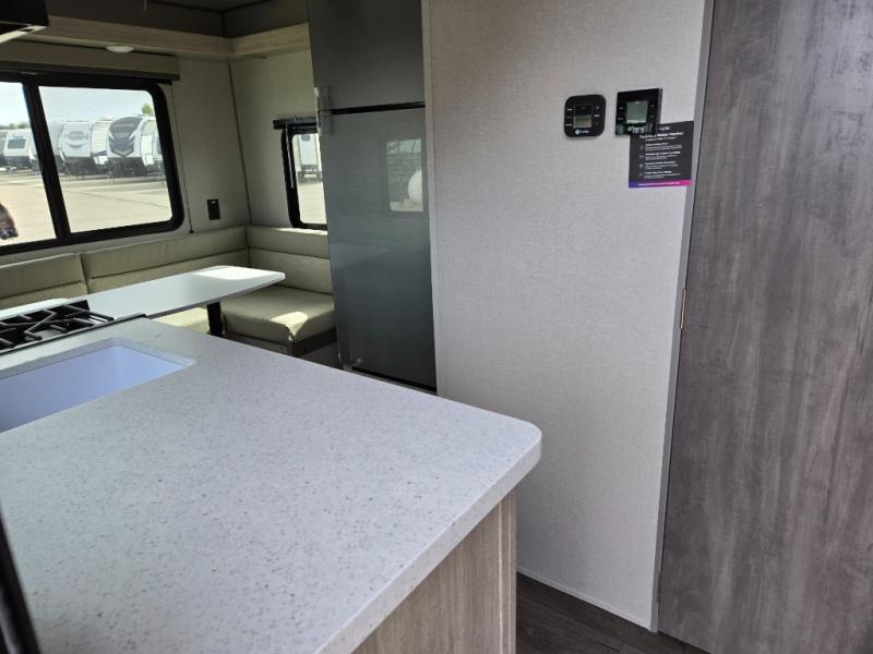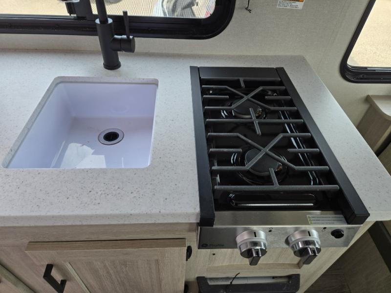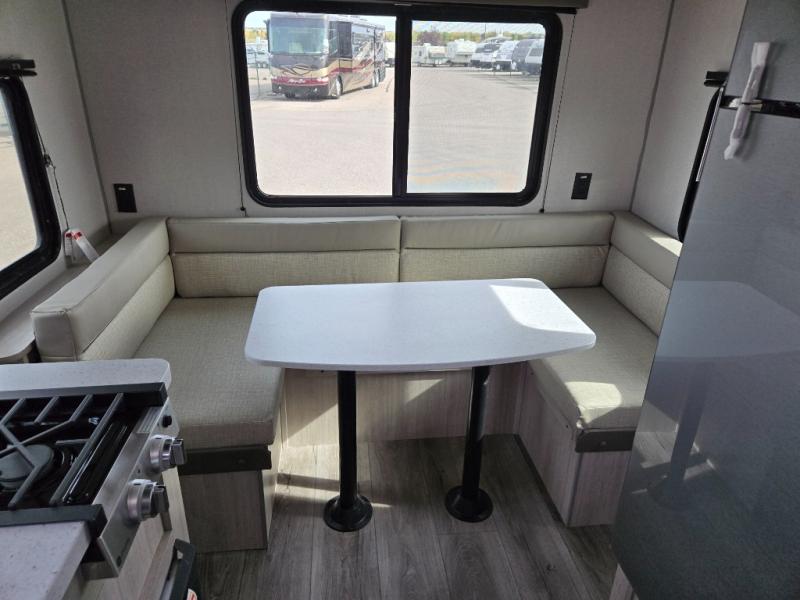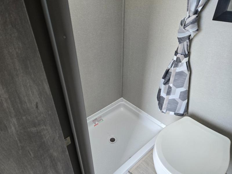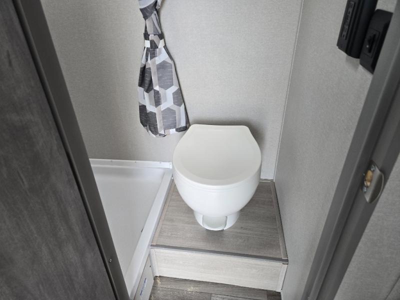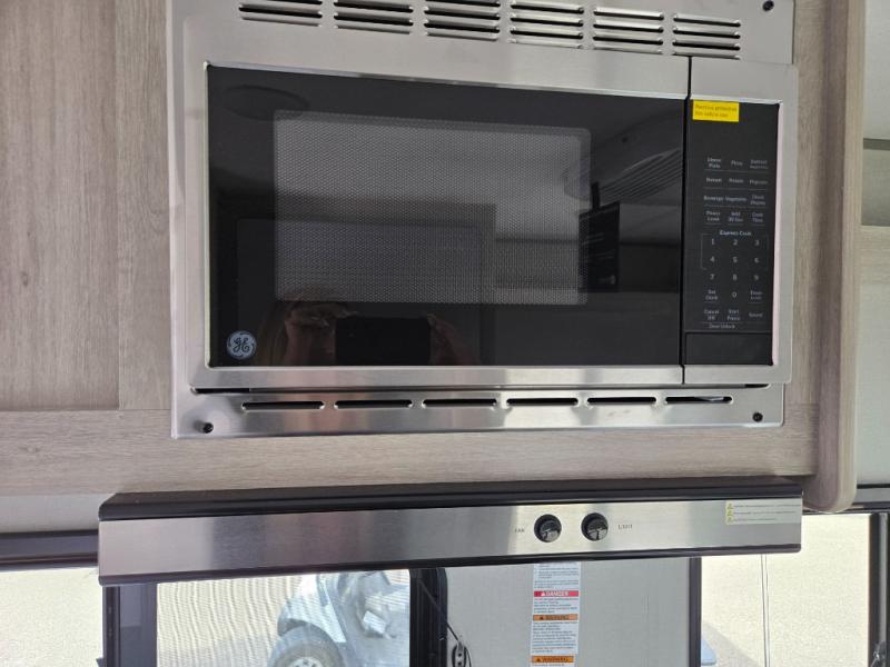 The perfect unit for a cozy weekend retreat for two or three! There is a queen bed up front with overhead storage and more at the foot of the bed to keep your things tidy. The rear of the unit offers a U-shaped dinette with an end table on one end and a handy overhead shelf which is a great spot for meals, watching TV or playing cards and games. A mid-coach bath includes a 36" x 30" shower and toilet with foot flush, plus a storage shelf for necessities. This model also includes a GE two burner cooktop, a GE stainless microwave oven, plus a 3.3 cu. ft. 12V refrigerator to keep food fresh!