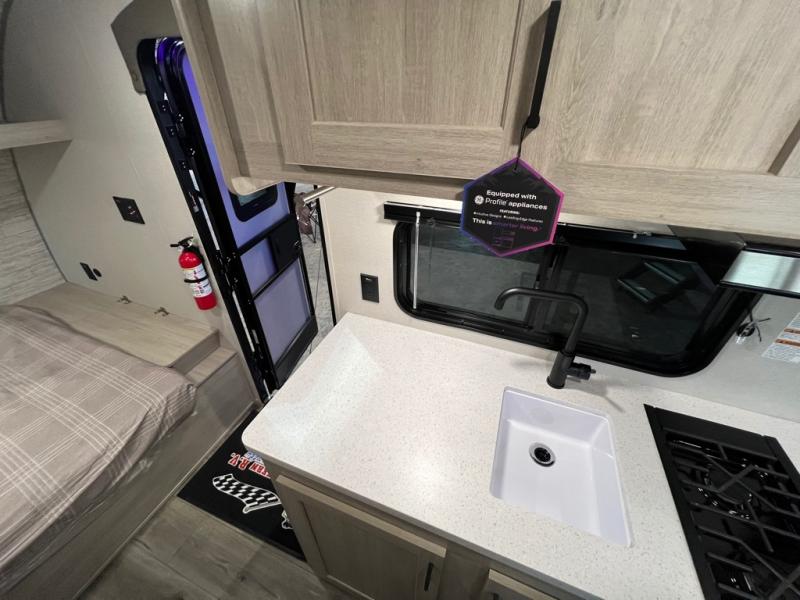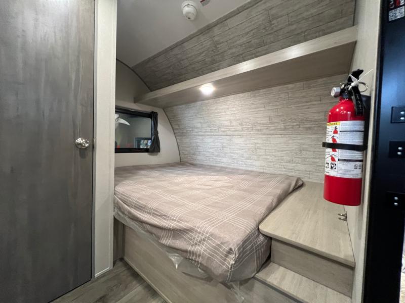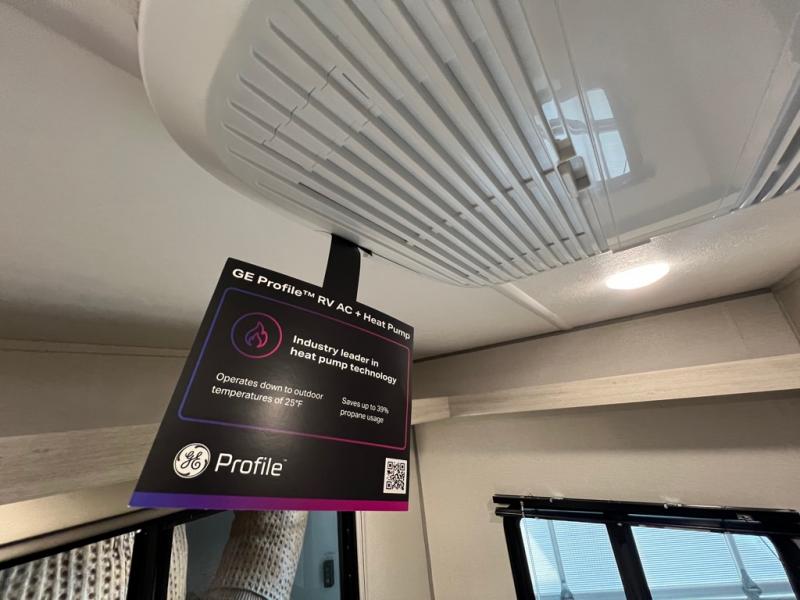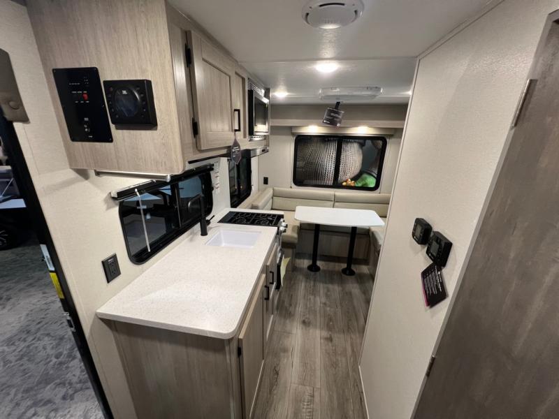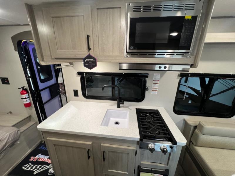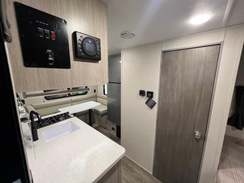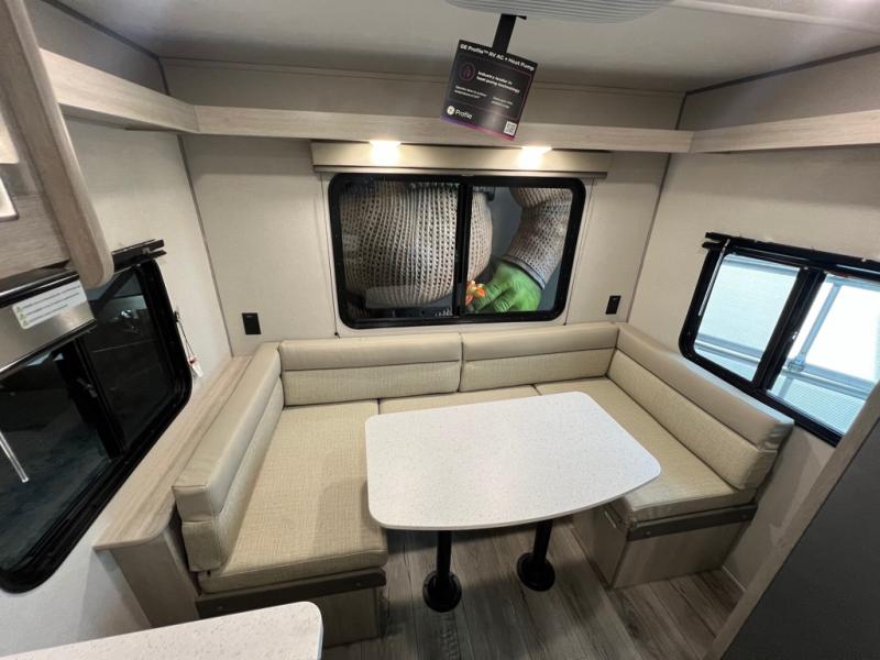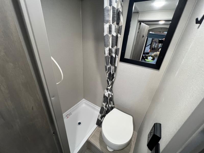 The perfect unit for a cozy weekend retreat for two or three! There is a queen bed up front with overhead storage and more at the foot of the bed to keep your things tidy. The rear of the unit offers a U-shaped dinette with an end table on one end and a handy overhead shelf which is a great spot for meals, watching TV or playing cards and games. A mid-coach bath includes a 36" x 30" shower and toilet with foot flush, plus a storage shelf for necessities. This model also includes a GE two burner cooktop, a GE stainless microwave oven, plus a 3.3 cu. ft. 12V refrigerator to keep food fresh!