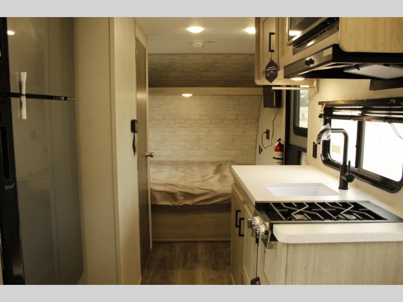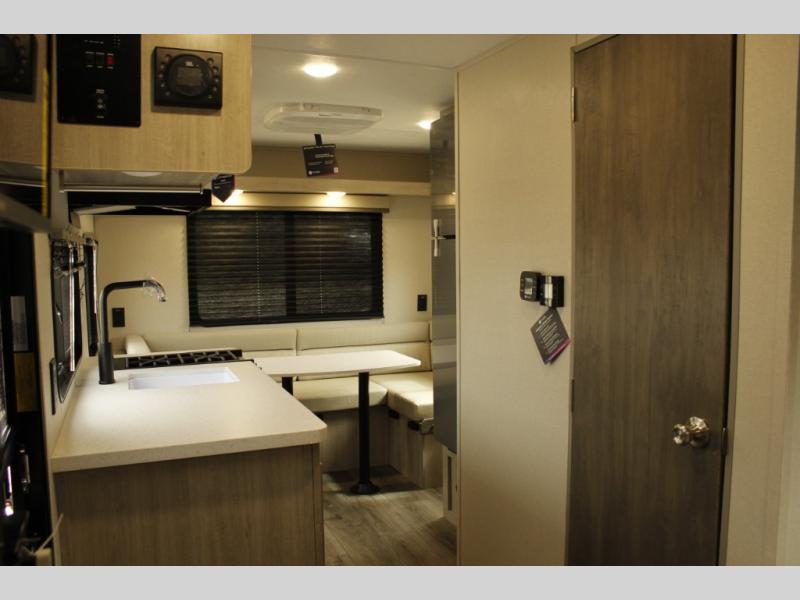 The perfect unit for a cozy weekend retreat for two or three! There is a queen bed up front with overhead storage and more at the foot of the bed to keep your things tidy. The rear of the unit offers a U-shaped dinette that is great for watching TV or playing cards and games, plus it has an end table and a handy overhead shelf. A mid-coach bath includes a 36" x 30" shower and toilet with foot flush, and a mirror. This model also includes a GE two burner cooktop, a GE stainless microwave oven, plus a 3.3 cu. ft. 12V refrigerator to keep food fresh!