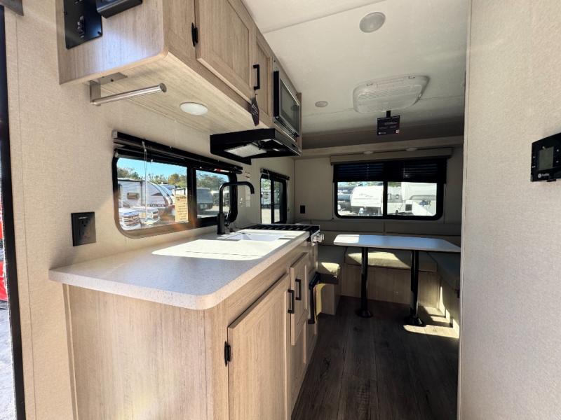 This 7-foot wide-body trailer is ideal for SUV and light-truck owners. The "RD" in its name stands for Rear Dinette, a floorplan that offers a grand view of your campsite through large, wrap-around windows. It provides a comfortable living space that easily converts into additional sleeping quarters.