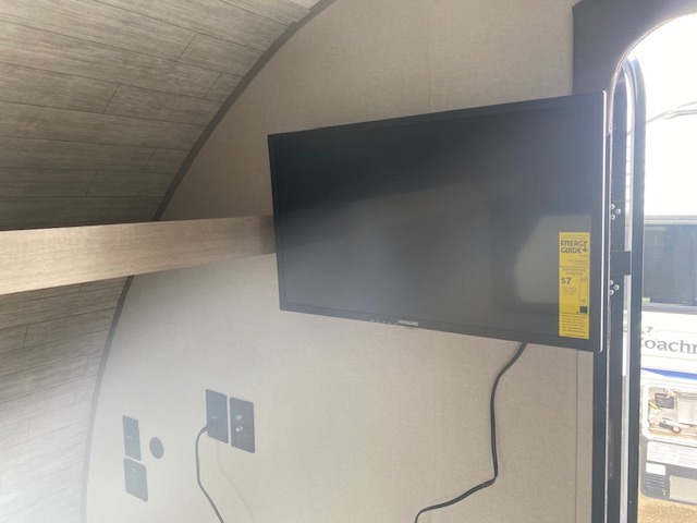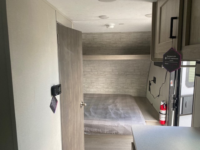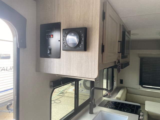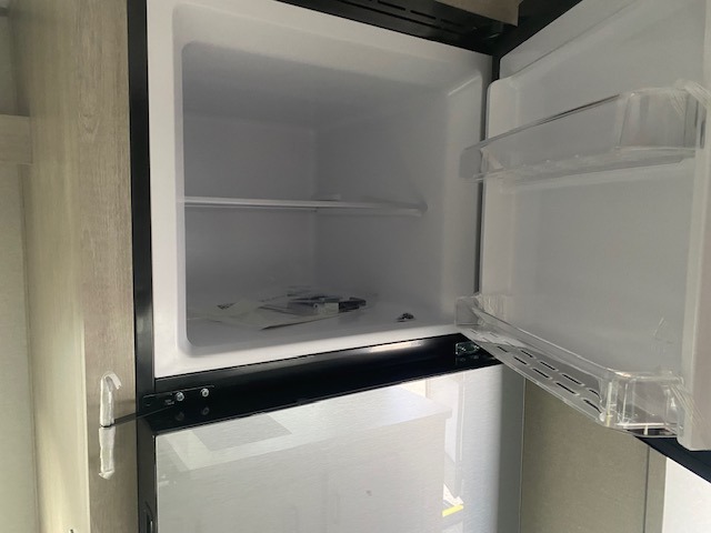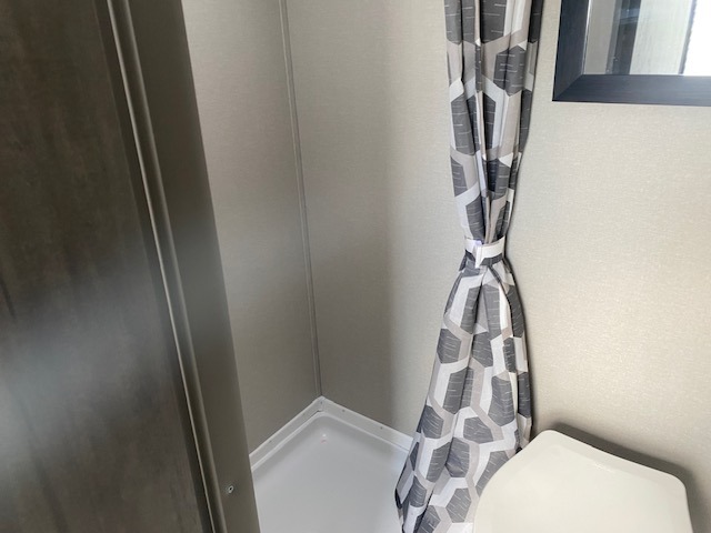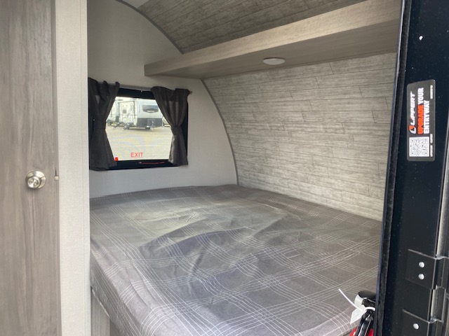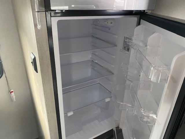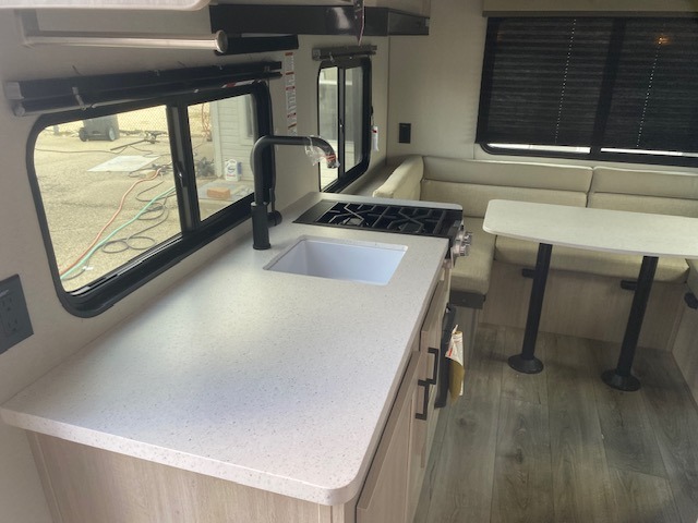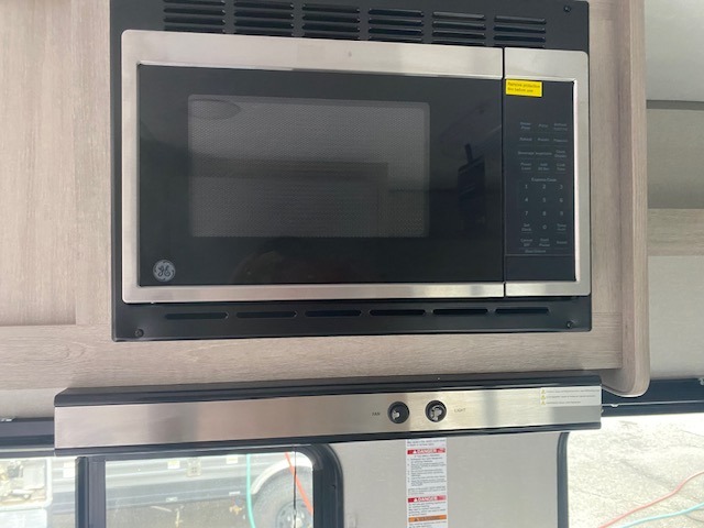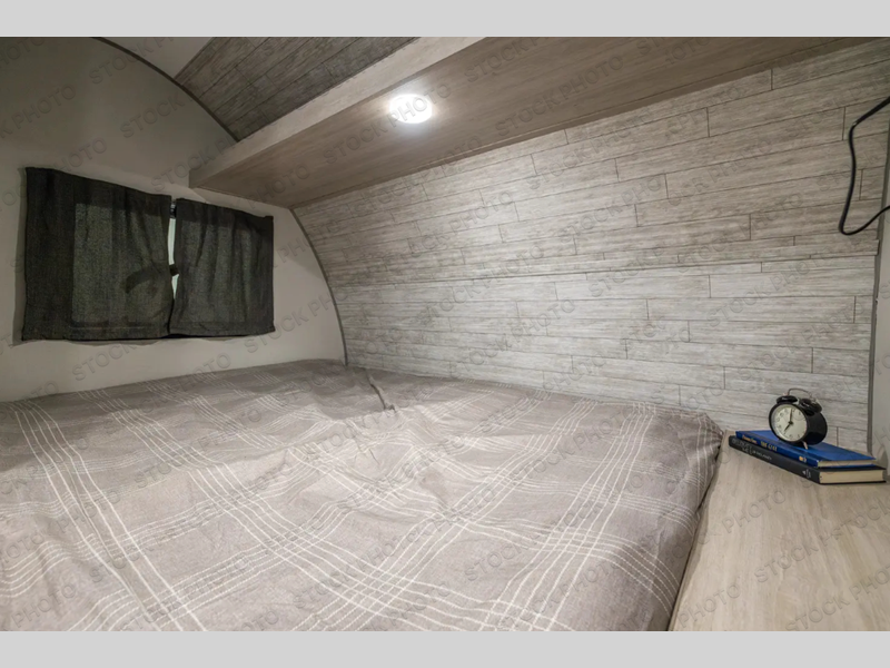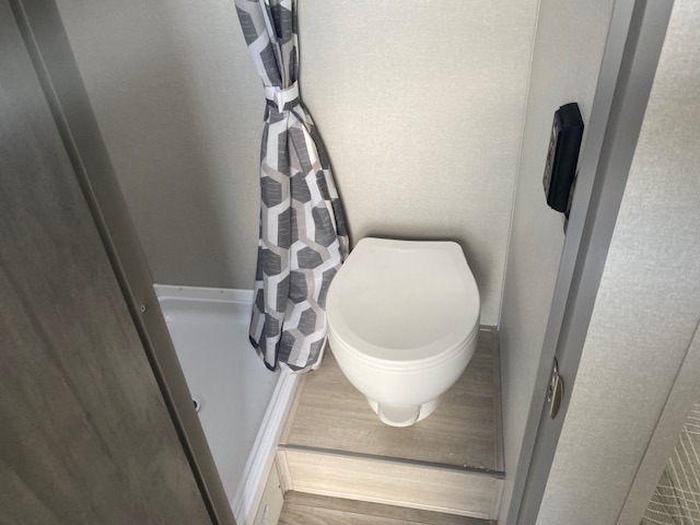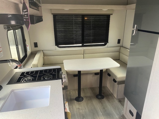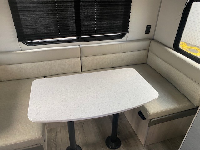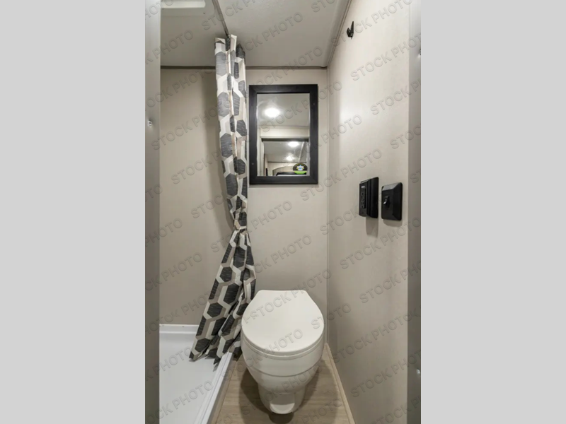 The perfect unit for a cozy weekend retreat for two or three! There is a queen bed up front with overhead storage and more at the foot of the bed to keep your things tidy. The rear of the unit offers a U-shaped dinette that is great for watching TV or playing cards and games, plus it has an end table and a handy overhead shelf. A mid-coach bath includes a 36" x 30" shower and toilet with foot flush, and a mirror. This model also includes a GE two burner cooktop, a GE stainless microwave oven, plus a 3.3 cu. ft. 12V refrigerator to keep food fresh!