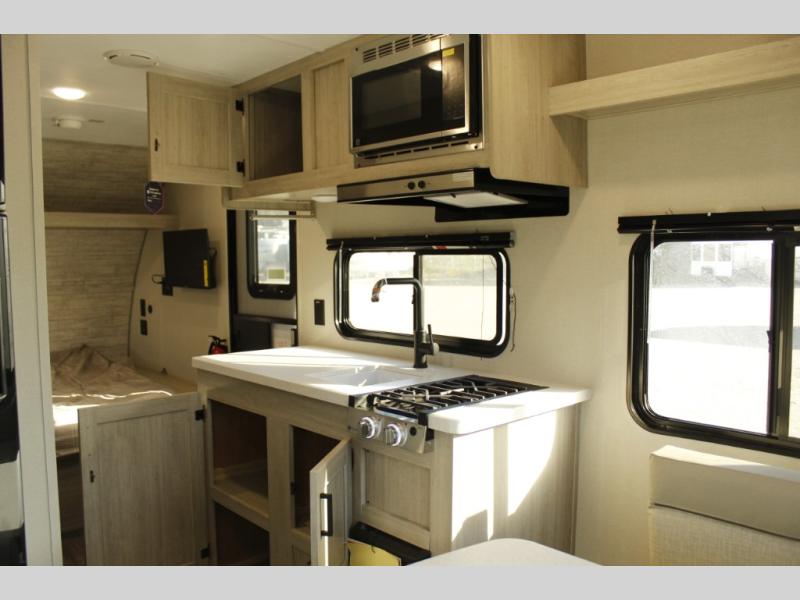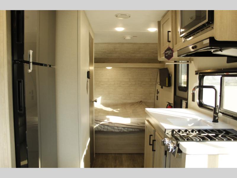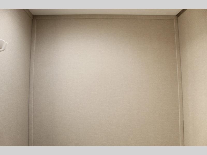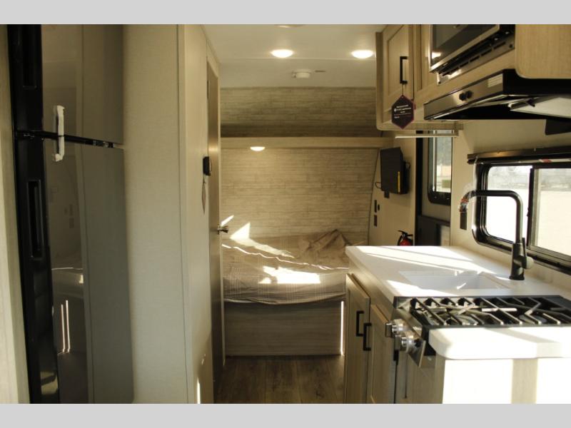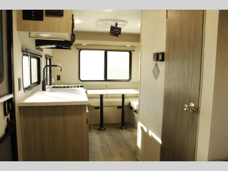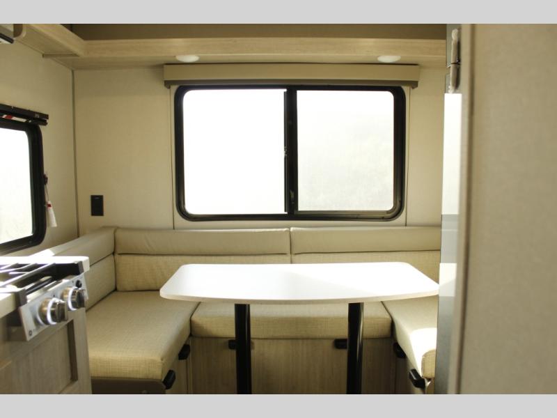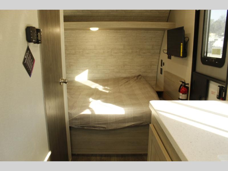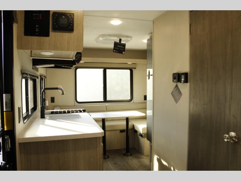 The perfect unit for a cozy weekend retreat for two or three! There is a queen bed up front with overhead storage and more at the foot of the bed to keep your things tidy. The rear of the unit offers a U-shaped dinette that is great for watching TV or playing cards and games, plus it has an end table and a handy overhead shelf. A mid-coach bath includes a 36" x 30" shower and toilet with foot flush, and a mirror. This model also includes a GE two burner cooktop, a GE stainless microwave oven, plus a 3.3 cu. ft. 12V refrigerator to keep food fresh!